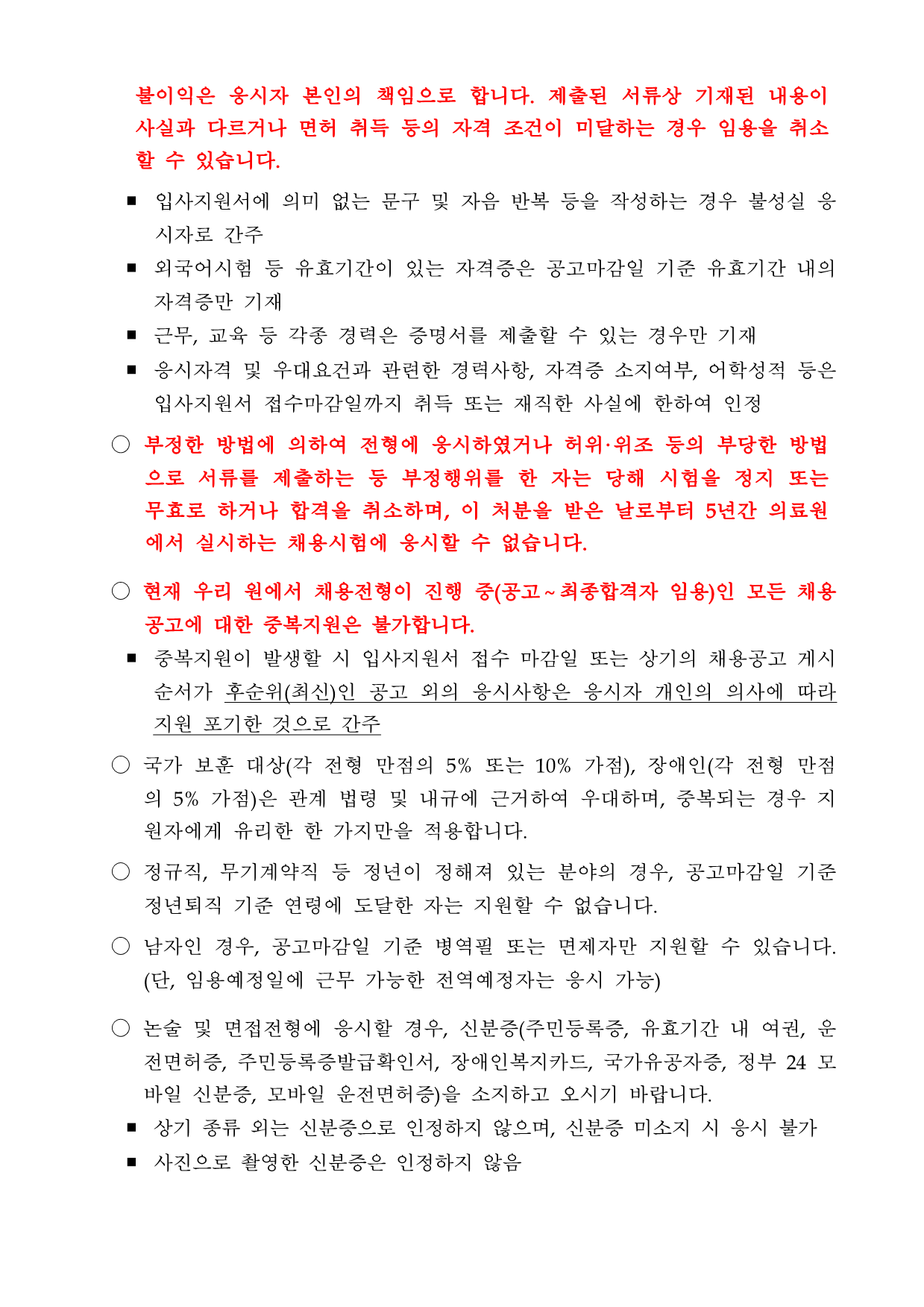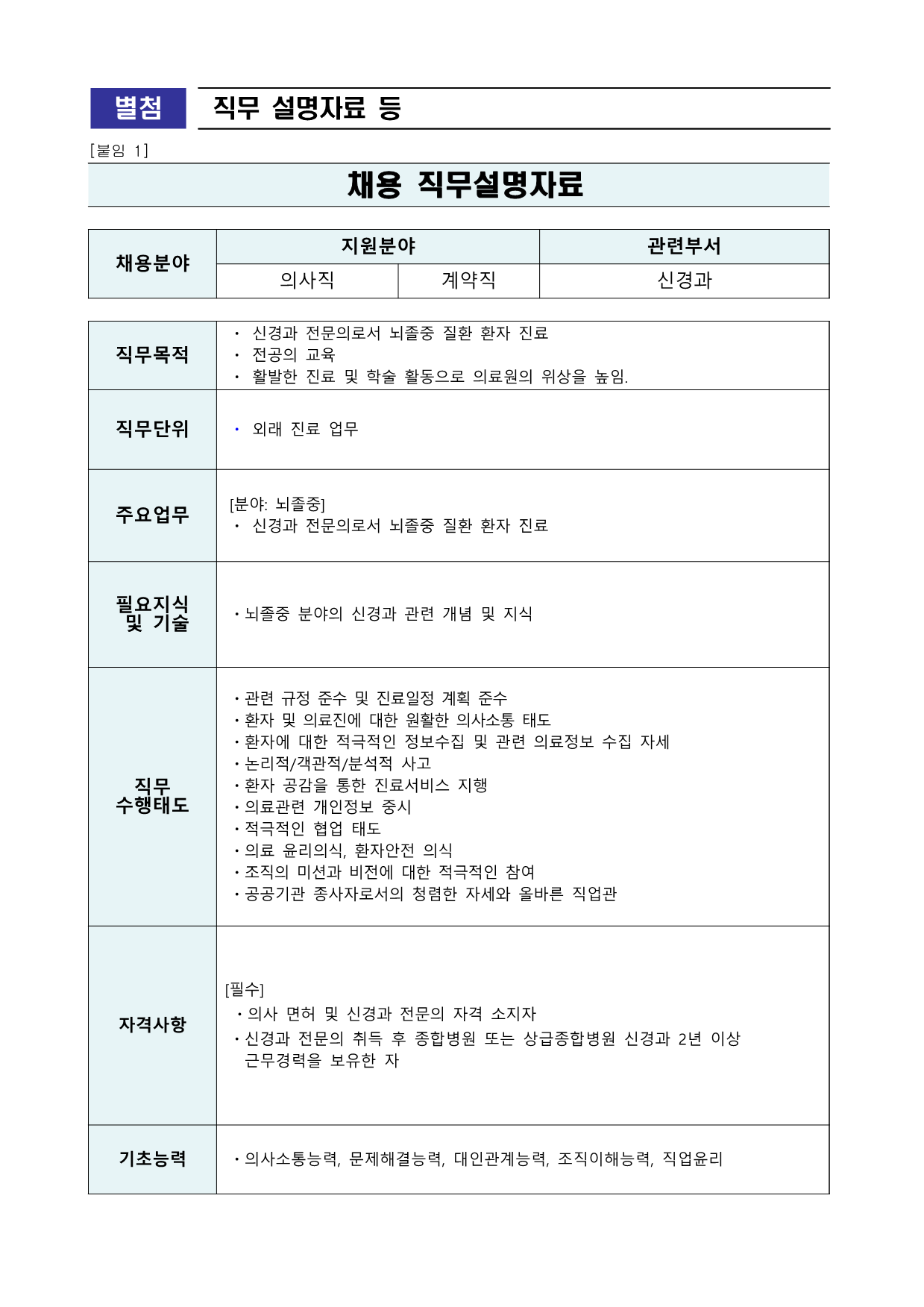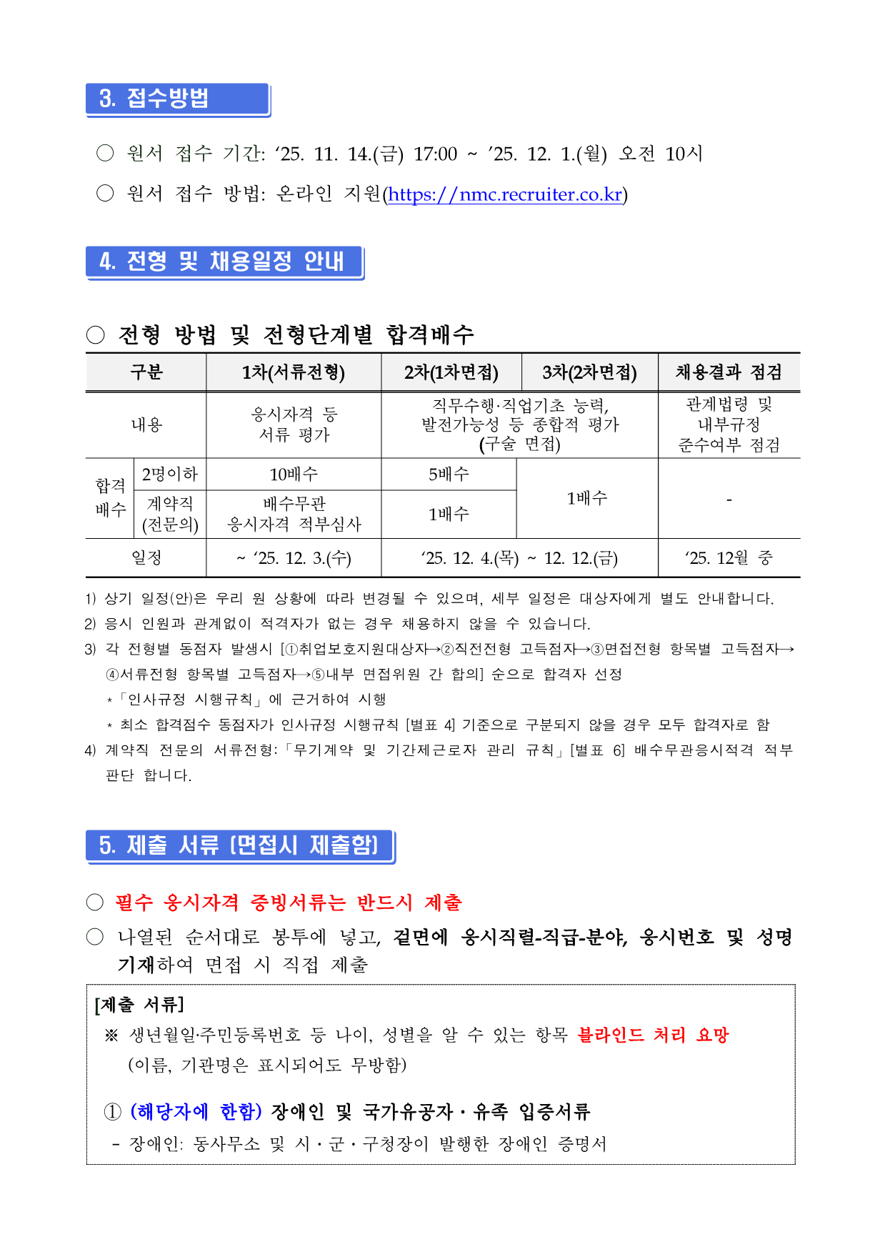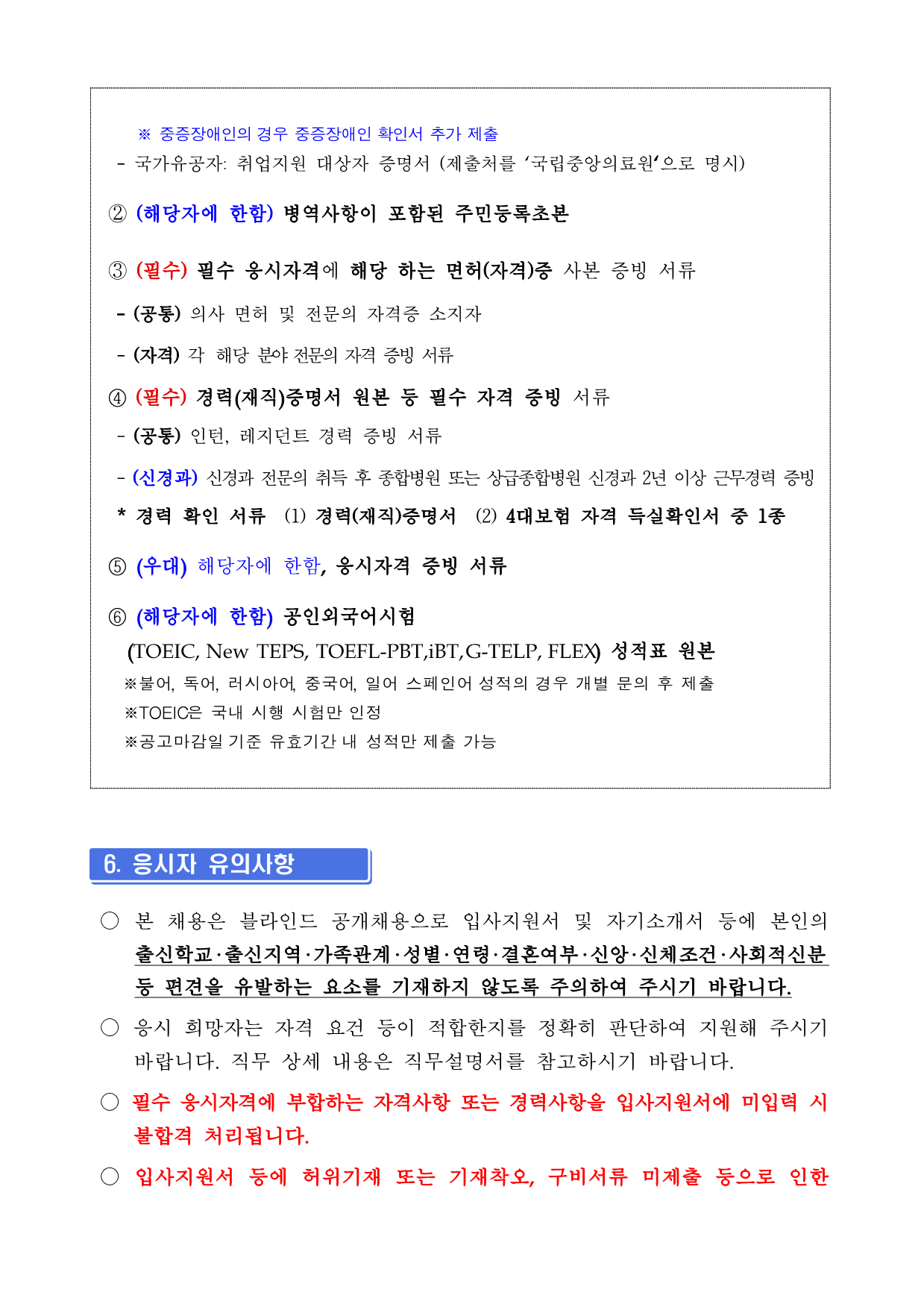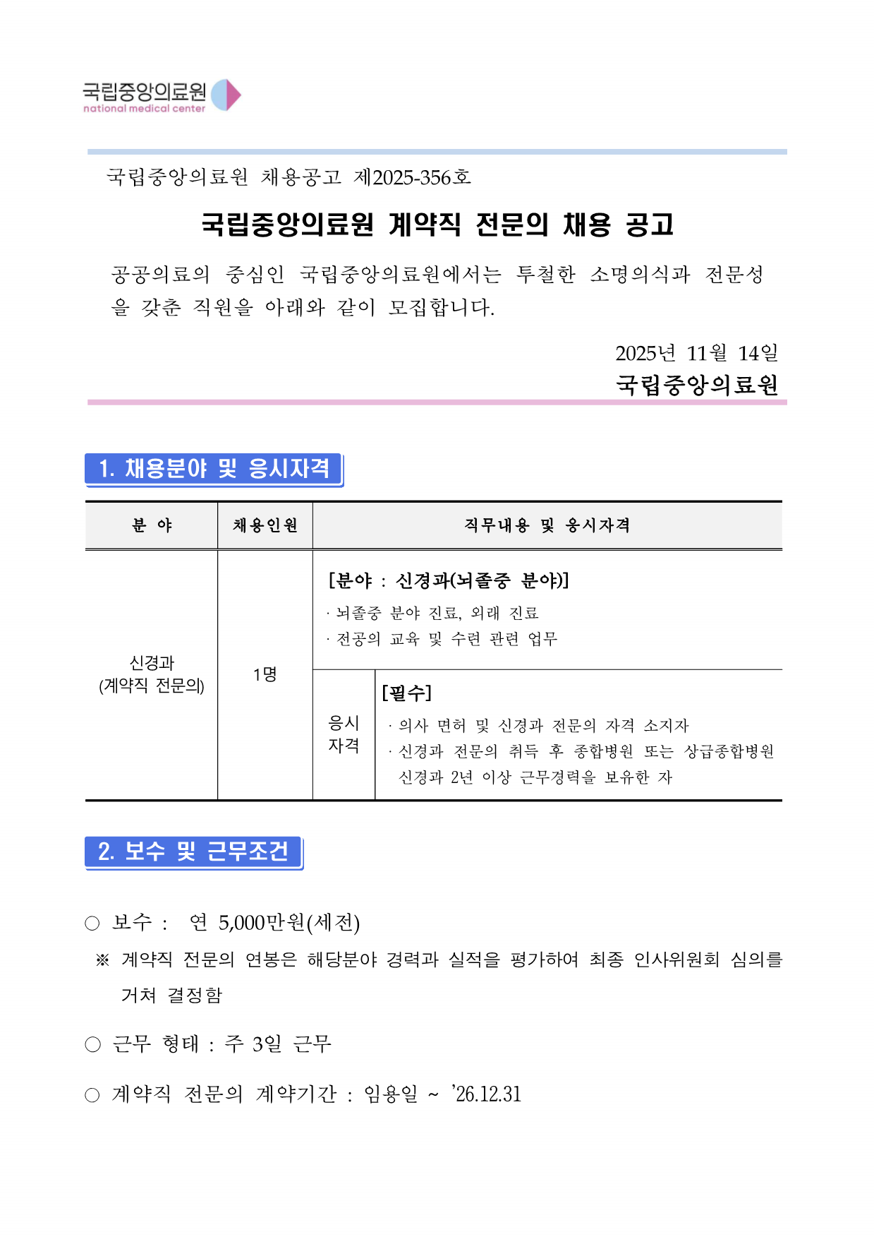±¹¸³Áß¾ÓÀÇ·á¿ø ä¿ë°ø°í Á¦2025-356È£ ±¹¸³Áß¾ÓÀÇ·á¿ø °è¾àÁ÷ Àü¹®ÀÇ Ã¤¿ë °ø°í °ø°øÀÇ·áÀÇ Áß½ÉÀÎ ±¹¸³Áß¾ÓÀÇ·á¿ø¿¡¼´Â ÅõöÇÑ ¼Ò¸íÀǽİú Àü¹®¼ºÀ» °®Ãá Á÷¿øÀ» ¾Æ·¡¿Í °°ÀÌ ¸ðÁýÇÕ´Ï´Ù. 2025³â 11¿ù 14Àϱ¹¸³Áß¾ÓÀÇ·á¿ø1. ä¿ëºÐ¾ß ¹× ÀÀ½ÃÀÚ°Ý 2. º¸¼ö ¹× ±Ù¹«Á¶°Ç ¡Û º¸¼ö : ¿¬ 5,000¸¸¿ø(¼¼Àü) ¡Ø °è¾àÁ÷ Àü¹®ÀÇ ¿¬ºÀÀº ÇØ´çºÐ¾ß °æ·Â°ú ½ÇÀûÀ» Æò°¡ÇÏ¿© ÃÖÁ¾ ÀλçÀ§¿øÈ¸ ½ÉÀǸ¦°ÅÃÄ °áÁ¤ÇÔ ¡Û ±Ù¹« ÇüÅ : ÁÖ 3ÀÏ ±Ù¹« ¡Û °è¾àÁ÷ Àü¹®ÀÇ °è¾à±â°£ : ÀÓ¿ëÀÏ ~ '26.12.31 ºÐ ¾ß ä¿ëÀοø Á÷¹«³»¿ë ¹× ÀÀ½ÃÀÚ°Ý ½Å°æ°ú (°è¾àÁ÷ Àü¹®ÀÇ) 1¸í [ºÐ¾ß : ½Å°æ°ú(³úÁ¹Áß ºÐ¾ß)] ¤ý³úÁ¹Áß ºÐ¾ß Áø·á, ¿Ü·¡ Áø·á ¤ýÀü°øÀÇ ±³À° ¹× ¼ö·Ã °ü·Ã ¾÷¹« ÀÀ½Ã ÀÚ°Ý [Çʼö] ¤ýÀÇ»ç ¸éÇã ¹× ½Å°æ°ú Àü¹®ÀÇ ÀÚ°Ý ¼ÒÁöÀÚ ¤ý½Å°æ°ú Àü¹®ÀÇ Ãëµæ ÈÄ Á¾ÇÕº´¿ø ¶Ç´Â »ó±ÞÁ¾ÇÕº´¿ø ½Å°æ°ú 2³â ÀÌ»ó ±Ù¹«°æ·ÂÀ» º¸À¯ÇÑ ÀÚ