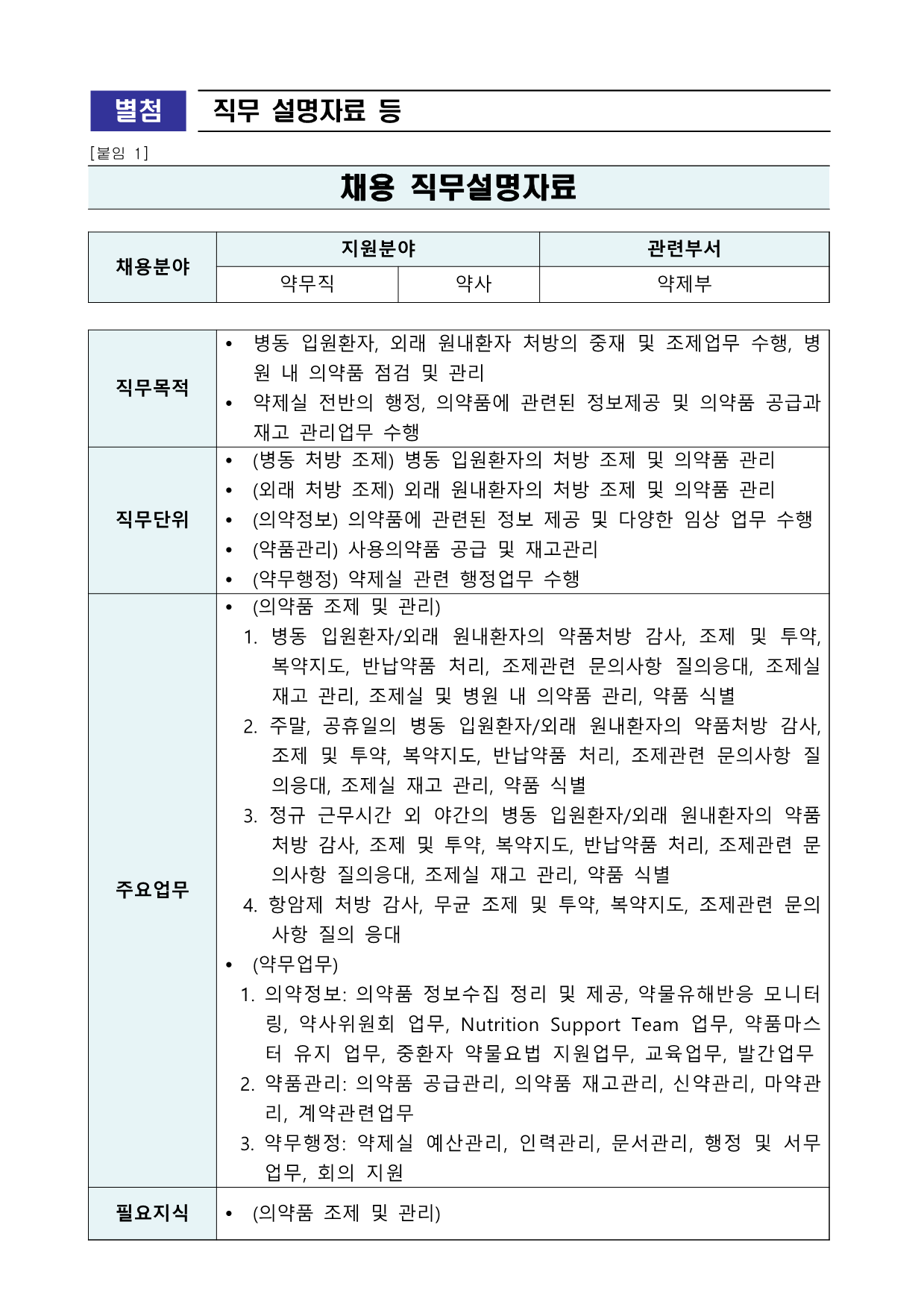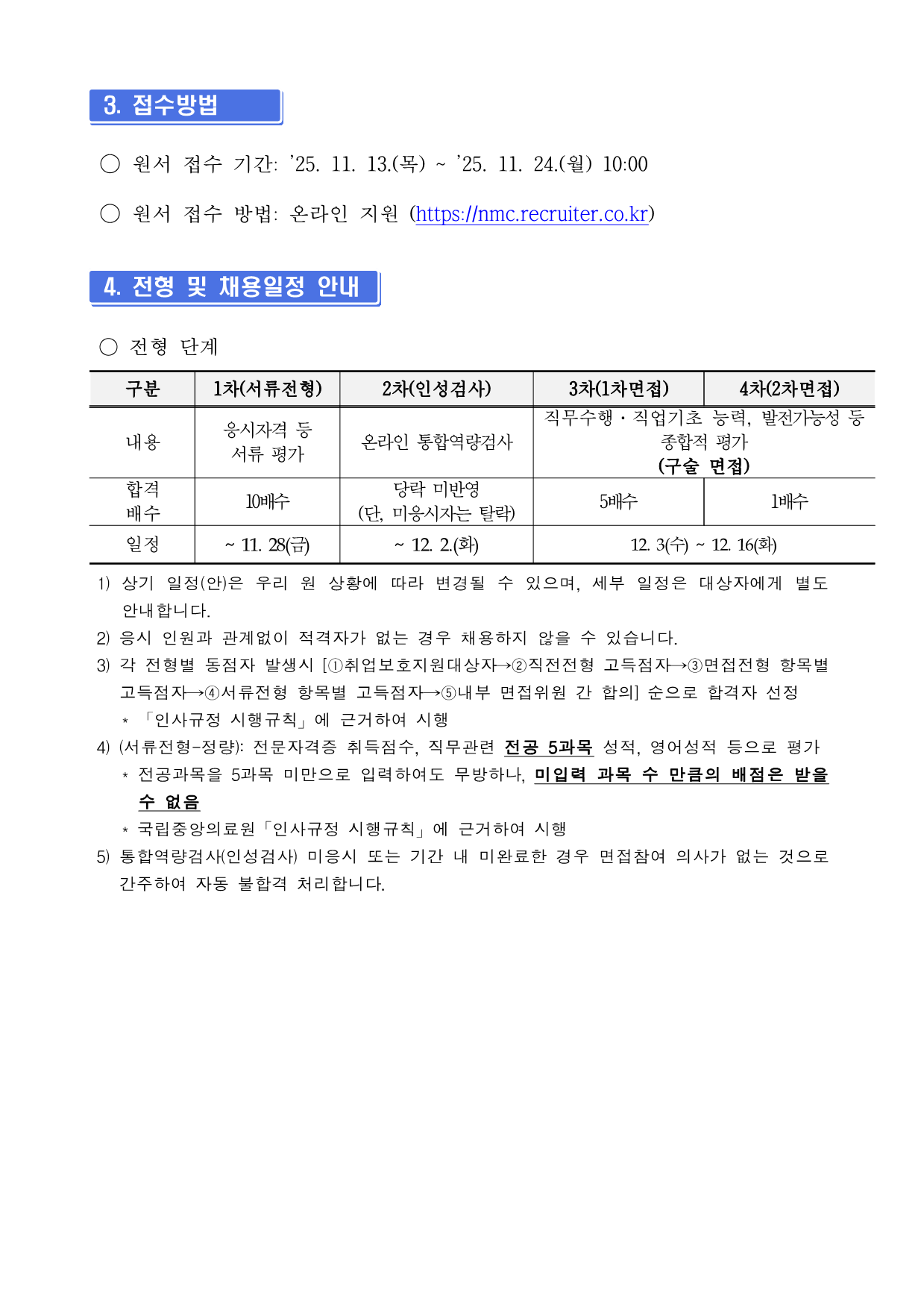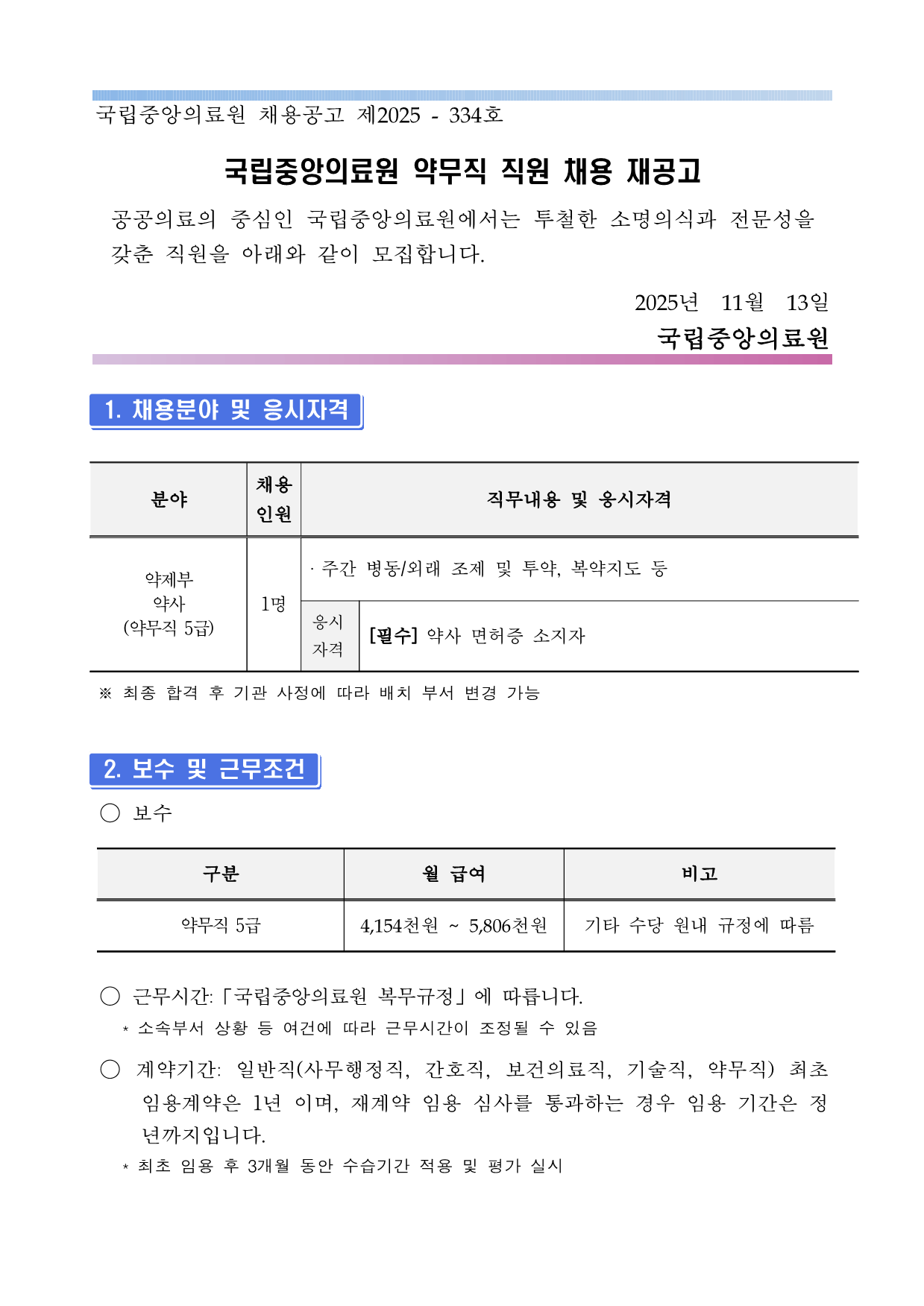 ±¹¸³Áß¾ÓÀÇ·á¿ø ä¿ë°ø°í Á¦2025 - 334È£ ±¹¸³Áß¾ÓÀÇ·á¿ø ¾à¹«Á÷ Á÷¿ø ä¿ë Àç°ø°í °ø°øÀÇ·áÀÇ Áß½ÉÀÎ ±¹¸³Áß¾ÓÀÇ·á¿ø¿¡¼´Â ÅõöÇÑ ¼Ò¸íÀǽİú Àü¹®¼ºÀ»°®Ãá Á÷¿øÀ» ¾Æ·¡¿Í °°ÀÌ ¸ðÁýÇÕ´Ï´Ù. 2025³â 11¿ù 13Àϱ¹¸³Áß¾ÓÀÇ·á¿ø1. ä¿ëºÐ¾ß ¹× ÀÀ½ÃÀÚ°Ý ºÐ¾ß ä¿ë Àοø Á÷¹«³»¿ë ¹× ÀÀ½ÃÀÚ°Ý ¾àÁ¦ºÎ ¾à»ç (¾à¹«Á÷ 5±Þ) 1¸í ¤ýÁÖ°£ º´µ¿/¿Ü·¡ Á¶Á¦ ¹× Åõ¾à, º¹¾àÁöµµ µî ÀÀ½Ã ÀÚ°Ý [Çʼö] ¾à»ç ¸éÇãÁõ ¼ÒÁöÀÚ ¡Ø ÃÖÁ¾ ÇÕ°Ý ÈÄ ±â°ü »çÁ¤¿¡ µû¶ó ¹èÄ¡ ºÎ¼ º¯°æ °¡´É 2. º¸¼ö ¹× ±Ù¹«Á¶°Ç ¡Û º¸¼ö ±¸ºÐ ¿ù ±Þ¿© ºñ°í ¾à¹«Á÷ 5±Þ 4,154õ¿ø ~ 5,806õ¿ø ±âŸ ¼ö´ç ¿ø³» ±ÔÁ¤¿¡ µû¸§¡Û ±Ù¹«½Ã°£:¡¸±¹¸³Áß¾ÓÀÇ·á¿ø º¹¹«±ÔÁ¤¡¹¿¡ µû¸¨´Ï´Ù. * ¼Ò¼ÓºÎ¼ »óȲ µî ¿©°Ç¿¡ µû¶ó ±Ù¹«½Ã°£ÀÌ Á¶Á¤µÉ ¼ö ÀÖÀ½ ¡Û °è¾à±â°£: ÀϹÝÁ÷(»ç¹«ÇàÁ¤Á÷, °£È£Á÷, º¸°ÇÀÇ·áÁ÷, ±â¼úÁ÷, ¾à¹«Á÷) ÃÖÃÊ ÀÓ¿ë°è¾àÀº 1³â À̸ç, Àç°è¾à ÀÓ¿ë ½É»ç¸¦ Åë°úÇÏ´Â °æ¿ì ÀÓ¿ë ±â°£Àº Á¤³â±îÁöÀÔ´Ï´Ù. * ÃÖÃÊ ÀÓ¿ë ÈÄ 3°³¿ù µ¿¾È ¼ö½À±â°£ Àû¿ë ¹× Æò°¡ ½Ç½Ã