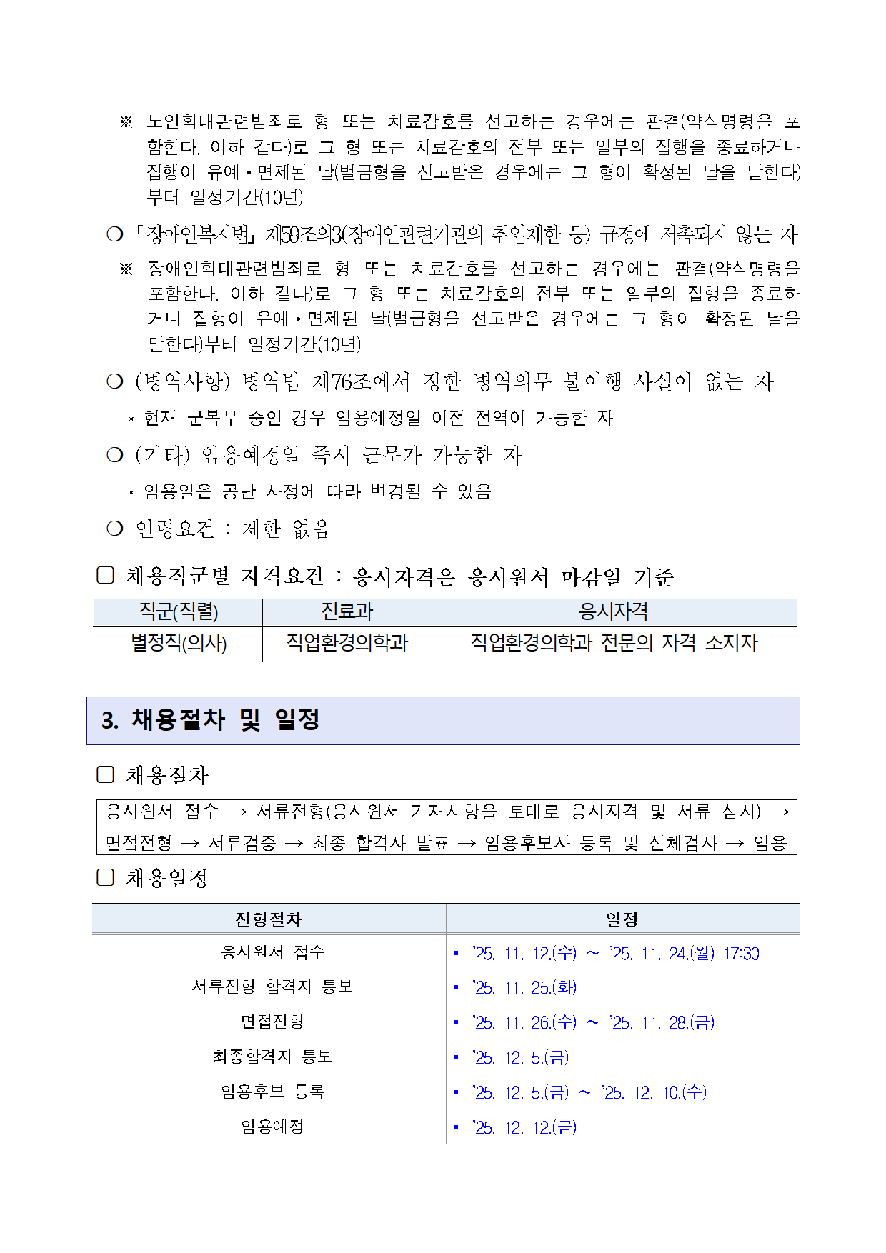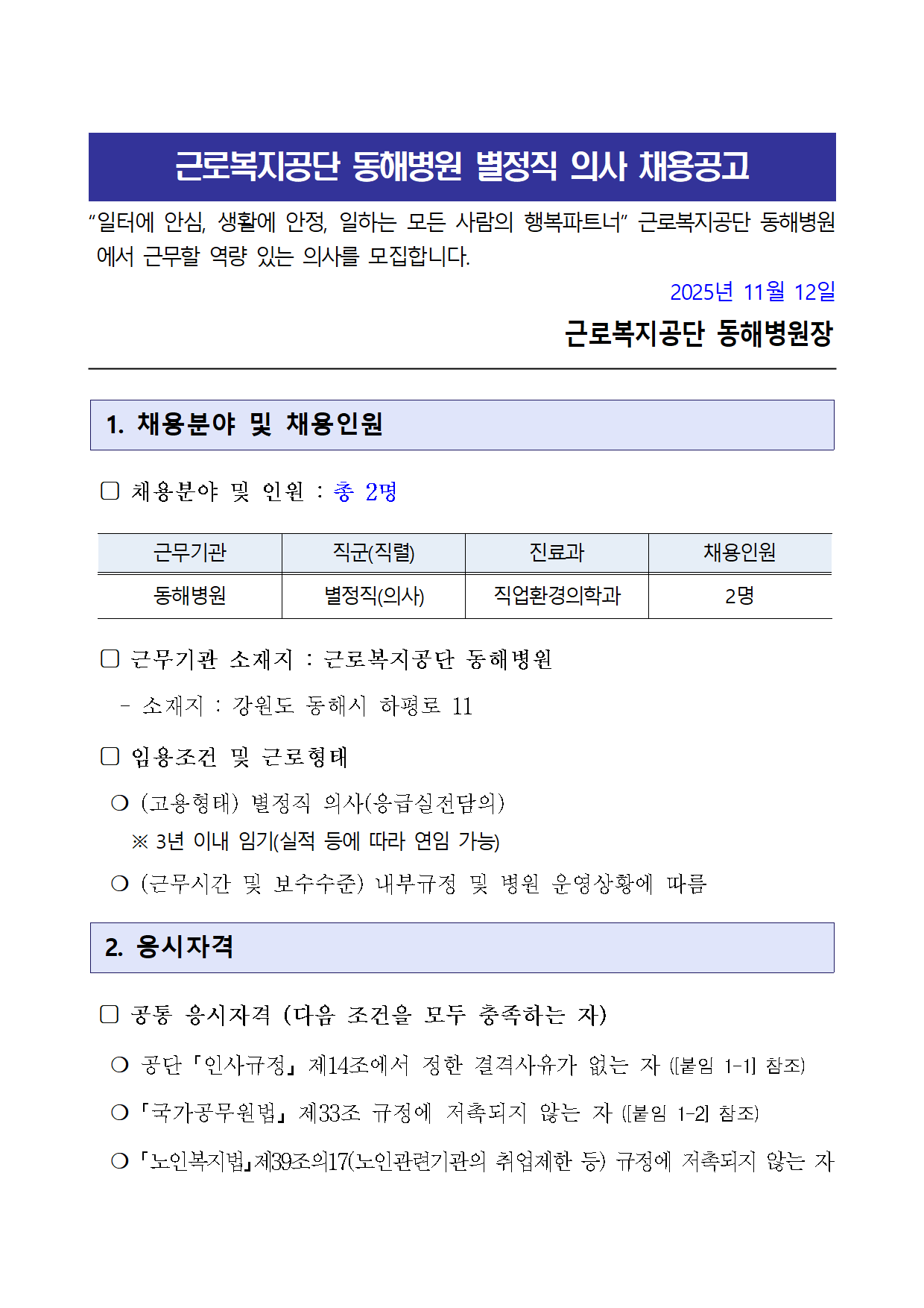 ±Ù·Îº¹Áö°ø´Ü µ¿Çغ´¿ø º°Á¤Á÷ ÀÇ»ç ä¿ë°ø°í ¡°ÀÏÅÍ¿¡ ¾È½É, »ýȰ¿¡ ¾ÈÁ¤, ÀÏÇÏ´Â ¸ðµç »ç¶÷ÀÇ ÇູÆÄÆ®³Ê¡± ±Ù·Îº¹Áö°ø´Ü µ¿Çغ´¿ø ¿¡¼ ±Ù¹«ÇÒ ¿ª·® ÀÖ´Â Àǻ縦 ¸ðÁýÇÕ´Ï´Ù. 2025³â 11¿ù 12ÀÏ ±Ù·Îº¹Áö°ø´Ü µ¿Çغ´¿øÀå 1. ä¿ëºÐ¾ß ¹× ä¿ëÀοø ▢ ä¿ëºÐ¾ß ¹× Àοø : ÃÑ 2¸í ±Ù¹«±â°ü Á÷±º(Á÷·Ä) Áø·á°ú ä¿ëÀοø µ¿Çغ´¿ø º°Á¤Á÷(ÀÇ»ç) Á÷¾÷ȯ°æÀÇÇаú 2¸í ▢ ±Ù¹«±â°ü ¼ÒÀçÁö : ±Ù·Îº¹Áö°ø´Ü µ¿Çغ´¿ø - ¼ÒÀçÁö : °¿øµµ µ¿Çؽà ÇÏÆò·Î 11 ▢ ÀÓ¿ëÁ¶°Ç ¹× ±Ù·ÎÇüÅ ❍ (°í¿ëÇüÅÂ) º°Á¤Á÷ ÀÇ»ç(ÀÀ±Þ½ÇÀü´ãÀÇ) ¡Ø 3³â À̳» ÀÓ±â(½ÇÀû µî¿¡ µû¶ó ¿¬ÀÓ °¡´É) ❍ (±Ù¹«½Ã°£ ¹× º¸¼ö¼öÁØ) ³»ºÎ±ÔÁ¤ ¹× º´¿ø ¿î¿µ»óȲ¿¡ µû¸§