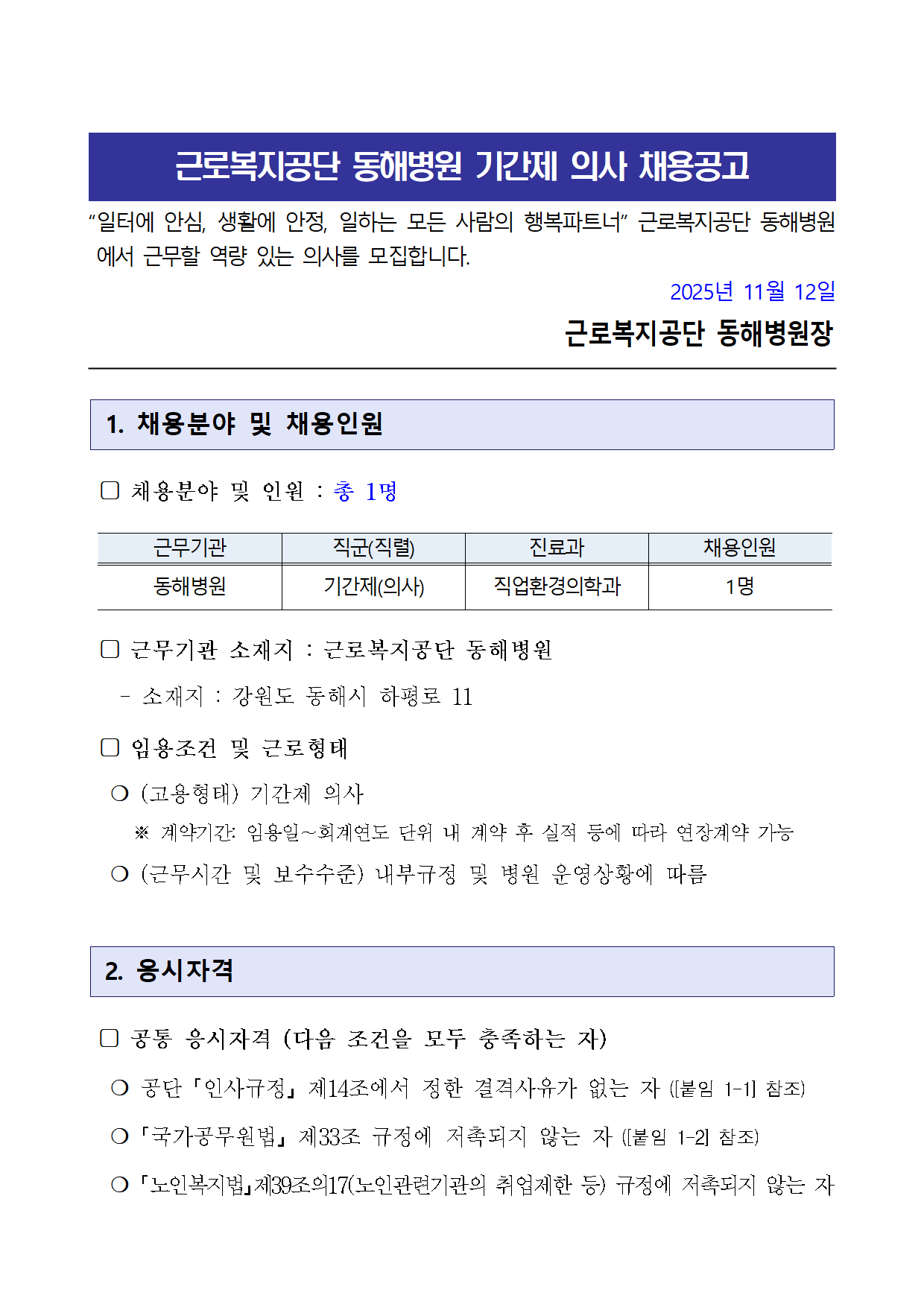 ±Ù·Îº¹Áö°ø´Ü µ¿Çغ´¿ø ±â°£Á¦ ÀÇ»ç ä¿ë°ø°í ¡°ÀÏÅÍ¿¡ ¾È½É, »ýȰ¿¡ ¾ÈÁ¤, ÀÏÇÏ´Â ¸ðµç »ç¶÷ÀÇ ÇູÆÄÆ®³Ê¡± ±Ù·Îº¹Áö°ø´Ü µ¿Çغ´¿ø ¿¡¼ ±Ù¹«ÇÒ ¿ª·® ÀÖ´Â Àǻ縦 ¸ðÁýÇÕ´Ï´Ù. 2025³â 11¿ù 12ÀÏ ±Ù·Îº¹Áö°ø´Ü µ¿Çغ´¿øÀå 1. ä¿ëºÐ¾ß ¹× ä¿ëÀοø ▢ ä¿ëºÐ¾ß ¹× Àοø : ÃÑ 1¸í ±Ù¹«±â°ü Á÷±º(Á÷·Ä) Áø·á°ú ä¿ëÀοø µ¿Çغ´¿ø ±â°£Á¦(ÀÇ»ç) Á÷¾÷ȯ°æÀÇÇаú 1¸í ▢ ±Ù¹«±â°ü ¼ÒÀçÁö : ±Ù·Îº¹Áö°ø´Ü µ¿Çغ´¿ø - ¼ÒÀçÁö : °¿øµµ µ¿Çؽà ÇÏÆò·Î 11 ▢ ÀÓ¿ëÁ¶°Ç ¹× ±Ù·ÎÇüÅ ❍ (°í¿ëÇüÅÂ) ±â°£Á¦ ÀÇ»ç ¡Ø °è¾à±â°£: ÀÓ¿ëÀϡȸ°è¿¬µµ ´ÜÀ§ ³» °è¾à ÈÄ ½ÇÀû µî¿¡ µû¶ó ¿¬Àå°è¾à °¡´É ❍ (±Ù¹«½Ã°£ ¹× º¸¼ö¼öÁØ) ³»ºÎ±ÔÁ¤ ¹× º´¿ø ¿î¿µ»óȲ¿¡ µû¸§