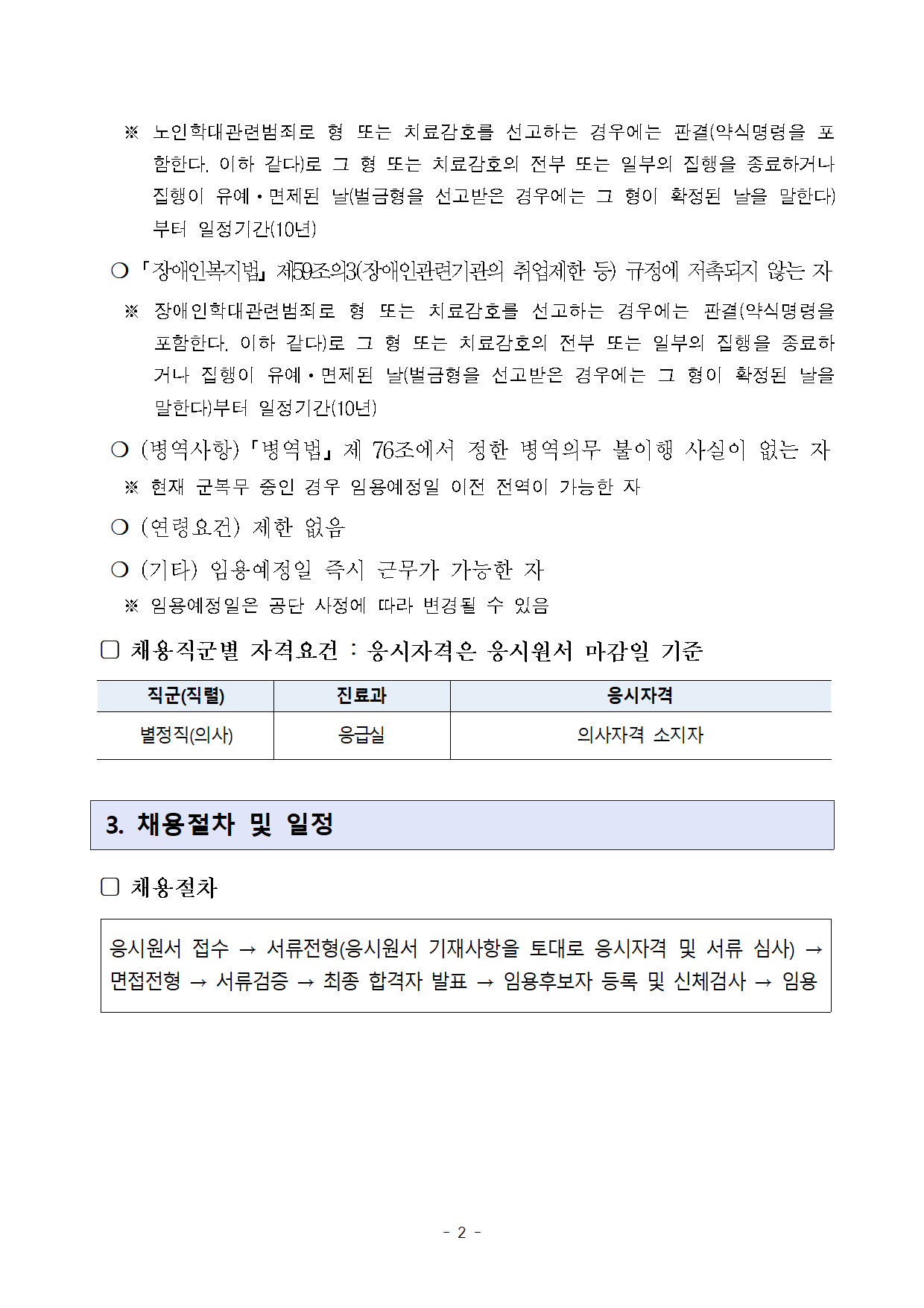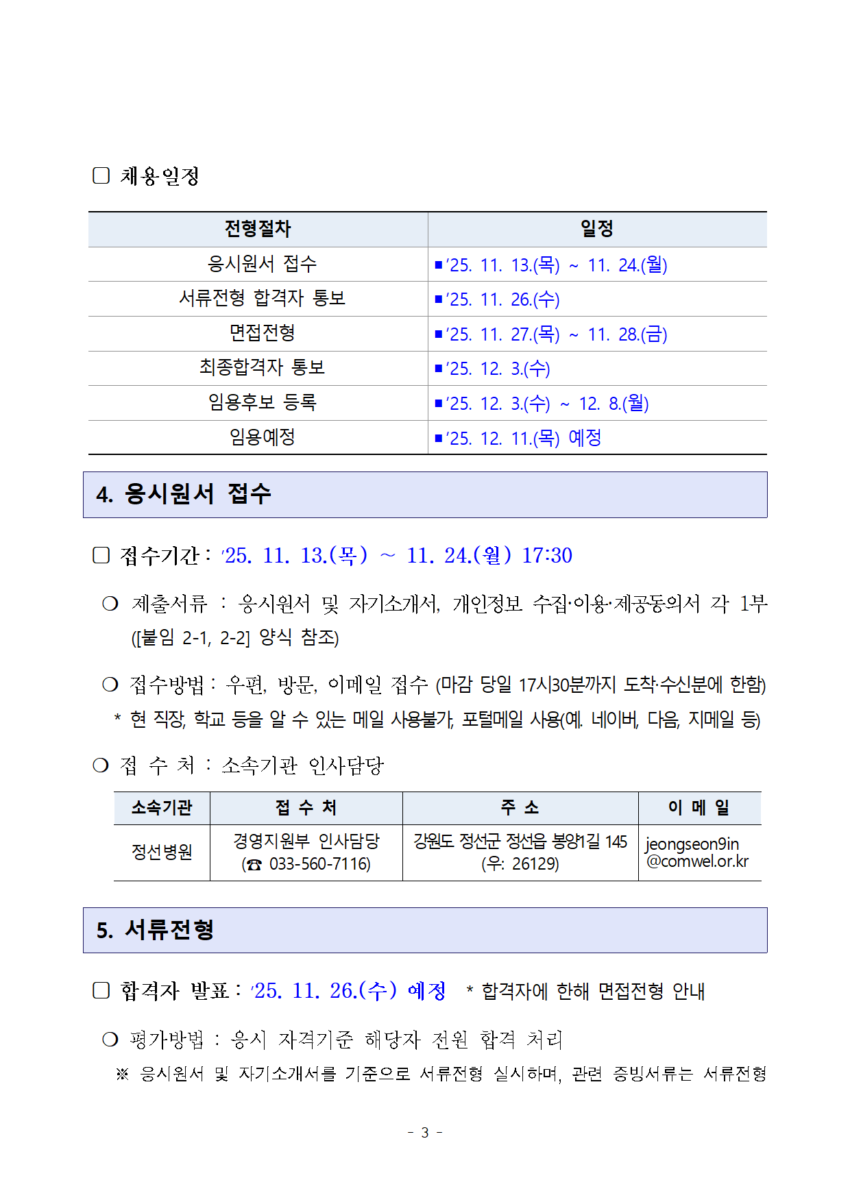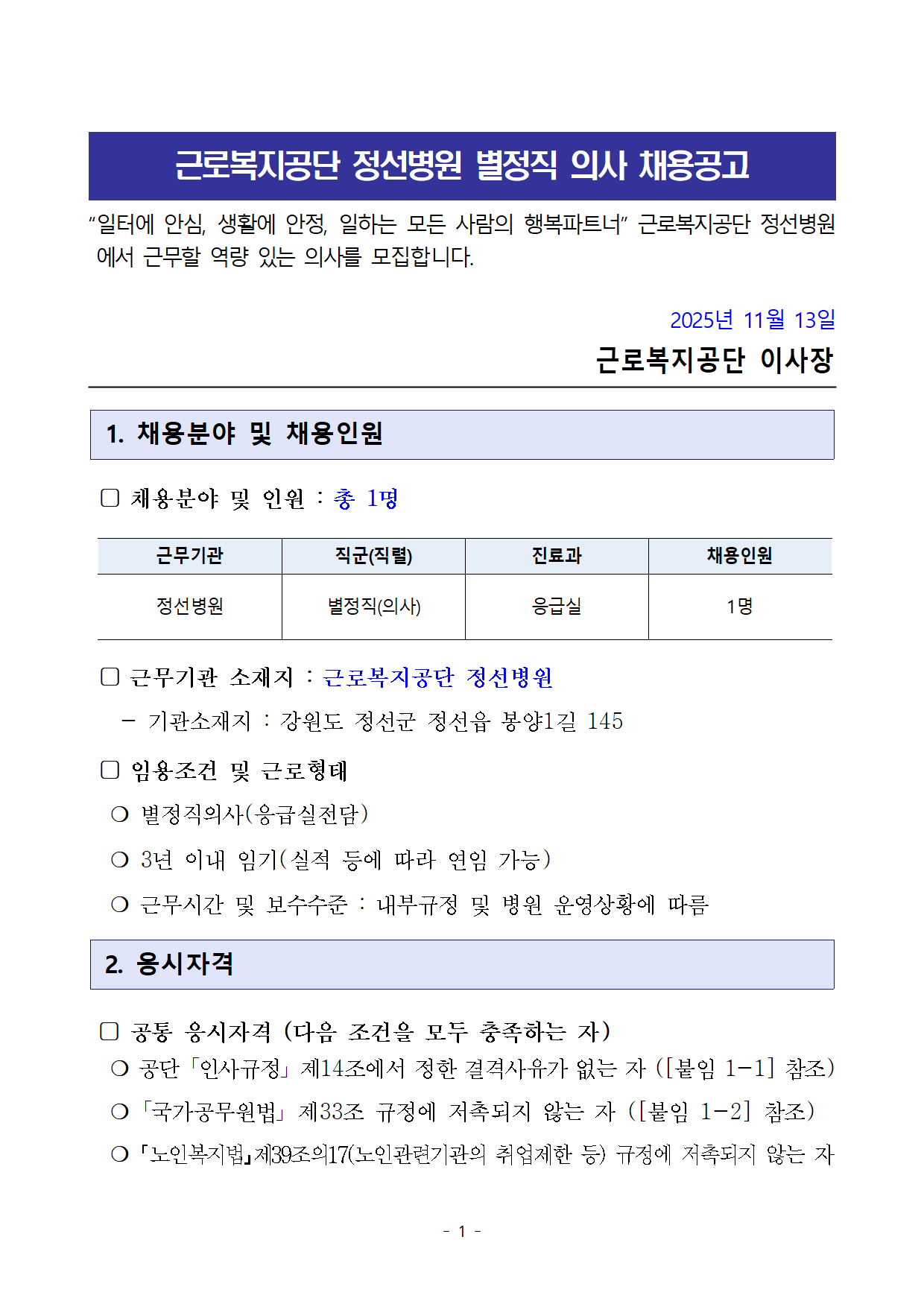 ¡°ÀÏÅÍ¿¡ ¾È½É, »ýȰ¿¡ ¾ÈÁ¤, ÀÏÇÏ´Â ¸ðµç »ç¶÷ÀÇ ÇູÆÄÆ®³Ê¡± ±Ù·Îº¹Áö°ø´Ü Á¤¼±º´¿ø ¿¡¼ ±Ù¹«ÇÒ ¿ª·® ÀÖ´Â Àǻ縦 ¸ðÁýÇÕ´Ï´Ù. 2025³â 11¿ù 13ÀÏ ±Ù·Îº¹Áö°ø´Ü ÀÌ»çÀå 1. ä¿ëºÐ¾ß ¹× ä¿ëÀοø ▢ ä¿ëºÐ¾ß ¹× Àοø : ÃÑ 1¸í ±Ù¹«±â°ü Á÷±º(Á÷·Ä) Áø·á°ú ä¿ëÀοø Á¤¼±º´¿ø º°Á¤Á÷(ÀÇ»ç) ÀÀ±Þ½Ç 1¸í ▢ ±Ù¹«±â°ü ¼ÒÀçÁö : ±Ù·Îº¹Áö°ø´Ü Á¤¼±º´¿ø - ±â°ü¼ÒÀçÁö : °¿øµµ Á¤¼±±º Á¤¼±À¾ ºÀ¾ç1±æ 145 ▢ ÀÓ¿ëÁ¶°Ç ¹× ±Ù·ÎÇüÅ ❍ º°Á¤Á÷ÀÇ»ç(ÀÀ±Þ½ÇÀü´ã) ❍ 3³â À̳» ÀÓ±â(½ÇÀû µî¿¡ µû¶ó ¿¬ÀÓ °¡´É) ❍ ±Ù¹«½Ã°£ ¹× º¸¼ö¼öÁØ : ³»ºÎ±ÔÁ¤ ¹× º´¿ø ¿î¿µ»óȲ¿¡ µû¸§