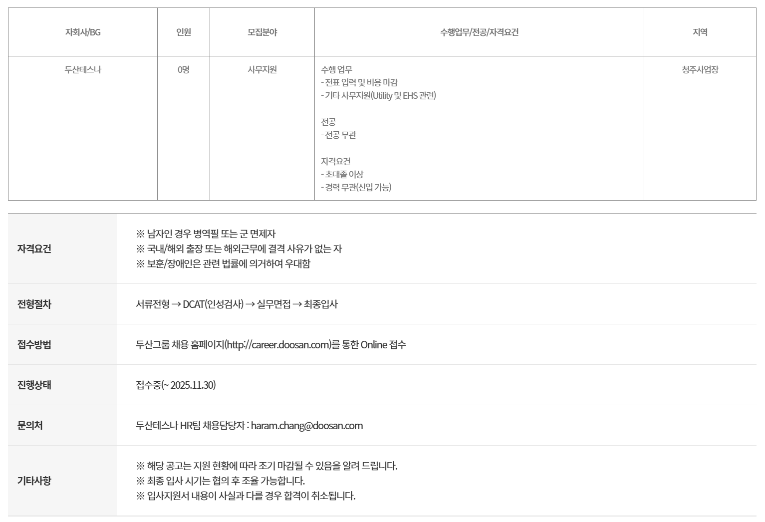 »ç¹«Áö¿ø ´ã´çÀÚ ÀÚȸ»ç/BG µÎ»êÅ×½º³ª Àοø 0¸í ¸ðÁýºÐ¾ß »ç¹«Áö¿ø ¼öÇà¾÷¹«/Àü°ø/ÀÚ°Ý¿ä°Ç ¼öÇà ¾÷¹« - ÀüÇ¥ ÀÔ·Â ¹× ºñ¿ë ¸¶°¨ - ±âŸ »ç¹«Áö¿ø(Utility ¹× EHS °ü·Ã) Àü°ø - Àü°ø ¹«°ü ÀÚ°Ý¿ä°Ç - ÃÊ´ëÁ¹ ÀÌ»ó - °æ·Â ¹«°ü(½ÅÀÔ °¡´É) Áö¿ª ûÁÖ»ç¾÷Àå ÀÚ°Ý¿ä°Ç ¡Ø ³²ÀÚÀÎ °æ¿ì º´¿ªÇÊ ¶Ç´Â ±º ¸éÁ¦ÀÚ ¡Ø ±¹³»/ÇØ¿Ü ÃâÀå ¶Ç´Â ÇØ¿Ü±Ù¹«¿¡ °á°Ý »çÀ¯°¡ ¾ø´Â ÀÚ ¡Ø º¸ÈÆ/Àå¾ÖÀÎÀº °ü·Ã ¹ý·ü¿¡ ÀǰÅÇÏ¿© ¿ì´ëÇÔ ÀüÇüÀýÂ÷ ¼­·ùÀüÇü ¡æ DCAT(Àμº°Ë»ç) ¡æ ½Ç¹«¸éÁ¢ ¡æ ÃÖÁ¾ÀÔ»ç Á¢¼ö¹æ¹ý µÎ»ê±×·ì ä¿ë ȨÆäÀÌÁö(http://career.doosan.com)¸¦ ÅëÇÑ Online Á¢¼ö