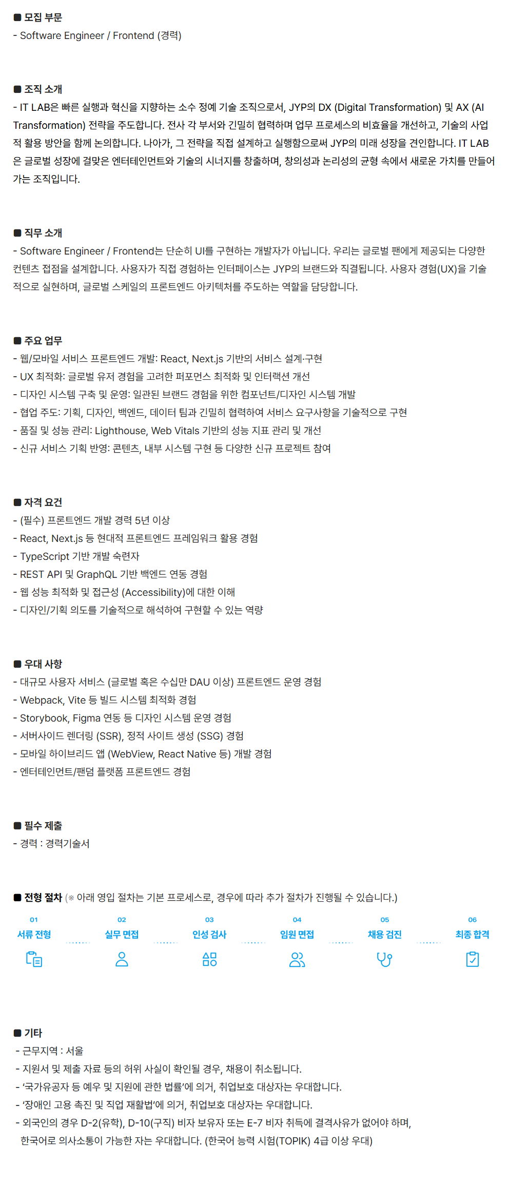 - Software Engineer / Frontend´Â ´Ü¼øÈ÷ UI¸¦ ±¸ÇöÇÏ´Â °³¹ßÀÚ°¡ ¾Æ´Õ´Ï´Ù. ¿ì¸®´Â ±Û·Î¹ú ÆÒ¿¡°Ô Á¦°øµÇ´Â ´Ù¾çÇÑ ÄÁÅÙÃ÷ Á¢Á¡À» ¼³°èÇÕ´Ï´Ù. »ç¿ëÀÚ°¡ Á÷Á¢ °æÇèÇÏ´Â ÀÎÅÍÆäÀ̽º´Â JYPÀÇ ºê·£µå¿Í Á÷°áµË´Ï´Ù. »ç¿ëÀÚ °æÇè(UX)À» ±â¼úÀûÀ¸·Î ½ÇÇöÇϸç, ±Û·Î¹ú ½ºÄÉÀÏÀÇ ÇÁ·ÐÆ®¿£µå ¾ÆÅ°ÅØÃ³¸¦ ÁÖµµÇÏ´Â ¿ªÇÒÀ» ´ã´çÇÕ´Ï´Ù.