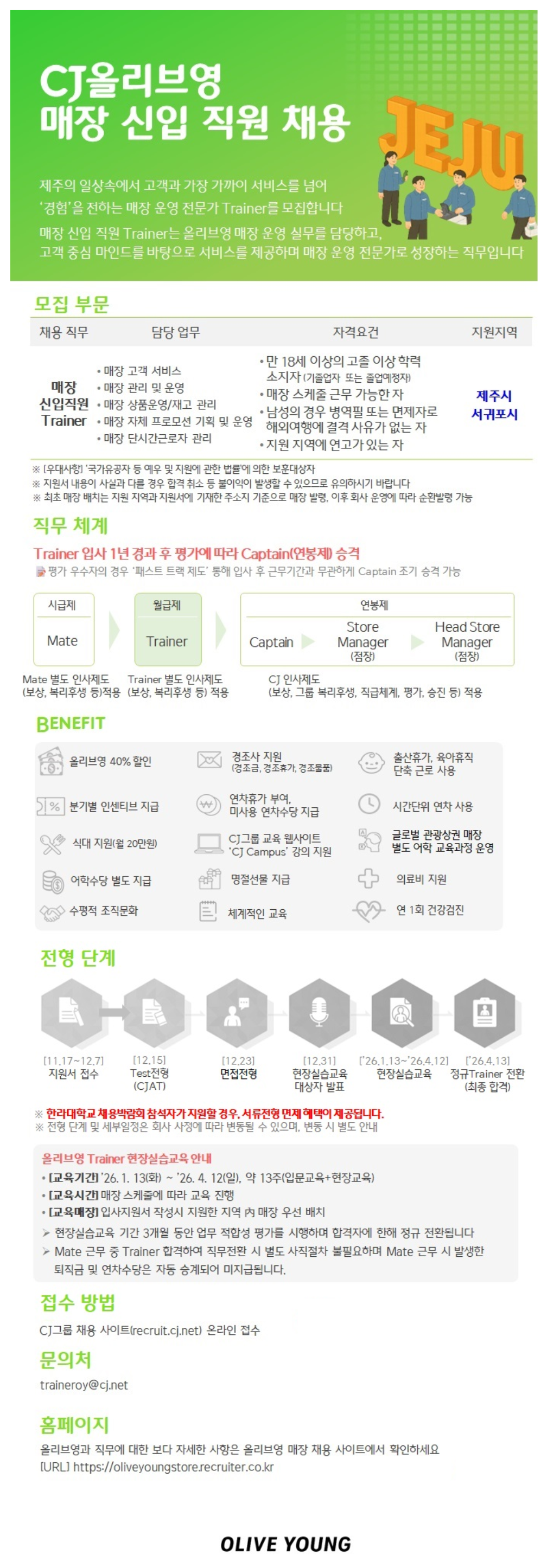 [CJ¿Ã¸®ºê¿µ] ¸ÅÀå ½ÅÀÔ Á÷¿ø(Trainer) ¸ðÁý(Á¦ÁÖ)