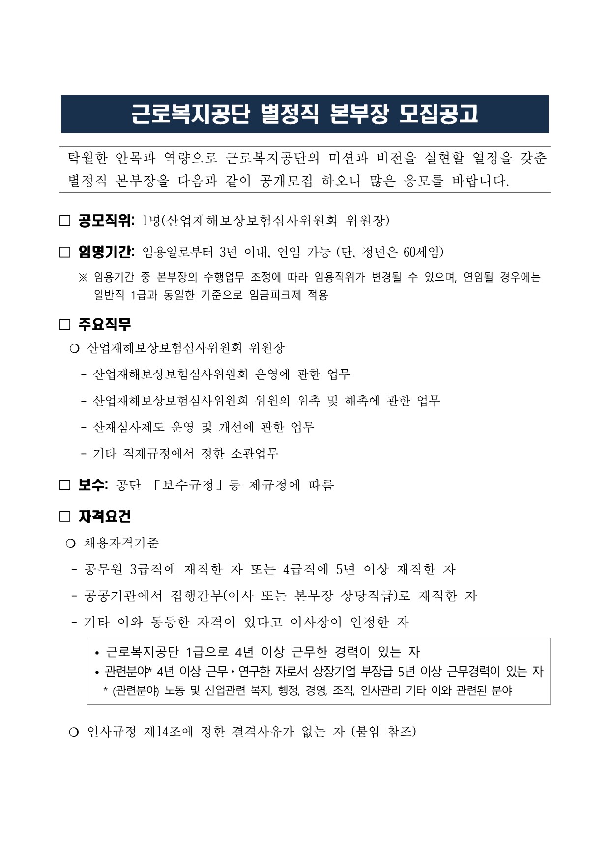 Ź¿ùÇÑ ¾È¸ñ°ú ¿ª·®À¸·Î ±Ù·Îº¹Áö°ø´ÜÀÇ ¹Ì¼Ç°ú ºñÀüÀ» ½ÇÇöÇÒ ¿Á¤À» °®ÃẰÁ¤Á÷ º»ºÎÀåÀ» ´ÙÀ½°ú °°ÀÌ °ø°³¸ðÁý ÇÏ¿À´Ï ¸¹Àº ÀÀ¸ð¸¦ ¹Ù¶ø´Ï´Ù. ¡à °ø¸ðÁ÷À§: 1¸í(»ê¾÷ÀçÇØº¸»óº¸Çè½É»çÀ§¿øÈ¸ À§¿øÀå)