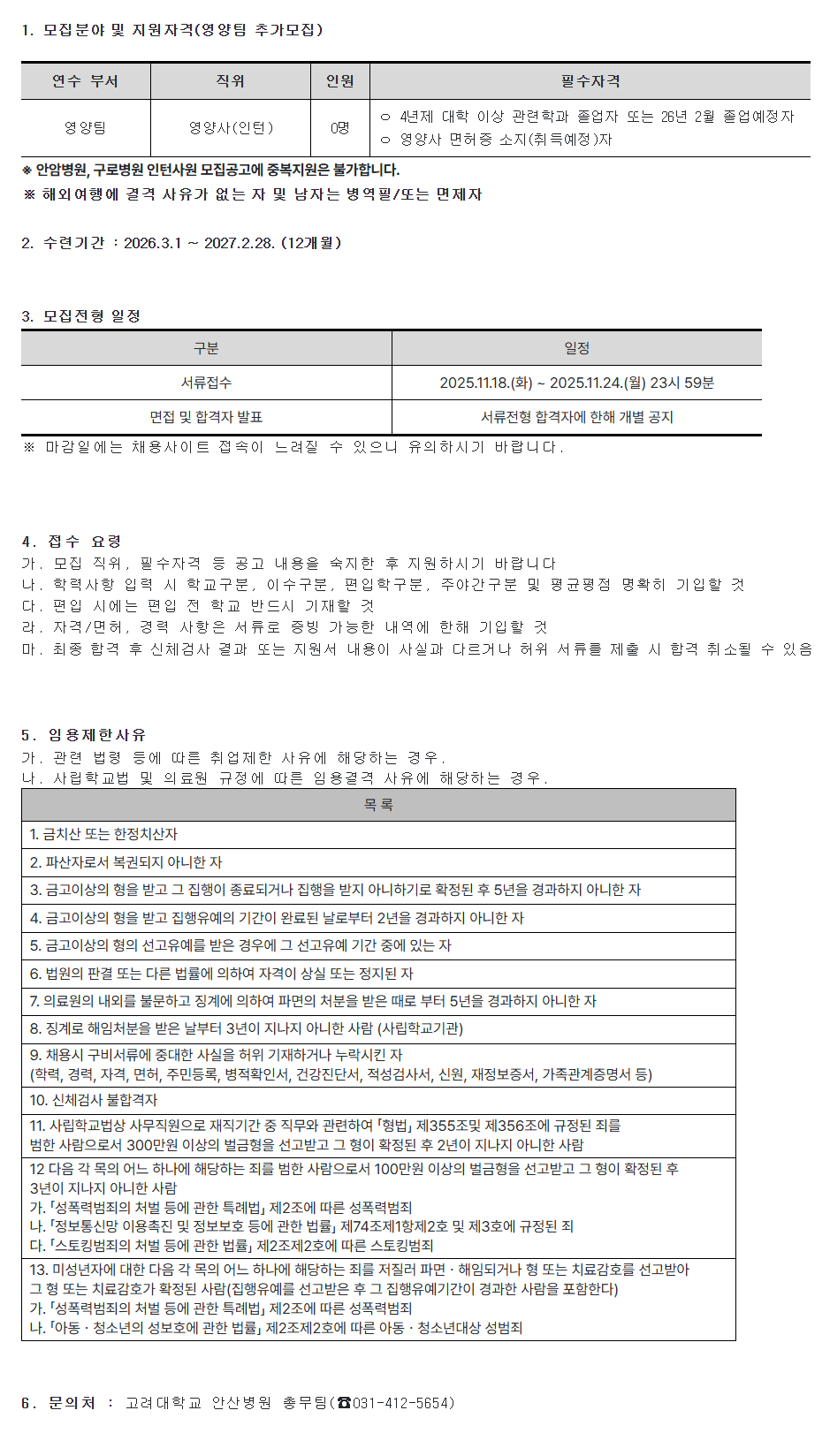 [¾È»êº´¿ø] °í·Á´ëÇб³¾È»êº´¿ø 2026³âµµ ÀϹÝÁ÷ ÀÎÅÏ»ç¿ø ¸ðÁý(¿µ¾çÆÀ Ãß°¡¸ðÁý°ø°í)