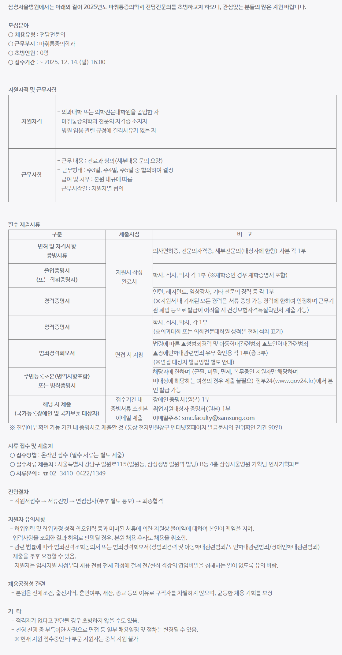 »ï¼º¼¿ïº´¿ø¿¡¼´Â ¾Æ·¡¿Í °°ÀÌ 2025³âµµ ¸¶ÃëÅëÁõÀÇÇаú Àü´ãÀü¹®ÀǸ¦ ÃʺùÇϰíÀÚ ÇÏ¿À´Ï, °ü½ÉÀÖ´Â ºÐµéÀÇ ¸¹Àº Áö¿ø ¹Ù¶ø´Ï´Ù.