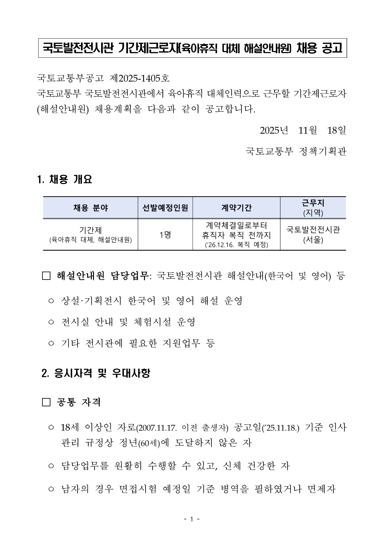 ±¹Åä¹ßÀüÀü½Ã°ü ±â°£Á¦±Ù·ÎÀÚ(À°¾ÆÈÞÁ÷ ´ëü ÇØ¼³¾È³»¿ø) ä¿ë °ø°í±¹Åä±³ÅëºÎ°ø°í Á¦2025-1405È£ ±¹Åä±³ÅëºÎ ±¹Åä¹ßÀüÀü½Ã°ü¿¡¼­ À°¾ÆÈÞÁ÷ ´ëüÀηÂÀ¸·Î ±Ù¹«ÇÒ ±â°£Á¦±Ù·ÎÀÚ(ÇØ¼³¾È³»¿ø) ä¿ë°èȹÀ» ´ÙÀ½°ú °°ÀÌ °ø°íÇÕ´Ï´Ù. 2025³â 11¿ù18Àϱ¹Åä±³ÅëºÎ Á¤Ã¥±âȹ°ü1. ä¿ë °³¿ä ä¿ë ºÐ¾ß ¼±¹ß¿¹Á¤Àοø °è¾à±â°£ ±Ù¹«Áö (Áö¿ª) ±â°£Á¦ (À°¾ÆÈÞÁ÷ ´ëü, ÇØ¼³¾È³»¿ø) 1¸í °è¾àü°áÀϷκÎÅÍ ÈÞÁ÷ÀÚ º¹Á÷ Àü±îÁö (¡¯26.12.16. º¹Á÷ ¿¹Á¤) ±¹Åä¹ßÀüÀü½Ã°ü(¼­¿ï) ¡à ÇØ¼³¾È³»¿ø ´ã´ç¾÷¹«: ±¹Åä¹ßÀüÀü½Ã°ü ÇØ¼³¾È³»(Çѱ¹¾î ¹× ¿µ¾î) µî¤· »ó¼³¡¤±âȹÀü½Ã Çѱ¹¾î ¹× ¿µ¾î ÇØ¼³ ¿î¿µ ¤· Àü½Ã½Ç ¾È³» ¹× üÇè½Ã¼³ ¿î¿µ ¤· ±âŸ Àü½Ã°ü¿¡ ÇÊ¿äÇÑ Áö¿ø¾÷¹« µî