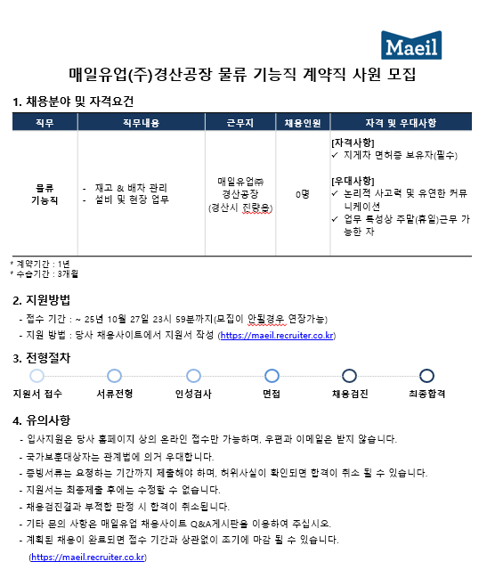 ¸ÅÀÏÀ¯¾÷ °æ»ê°øÀå ¹°·ùÆÀ ±â´ÉÁ÷ °è¾àÁ÷ ä¿ë