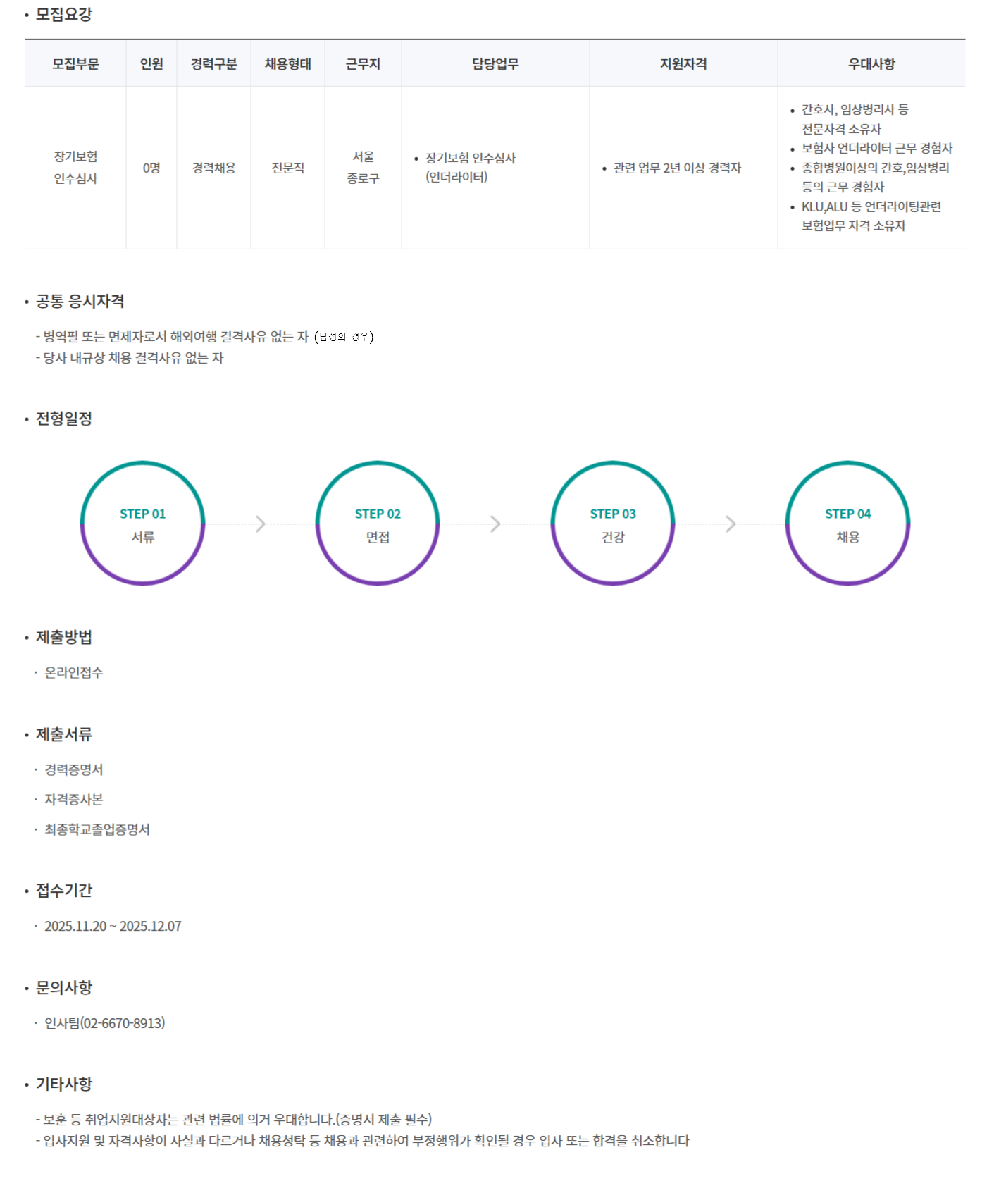 Àå±âº¸Çè Àμö½É»ç 0¸í °æ·Âä¿ë Àü¹®Á÷ ¼¿ï Á¾·Î±¸ Àå±âº¸Çè Àμö½É»ç (¾ð´õ¶óÀÌÅÍ) °ü·Ã ¾÷¹« 2³â ÀÌ»ó °æ·ÂÀÚ °£È£»ç, ÀÓ»óº´¸®»ç µî Àü¹®ÀÚ°Ý ¼ÒÀ¯ÀÚ
