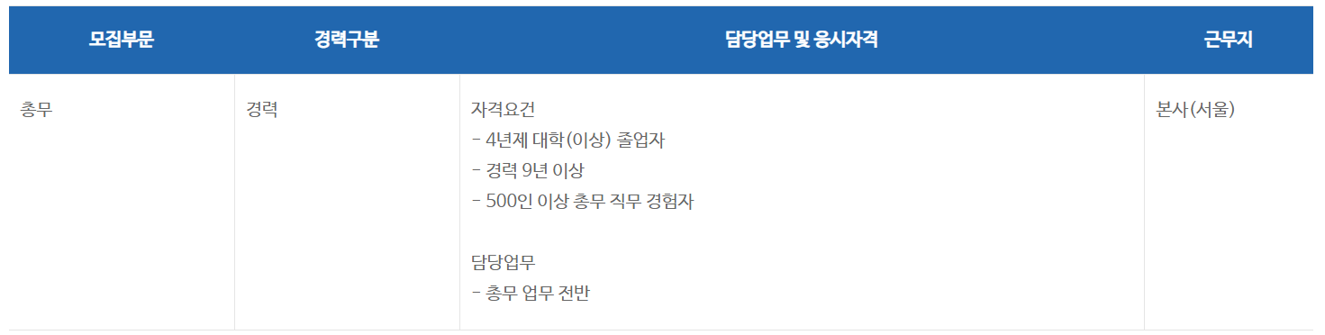 ¸ðÁýºÎ¹® °æ·Â±¸ºÐ ´ã´ç¾÷¹« ¹× ÀÀ½ÃÀÚ°Ý ±Ù¹«Áö Ãѹ« °æ·Â ÀÚ°Ý¿ä°Ç - 4³âÁ¦ ´ëÇÐ(ÀÌ»ó) Á¹¾÷ÀÚ - °æ·Â 9³â ÀÌ»ó - 500ÀÎ ÀÌ»ó Ãѹ« Á÷¹« °æÇèÀÚ ´ã´ç¾÷¹« - Ãѹ« ¾÷¹« Àü¹Ý º»»ç(¼¿ï)