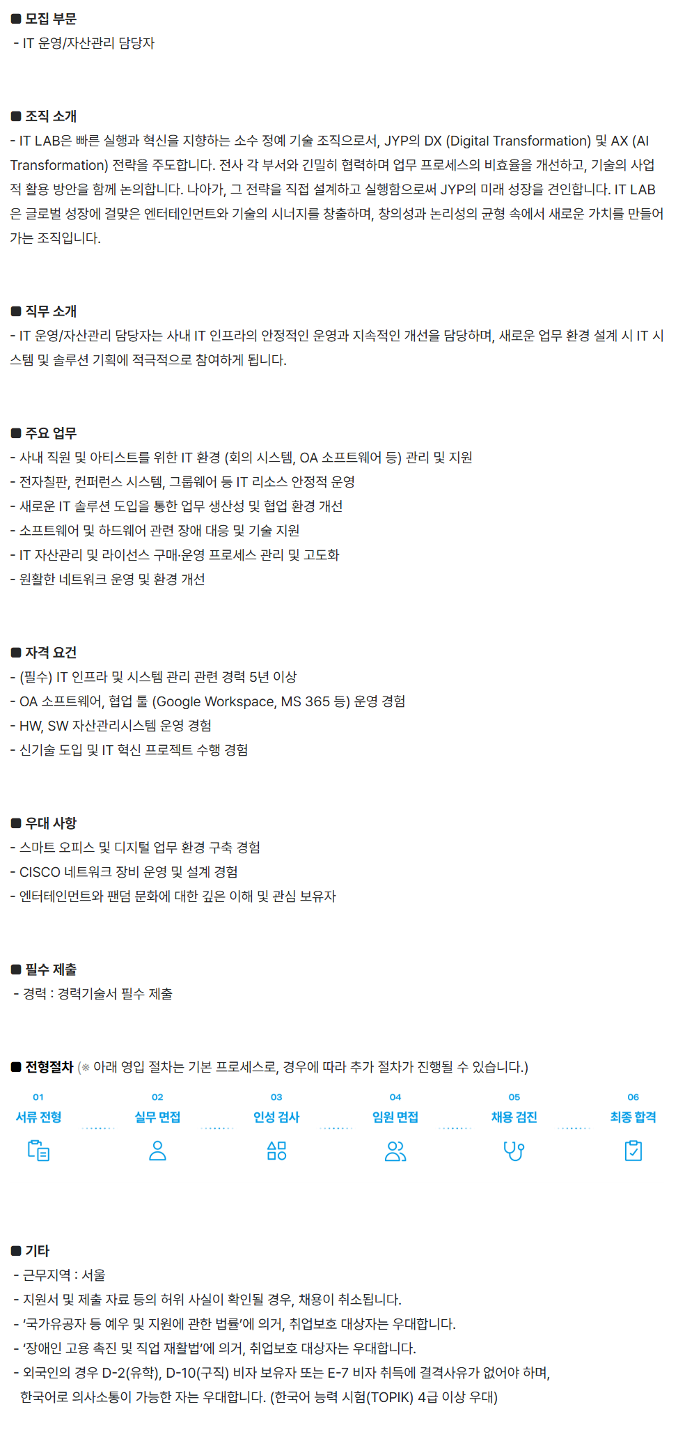 - IT ¿î¿µ/ÀÚ»ê°ü¸® ´ã´çÀÚ´Â »ç³» IT ÀÎÇÁ¶óÀÇ ¾ÈÁ¤ÀûÀÎ ¿î¿µ°ú Áö¼ÓÀûÀÎ °³¼±À» ´ã´çÇϸç, »õ·Î¿î ¾÷¹« ȯ°æ ¼³°è ½Ã IT ½Ã½ºÅÛ ¹× ¼Ö·ç¼Ç ±âȹ¿¡ Àû±ØÀûÀ¸·Î Âü¿©ÇÏ°Ô µË´Ï´Ù.