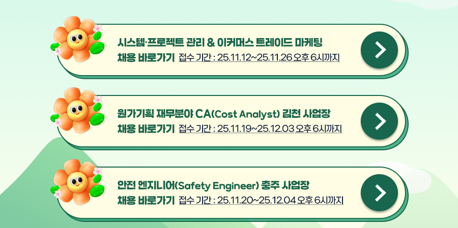 À¯ÇÑÅ´¹ú¸® 2025³â À¯ÇÑÅ´¹ú¸® ¼­¿ï/±èõ/ÃæÁÖ °æ·Â»ç¿ø ä¿ë ¿ì¸®´Â »ýȰ-°Ç°­-Áö±¸È¯°æÀ» À§ÇØ ÇൿÇÏ´Â ±â¾÷ÀÔ´Ï´Ù. º¯Çõ°ú Çõ½ÅÀ» À̲ø¾î°¥ ÀÎÀ縦 ±â´Ù¸®°í ÀÖ½À´Ï´Ù. ¸¹Àº Áö¿ø ºÎʵ右´Ï´Ù. ½Ã½ºÅÛ¡¤ÇÁ·ÎÁ§Æ® °ü¸® ÀÌÄ¿¸Ó½º Æ®·¹ÀÌµå ¸¶ÄÉÆÃ Ã¤¿ë ¹Ù·Î°¡±â Á¢¼ö ±â°£: 25.11.12~25.11.26 ¿ÀÈÄ 6½Ã±îÁö ¿ø°¡±âȹ À繫ºÐ¾ß CA(Cost Analyst) ±èõ »ç¾÷Àå ä¿ë ¹Ù·Î°¡±â Á¢¼ö ±â°£:25.11.19~25.12.03 ¿ÀÈÄ 6½Ã±îÁö ¾ÈÀü ¿£Áö´Ï¾î(Safety Engineer) ÃæÁÖ »ç¾÷Àå ä¿ë ¹Ù·Î°¡±â Á¢¼ö ±â°£: 25.11.20~25.12.04 ¿ÀÈÄ 6½Ã±îÁö À¯ÇÑÅ´¹ú¸® À¯ÇÑÅ´¹ú¸® 2025³â À¯ÇÑÅ´¹ú¸® ¼­¿ï/±èõ/ÃæÁÖ °æ·Â»ç¿ø ä¿ë ¿ì¸®´Â »ýȰ-°Ç°­-Áö±¸È¯°æÀ» À§ÇØ ÇൿÇÏ´Â ±â¾÷ÀÔ´Ï´Ù. º¯Çõ°ú Çõ½ÅÀ» À̲ø¾î°¥ ÀÎÀ縦 ±â´Ù¸®°í ÀÖ½À´Ï´Ù. ¸¹Àº Áö¿ø ºÎʵ右´Ï´Ù. ½Ã½ºÅÛ¡¤ÇÁ·ÎÁ§Æ® °ü¸® ÀÌÄ¿¸Ó½º Æ®·¹ÀÌµå ¸¶ÄÉÆÃ Ã¤¿ë ¹Ù·Î°¡±â Á¢¼ö ±â°£: 25.11.12~25.11.26 ¿ÀÈÄ 6½Ã±îÁö ¿ø°¡±âȹ À繫ºÐ¾ß CA(Cost Analyst) ±èõ »ç¾÷Àå ä¿ë ¹Ù·Î°¡±â Á¢¼ö ±â°£:25.11.19~25.12.03 ¿ÀÈÄ 6½Ã±îÁö ¾ÈÀü ¿£Áö´Ï¾î(Safety Engineer) ÃæÁÖ »ç¾÷Àå ä¿ë ¹Ù·Î°¡±â Á¢¼ö ±â°£: 25.11.20~25.12.04 ¿ÀÈÄ 6½Ã±îÁö À¯ÇÑÅ´¹ú¸® À¯ÇÑÅ´¹ú¸® 2025³â À¯ÇÑÅ´¹ú¸® ¼­¿ï/±èõ/ÃæÁÖ °æ·Â»ç¿ø ä¿ë ¿ì¸®´Â »ýȰ-°Ç°­-Áö±¸È¯°æÀ» À§ÇØ ÇൿÇÏ´Â ±â¾÷ÀÔ´Ï´Ù. º¯Çõ°ú Çõ½ÅÀ» À̲ø¾î°¥ ÀÎÀ縦 ±â´Ù¸®°í ÀÖ½À´Ï´Ù. ¸¹Àº Áö¿ø ºÎʵ右´Ï´Ù. ½Ã½ºÅÛ¡¤ÇÁ·ÎÁ§Æ® °ü¸® ÀÌÄ¿¸Ó½º Æ®·¹ÀÌµå ¸¶ÄÉÆÃ Ã¤¿ë ¹Ù·Î°¡±â Á¢¼ö ±â°£: 25.11.12~25.11.26 ¿ÀÈÄ 6½Ã±îÁö ¿ø°¡±âȹ À繫ºÐ¾ß CA(Cost Analyst) ±èõ »ç¾÷Àå ä¿ë ¹Ù·Î°¡±â Á¢¼ö ±â°£:25.11.19~25.12.03 ¿ÀÈÄ 6½Ã±îÁö ¾ÈÀü ¿£Áö´Ï¾î(Safety Engineer) ÃæÁÖ »ç¾÷Àå ä¿ë ¹Ù·Î°¡±â Á¢¼ö ±â°£: 25.11.20~25.12.04 ¿ÀÈÄ 6½Ã±îÁö À¯ÇÑÅ´¹ú¸®
