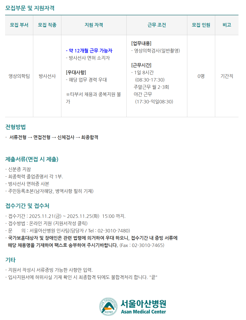 ¸ðÁýºÎ¹® ¹× Áö¿øÀÚ°Ý ¸ðÁý ºÎ¼­ ¸ðÁý Á÷Á¾ Áö¿ø ÀÚ°Ý ±Ù¹« Á¶°Ç ¸ðÁý Àοø ºñ°í ¿µ»óÀÇÇÐÆÀ ¹æ»ç¼±»ç - ¾à 12°³¿ù ±Ù¹« °¡´ÉÀÚ - ¹æ»ç¼±»ç ¸éÇã ¼ÒÁöÀÚ [¿ì´ë»çÇ×] - ÇØ´ç ¾÷¹« °æ·Â ¿ì´ë ¡ØÅ¸ºÎ¼­ ä¿ë°ú Áߺ¹Áö¿ø ºÒ°¡ [¾÷¹«³»¿ë] - ¿µ»óÀÇÇа˻ç(ÀϹÝÃÔ¿µ) [±Ù¹«½Ã°£] - 1ÀÏ 8½Ã°£ (08:30-17:30) ÁÖ¸»±Ù¹« ¿ù 2-3ȸ ¾ß°£ ±Ù¹« (17:30-ÀÍÀÏ08:30) 0¸í ±â°£Á÷ ÀüÇü¹æ¹ý - ¼­·ùÀüÇü ¡æ ¸éÁ¢ÀüÇü ¡æ ½Åü°Ë»ç ¡æ ÃÖÁ¾ÇÕ°Ý Á¦Ãâ¼­·ù(¸éÁ¢ ½Ã Á¦Ãâ) - ½ÅºÐÁõ ÁöÂü - ÃÖÁ¾Çз Á¹¾÷Áõ¸í¼­ °¢ 1ºÎ. - ¹æ»ç¼±»ç ¸éÇãÁõ »çº» - Áֹεî·ÏÃʺ»(³²ÀÚÇØ´ç, º´¿ª»çÇ× ÇÊÈ÷ ±âÀç) Á¢¼ö±â°£ ¹× Á¢¼öó - Á¢¼ö±â°£ : 2025.11.21(±Ý) ~ 2025.11.25(È­) 15:00 ±îÁö. - Á¢¼ö¹æ¹ý : ¿Â¶óÀÎ Áö¿ø (Áö¿ø¼­ÀÛ¼º Ŭ¸¯) - ¹® ÀÇ : ¼­¿ï¾Æ»êº´¿ø ÀλçÆÀ(´ã´çÀÚ / Tel : ***-****-****) - ±¹°¡º¸ÈÆ´ë»óÀÚ ¹× Àå¾ÖÀÎÀº °ü·Ã ¹ý·É¿¡ ÀǰÅÇÏ¿© ¿ì´ë ÇÏ¿À´Ï, Á¢¼ö±â°£ ³» Áõºù ¼­·ù¿¡ ÇØ´ç ä¿ë¸íÀ» ±âÀçÇÏ¿© ÆÑ½º·Î ¼ÛºÎÇÏ¿© Áֽñâ¹Ù¶ø´Ï´Ù. (Fax : ***-****-****) ±âŸ - Áö¿ø¼­ ÀÛ¼º½Ã ¼­·ùÁõºù °¡´ÉÇÑ »çÇ׸¸ ÀÔ·Â. - ÀÔ»çÁö¿ø¼­¿¡ ÇãÀ§»ç½Ç ±âÀç È®ÀÎ ½Ã ÃÖÁ¾ÇÕ°Ý µÚ¿¡µµ ºÒÇÕ°Ýó¸® ÇÕ´Ï´Ù. "³¡"