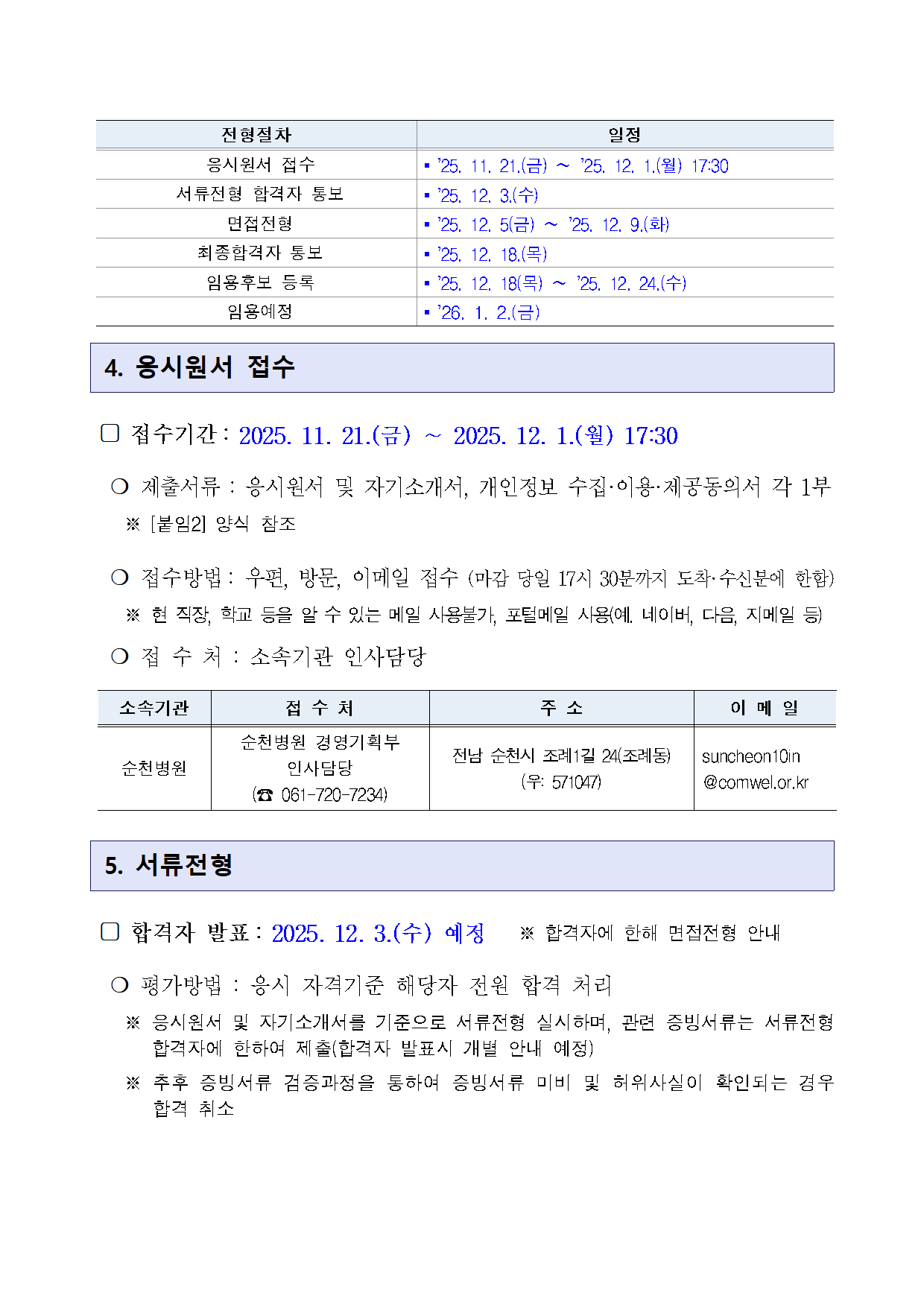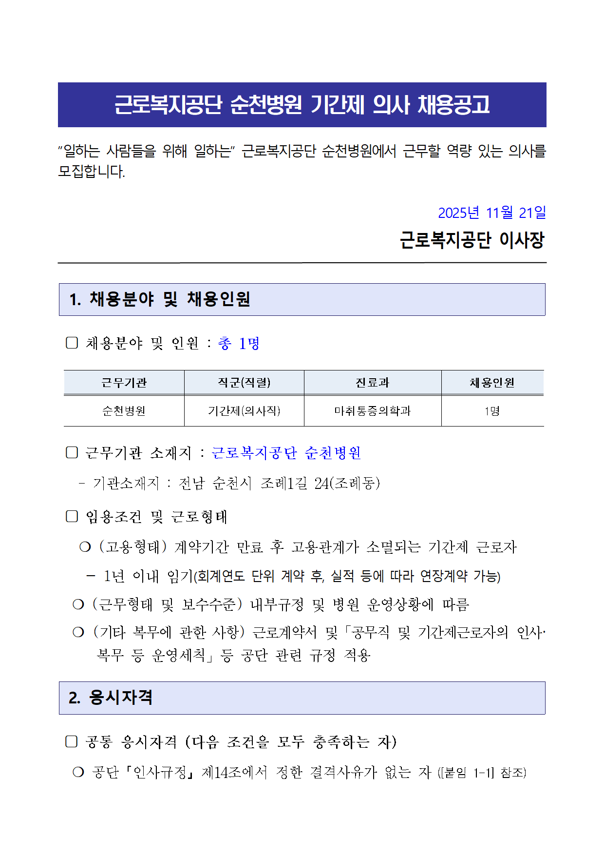 ¡±ÀÏÇÏ´Â »ç¶÷µéÀ» À§ÇØ ÀÏÇϴ¡± ±Ù·Îº¹Áö°ø´Ü ¼øÃµº´¿ø¿¡¼ ±Ù¹«ÇÒ ¿ª·® ÀÖ´Â Àǻ縦 ¸ðÁýÇÕ´Ï´Ù. 2025³â 11¿ù 21ÀÏ ±Ù·Îº¹Áö°ø´Ü ÀÌ»çÀå 1. ä¿ëºÐ¾ß ¹× ä¿ëÀοø ▢ ä¿ëºÐ¾ß ¹× Àοø : ÃÑ 1¸í ±Ù¹«±â°ü Á÷±º(Á÷·Ä) Áø·á°ú ä¿ëÀοø ¼øÃµº´¿ø ±â°£Á¦(ÀÇ»çÁ÷) ¸¶ÃëÅëÁõÀÇÇаú 1¸í ▢ ±Ù¹«±â°ü ¼ÒÀçÁö : ±Ù·Îº¹Áö°ø´Ü ¼øÃµº´¿ø - ±â°ü¼ÒÀçÁö : Àü³² ¼øÃµ½Ã Á¶·Ê1±æ 24(Á¶·Êµ¿) ▢ ÀÓ¿ëÁ¶°Ç ¹× ±Ù·ÎÇüÅ ❍ (°í¿ëÇüÅÂ) °è¾à±â°£ ¸¸·á ÈÄ °í¿ë°ü°è°¡ ¼Ò¸êµÇ´Â ±â°£Á¦ ±Ù·ÎÀÚ - 1³â À̳» ÀÓ±â(ȸ°è¿¬µµ ´ÜÀ§ °è¾à ÈÄ, ½ÇÀû µî¿¡ µû¶ó ¿¬Àå°è¾à °¡´É) ❍ (±Ù¹«ÇüÅ ¹× º¸¼ö¼öÁØ) ³»ºÎ±ÔÁ¤ ¹× º´¿ø ¿î¿µ»óȲ¿¡ µû¸§ ❍ (±âŸ º¹¹«¿¡ °üÇÑ »çÇ×) ±Ù·Î°è¾à¼ ¹×¡¸°ø¹«Á÷ ¹× ±â°£Á¦±Ù·ÎÀÚÀÇ Àλ硤 º¹¹« µî ¿î¿µ¼¼Ä¢¡¹µî °ø´Ü °ü·Ã ±ÔÁ¤ Àû¿ë