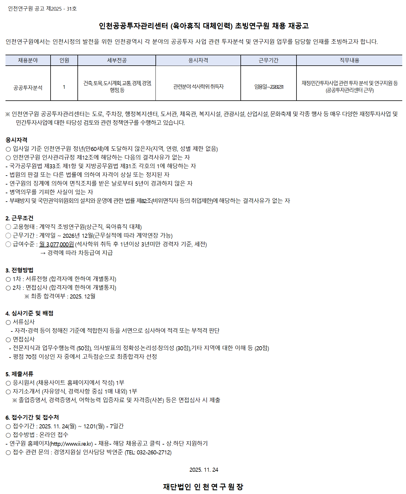 ÀÎõ°ø°øÅõÀÚ°ü¸®¼¾ÅÍ (À°¾ÆÈÞÁ÷ ´ëüÀηÂ) Ãʺù¿¬±¸¿ø ä¿ë Àç°ø°í