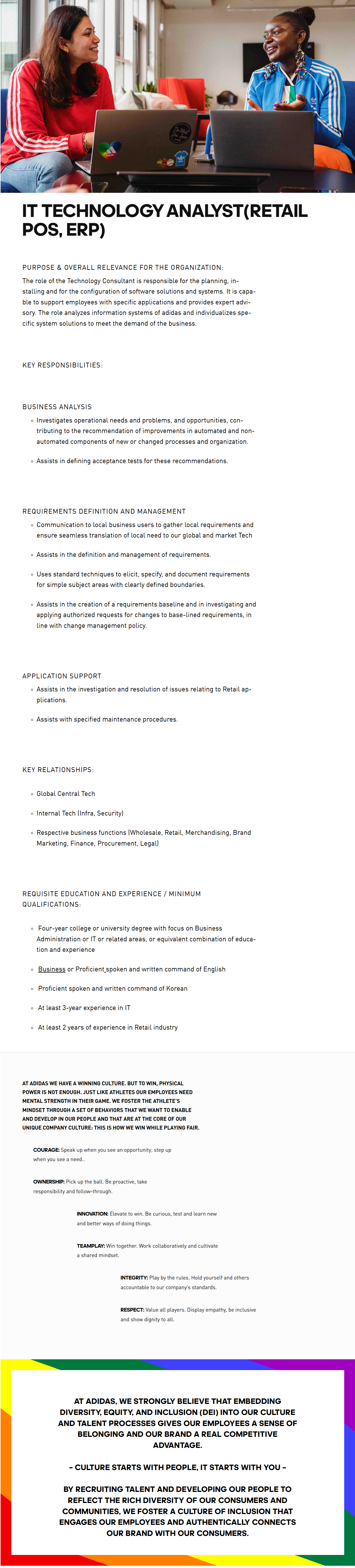 The role of the Technology Consultant is responsible for the planning, installing and for the configuration of software solutions and systems. It is capable to support employees with specific applications and provides expert advisory. The role analyzes information systems of adidas and individualizes specific system solutions to meet the demand of the business.