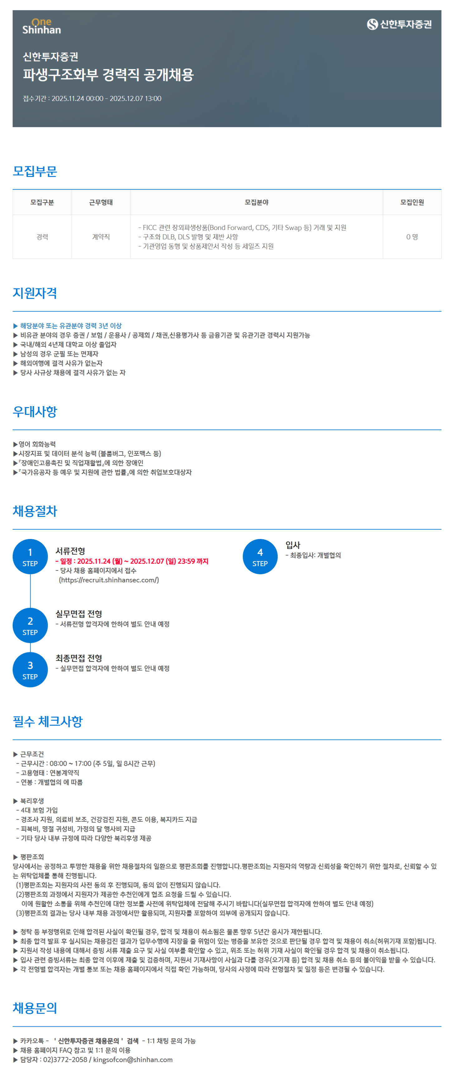 ¸ðÁý±¸ºÐ ±Ù¹«ÇüÅ ¸ðÁýºÐ¾ß ¸ðÁýÀοø °æ·Â °è¾àÁ÷ - FICC °ü·Ã Àå¿ÜÆÄ»ý»óǰ(Bond Forward, CDS, ±âŸ Swap µî) °Å·¡ ¹× Áö¿ø - ±¸Á¶È DLB, DLS ¹ßÇà ¹× Á¦¹Ý »çÇ× - ±â°ü¿µ¾÷ µ¿Çà ¹× »óǰÁ¦¾È¼ ÀÛ¼º µî ¼¼ÀÏÁî Áö¿ø 0 ¸í