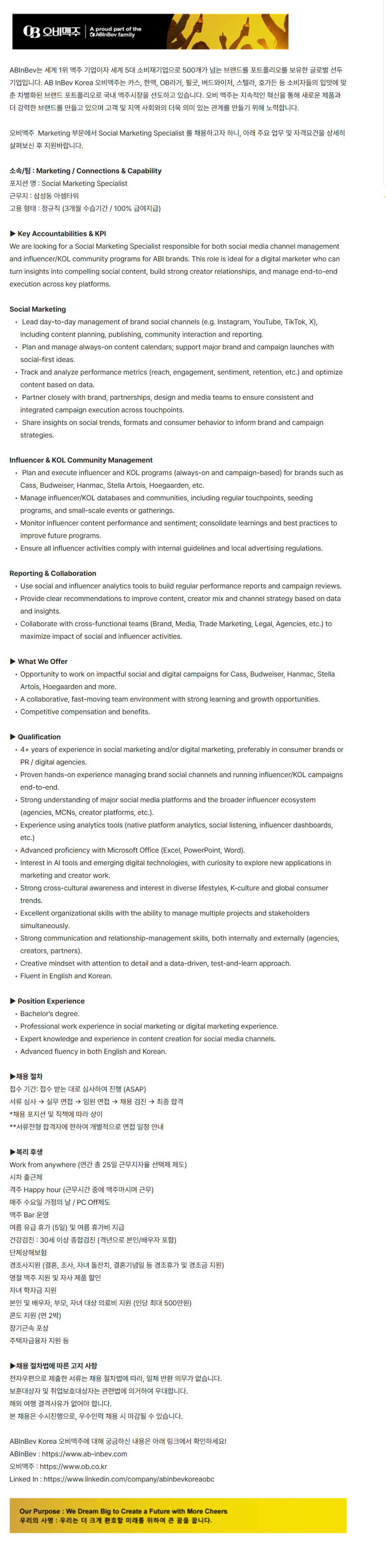 ABInBev´Â ¼¼°è ​1À§ ​¸ÆÁÖ ​±â¾÷ÀÌÀÚ ¼¼°è ​5´ë ¼ÒºñÀç±â¾÷À¸·Î 500°³°¡ ³Ñ´Â ​ºê·£µå¸¦ ​Æ÷Æ®Æú¸®¿À¸¦ º¸À¯ÇÑ ​±Û·Î¹ú ¼±µÎ ±â¾÷ÀÔ´Ï´Ù. ​AB InBev ​Korea ​¿Àºñ¸ÆÁÖ´Â Ä«½º, ​ÇѸÆ, ​OB¶ó°Å, ​ÇʱÂ, ¹öµå¿ÍÀÌÀú, ½ºÅÚ¶ó, ​È£°¡µç ​µî ¼ÒºñÀÚµéÀÇ ÀÔ¸À¿¡ ​¸ÂÃá ​Â÷º°È­µÈ ​ºê·£µå Æ÷Æ®Æú¸®¿À·Î ±¹³» ​¸ÆÁÖ½ÃÀåÀ» ¼±µµÇϰí ​ÀÖ½À´Ï´Ù. ​¿Àºñ ¸ÆÁÖ´Â ​Áö¼ÓÀûÀÎ Çõ½ÅÀ» ​ÅëÇØ ​»õ·Î¿î Á¦Ç°°ú ´õ ​°­·ÂÇÑ ºê·£µå¸¦ ​¸¸µé°í ÀÖÀ¸¸ç °í°´ ¹× Áö¿ª »çȸ¿ÍÀÇ ´õ¿í ÀÇ¹Ì ÀÖ´Â °ü°è¸¦ ¸¸µé±â À§ÇØ ³ë·ÂÇÕ´Ï´Ù. ¿Àºñ¸ÆÁÖ Marketing ºÎ¹®¿¡¼­ Social Marketing Specialist ¸¦ ä¿ëÇϰíÀÚ ÇÏ´Ï, ¾Æ·¡ ÁÖ¿ä ¾÷¹« ¹× ÀÚ°Ý¿ä°ÇÀ» »ó¼¼È÷ »ìÆìº¸½Å ÈÄ Áö¿ø¹Ù¶ø´Ï´Ù. ¼Ò¼Ó/ÆÀ : Marketing / Connections & Capability Æ÷Áö¼Ç ¸í : Social Marketing Specialist ±Ù¹«Áö : »ï¼ºµ¿ ¾Æ¼ÀŸ¿ö °í¿ë ÇüÅ : Á¤±ÔÁ÷ (3°³¿ù ¼ö½À±â°£ / 100% ±Þ¿©Áö±Þ) ¢º Key Accountabilities & KPI We are looking for a Social Marketing Specialist responsible for both social media channel management and influencer/KOL community programs for ABI brands. This role is ideal for a digital marketer who can turn insights into compelling social content, build strong creator relationships, and manage end-to-end execution across key platforms.