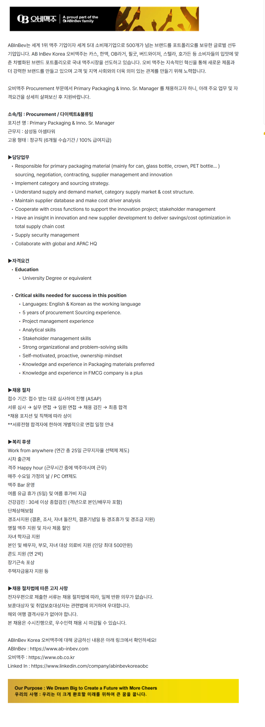 ¢º´ã´ç¾÷¹« Responsible for primary packaging material (mainly for can, glass bottle, crown, PET bottle¡¦ ) sourcing, negotiation, contracting, supplier management and innovation Implement category and sourcing strategy. Understand supply and demand market, category supply market & cost structure. Maintain supplier database and make cost driver analysis Cooperate with cross functions to support the innovation project; stakeholder management Have an insight in innovation and new supplier development to deliver savings/cost optimization in total supply chain cost Supply security management Collaborate with global and APAC HQ ¢ºÀÚ°Ý¿ä°Ç Education University Degree or equivalent