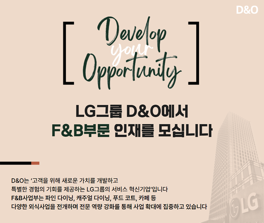 ´Ù¾çÇÑ ¿Ü½Ä»ç¾÷À» Àü°³Çϸç Àü¹® ¿ª·® °È¸¦ ÅëÇØ »ç¾÷ È®´ë¿¡ ÁýÁßÇϰí ÀÖ½À´Ï´Ù LG