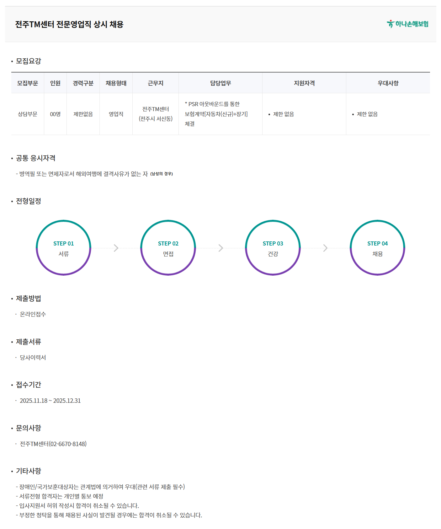 ¸ðÁýºÎ¹® Àοø °æ·Â±¸ºÐ ä¿ëÇüÅ ±Ù¹«Áö ´ã´ç¾÷¹« Áö¿øÀÚ°Ý ¿ì´ë»çÇ× »ó´ãºÎ¹® 00¸í Á¦ÇѾøÀ½ ¿µ¾÷Á÷ ÀüÁÖTM¼¾ÅÍ(ÀüÁֽà ¼½Åµ¿) * PSR ¾Æ¿ô¹Ù¿îµå¸¦ ÅëÇÑ º¸Çè°è¾à[ÀÚµ¿Â÷(½Å±Ô)+Àå±â] ü°á Á¦ÇÑ ¾øÀ½ Á¦ÇÑ ¾øÀ½