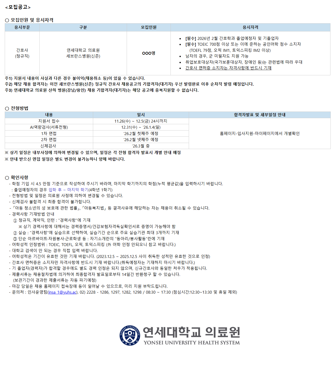 ÁÖ3) ¿¬¼¼´ëÇб³ ÀÇ·á¿ø »êÇÏ º´¿ø(°³²/¿ëÀÎ) ä¿ë ±âÇÕ°ÝÀÚ(´ë±âÀÚ)´Â ÇØ´ç °ø°í¿¡ Áߺ¹Áö¿øÇÒ ¼ö ¾ø½À´Ï´Ù.