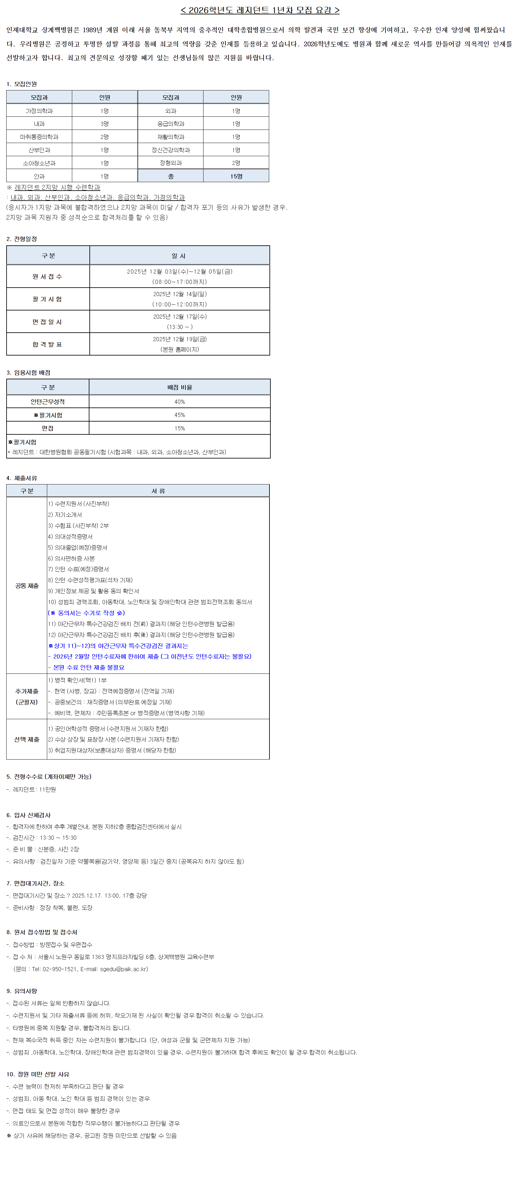 ÀÎÁ¦´ëÇб³ »ó°è¹éº´¿øÀº 1989³â °³¿ø ÀÌ·¡ ¼¿ï µ¿ºÏºÎ Áö¿ªÀÇ ÁßÃßÀûÀÎ ´ëÇÐÁ¾ÇÕº´¿øÀ¸·Î¼ ÀÇÇÐ ¹ßÀü°ú ±¹¹Î º¸°Ç Çâ»ó¿¡ ±â¿©Çϰí, ¿ì¼öÇÑ ÀÎÀç ¾ç¼º¿¡ Èû½á¿Ô½À´Ï´Ù. ¿ì¸®º´¿øÀº °øÁ¤Çϰí Åõ¸íÇÑ ¼³¹ß °úÁ¤À» ÅëÇØ ÃÖ°íÀÇ ¿ª·®À» °®Ãá ÀÎÀ縦 µî¿ëÇϰí ÀÖ½À´Ï´Ù. 2026Çг⵵¿¡µµ º´¿ø°ú ÇÔ²² »õ·Î¿î ¿ª»ç¸¦ ¸¸µé¾î°¥ ÀÇ¿åÀûÀÎ ÀÎÀ縦 ¼±¹ßÇϰíÀÚ ÇÕ´Ï´Ù. ÃÖ°íÀÇ Àü¹®ÀÇ·Î ¼ºÀåÇÒ ÆÐ±â ÀÖ´Â ¼±»ý´ÔµéÀÇ ¸¹Àº Áö¿øÀ» ¹Ù¶ø´Ï´Ù.