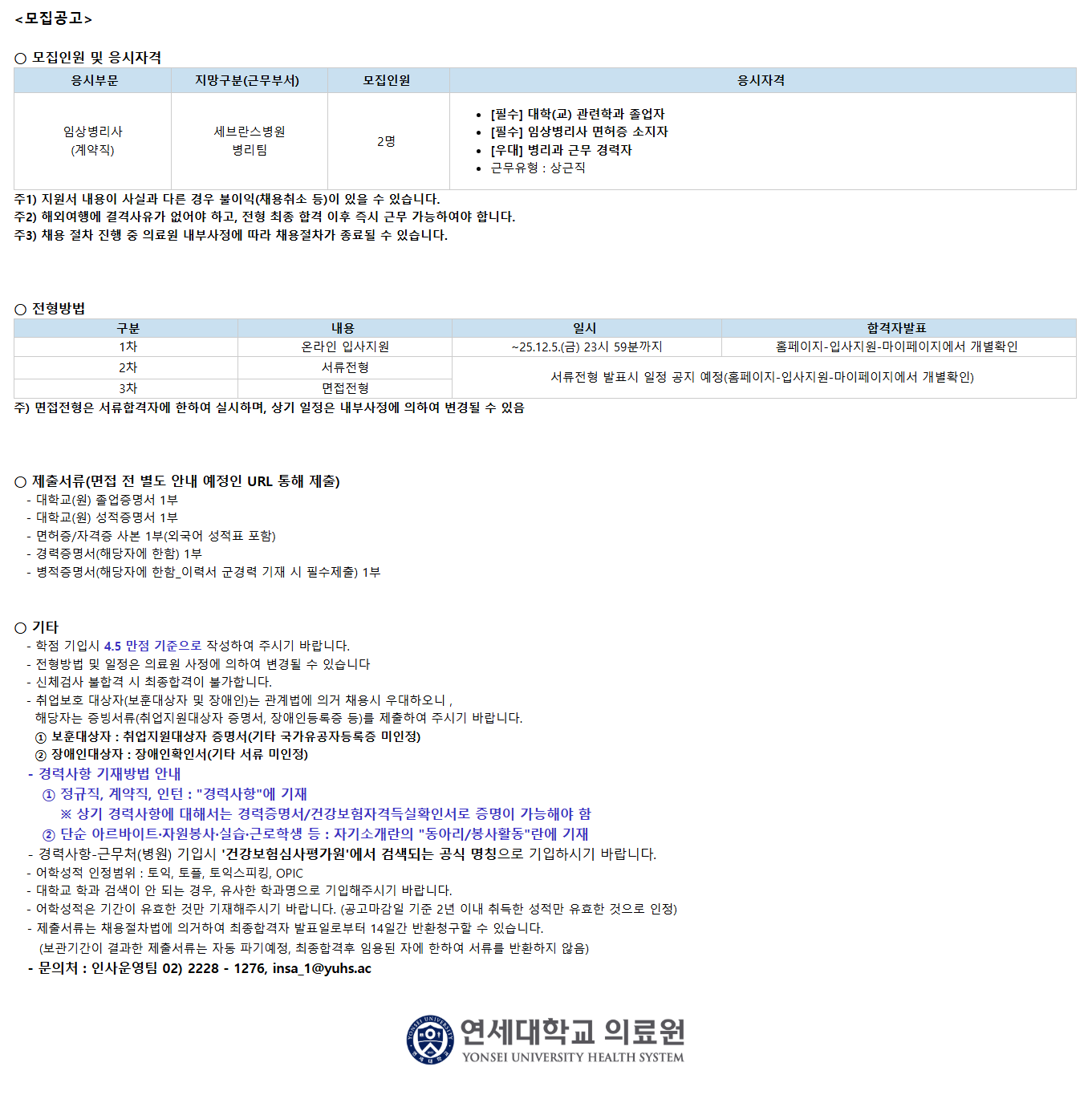 <¸ðÁý°ø°í> ¡Û ¸ðÁýÀοø ¹× ÀÀ½ÃÀÚ°Ý ÀÀ½ÃºÎ¹® Áö¸Á±¸ºÐ(±Ù¹«ºÎ¼­) ¸ðÁýÀοø ÀÀ½ÃÀÚ°Ý ÀÓ»óº´¸®»ç (°è¾àÁ÷) ¼¼ºê¶õ½ºº´¿ø º´¸®ÆÀ 2¸í [Çʼö] ´ëÇÐ(±³) °ü·ÃÇаú Á¹¾÷ÀÚ [Çʼö] ÀÓ»óº´¸®»ç ¸éÇãÁõ ¼ÒÁöÀÚ ​[¿ì´ë] º´¸®°ú ±Ù¹« °æ·ÂÀÚ ​±Ù¹«À¯Çü : »ó±ÙÁ÷ ÁÖ1) Áö¿ø¼­ ³»¿ëÀÌ »ç½Ç°ú ´Ù¸¥ °æ¿ì ºÒÀÌÀÍ(ä¿ëÃë¼Ò µî)ÀÌ ÀÖÀ» ¼ö ÀÖ½À´Ï´Ù. ÁÖ2) ÇØ¿Ü¿©Çà¿¡ °á°Ý»çÀ¯°¡ ¾ø¾î¾ß Çϰí, ÀüÇü ÃÖÁ¾ ÇÕ°Ý ÀÌÈÄ Áï½Ã ±Ù¹« °¡´ÉÇÏ¿©¾ß ÇÕ´Ï´Ù. ÁÖ3) ä¿ë ÀýÂ÷ ÁøÇà Áß ÀÇ·á¿ø ³»ºÎ»çÁ¤¿¡ µû¶ó ä¿ëÀýÂ÷°¡ Á¾·áµÉ ¼ö ÀÖ½À´Ï´Ù. ¡Û ÀüÇü¹æ¹ý ±¸ºÐ ³»¿ë ÀϽà ÇÕ°ÝÀÚ¹ßÇ¥ 1Â÷ ¿Â¶óÀÎ ÀÔ»çÁö¿ø ~25.12.5.(±Ý) 23½Ã 59ºÐ±îÁö ȨÆäÀÌÁö-ÀÔ»çÁö¿ø-¸¶ÀÌÆäÀÌÁö¿¡¼­ °³º°È®ÀÎ 2Â÷ ¼­·ùÀüÇü ¼­·ùÀüÇü ¹ßÇ¥½Ã ÀÏÁ¤ °øÁö ¿¹Á¤(ȨÆäÀÌÁö-ÀÔ»çÁö¿ø-¸¶ÀÌÆäÀÌÁö¿¡¼­ °³º°È®ÀÎ) 3Â÷ ¸éÁ¢ÀüÇü ÁÖ) ¸éÁ¢ÀüÇüÀº ¼­·ùÇÕ°ÝÀÚ¿¡ ÇÑÇÏ¿© ½Ç½ÃÇϸç, »ó±â ÀÏÁ¤Àº ³»ºÎ»çÁ¤¿¡ ÀÇÇÏ¿© º¯°æµÉ ¼ö ÀÖÀ½ ¡Û Á¦Ãâ¼­·ù(¸éÁ¢ Àü º°µµ ¾È³» ¿¹Á¤ÀÎ URL ÅëÇØ Á¦Ãâ) - ​´ëÇб³(¿ø) Á¹¾÷Áõ¸í¼­ 1ºÎ - ´ëÇб³(¿ø) ¼ºÀûÁõ¸í¼­ 1ºÎ - ¸éÇãÁõ/ÀÚ°ÝÁõ »çº» 1ºÎ(¿Ü±¹¾î ¼ºÀûÇ¥ Æ÷ÇÔ) - °æ·ÂÁõ¸í¼­(ÇØ´çÀÚ¿¡ ÇÑÇÔ) 1ºÎ - º´ÀûÁõ¸í¼­(ÇØ´çÀÚ¿¡ ÇÑÇÔ_À̷¼­ ±º°æ·Â ±âÀç ½Ã ÇʼöÁ¦Ãâ) 1ºÎ ¡Û ±âŸ - ÇÐÁ¡ ±âÀԽà 4.5 ¸¸Á¡ ±âÁØÀ¸·Î ÀÛ¼ºÇÏ¿© Áֽñ⠹ٶø´Ï´Ù. - ÀüÇü¹æ¹ý ¹× ÀÏÁ¤Àº ÀÇ·á¿ø »çÁ¤¿¡ ÀÇÇÏ¿© º¯°æµÉ ¼ö ÀÖ½À´Ï´Ù - ½Åü°Ë»ç ºÒÇÕ°Ý ½Ã ÃÖÁ¾ÇÕ°ÝÀÌ ºÒ°¡ÇÕ´Ï´Ù. - Ãë¾÷º¸È£ ´ë»óÀÚ(º¸ÈÆ´ë»óÀÚ ¹× Àå¾ÖÀÎ)´Â °ü°è¹ý¿¡ ÀǰŠä¿ë½Ã ¿ì´ëÇÏ¿À´Ï , ÇØ´çÀÚ´Â Áõºù¼­·ù(Ãë¾÷Áö¿ø´ë»óÀÚ Áõ¸í¼­, Àå¾ÖÀεî·ÏÁõ µî)¸¦ Á¦ÃâÇÏ¿© Áֽñ⠹ٶø´Ï´Ù. ¨ç º¸ÈÆ´ë»óÀÚ : Ãë¾÷Áö¿ø´ë»óÀÚ Áõ¸í¼­(±âŸ ±¹°¡À¯°øÀÚµî·ÏÁõ ¹ÌÀÎÁ¤) ¨è Àå¾ÖÀδë»óÀÚ : Àå¾ÖÀÎÈ®Àμ­(±âŸ ¼­·ù ¹ÌÀÎÁ¤) - °æ·Â»çÇ× ±âÀç¹æ¹ý ¾È³» ¨ç Á¤±ÔÁ÷, °è¾àÁ÷, ÀÎÅÏ : "°æ·Â»çÇ×"¿¡ ±âÀç ¡Ø »ó±â °æ·Â»çÇ׿¡ ´ëÇØ¼­´Â °æ·ÂÁõ¸í¼­/°Ç°­º¸ÇèÀڰݵæ½ÇÈ®Àμ­·Î Áõ¸íÀÌ °¡´ÉÇØ¾ß ÇÔ ¨è ´Ü¼ø ¾Æ¸£¹ÙÀÌÆ®¡¤ÀÚ¿øºÀ»ç¡¤½Ç½À¡¤±Ù·ÎÇлý µî : ÀÚ±â¼Ò°³¶õÀÇ "µ¿¾Æ¸®/ºÀ»çȰµ¿"¶õ¿¡ ±âÀç - °æ·Â»çÇ×-±Ù¹«Ã³(º´¿ø) ±âÀԽà '°Ç°­º¸Çè½É»çÆò°¡¿ø'¿¡¼­ °Ë»öµÇ´Â °ø½Ä ¸íĪÀ¸·Î ±âÀÔÇϽñ⠹ٶø´Ï´Ù. - ¾îÇмºÀû ÀÎÁ¤¹üÀ§ : ÅäÀÍ, ÅäÇÃ, ÅäÀͽºÇÇÅ·, OPIC - ´ëÇб³ Çаú °Ë»öÀÌ ¾È µÇ´Â °æ¿ì, À¯»çÇÑ Çаú¸íÀ¸·Î ±âÀÔÇØÁֽñ⠹ٶø´Ï´Ù. - ¾îÇмºÀûÀº ±â°£ÀÌ À¯È¿ÇÑ °Í¸¸ ±âÀçÇØÁֽñ⠹ٶø´Ï´Ù. (°ø°í¸¶°¨ÀÏ ±âÁØ 2³â À̳» ÃëµæÇÑ ¼ºÀû¸¸ À¯È¿ÇÑ °ÍÀ¸·Î ÀÎÁ¤) - Á¦Ãâ¼­·ù´Â ä¿ëÀýÂ÷¹ý¿¡ ÀǰÅÇÏ¿© ÃÖÁ¾ÇÕ°ÝÀÚ ¹ßÇ¥ÀϷκÎÅÍ 14Àϰ£ ¹Ýȯû±¸ÇÒ ¼ö ÀÖ½À´Ï´Ù. (º¸°ü±â°£ÀÌ °á°úÇÑ Á¦Ãâ¼­·ù´Â ÀÚµ¿ ÆÄ±â¿¹Á¤, ÃÖÁ¾ÇÕ°ÝÈÄ ÀÓ¿ëµÈ ÀÚ¿¡ ÇÑÇÏ¿© ¼­·ù¸¦ ¹ÝȯÇÏÁö ¾ÊÀ½) - ¹®ÀÇó : Àλç¿î¿µÆÀ ***-****-****, ******@*******.***