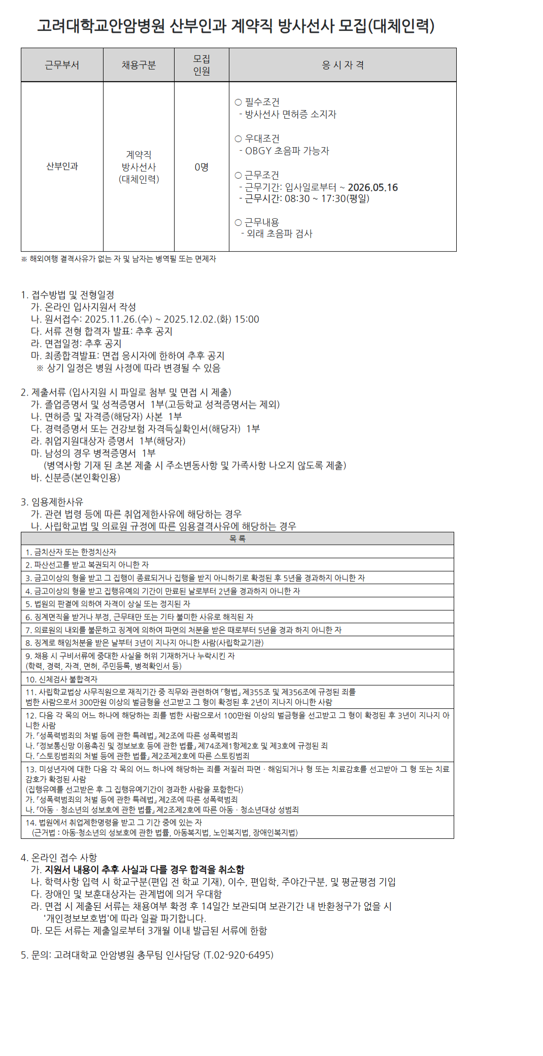 ±Ù¹«ºÎ¼­ ä¿ë±¸ºÐ ¸ðÁý Àοø ÀÀ ½Ã ÀÚ °Ý »êºÎÀΰú °è¾àÁ÷ ¹æ»ç¼±»ç (´ëüÀηÂ) 0¸í ¡Û ÇʼöÁ¶°Ç - ¹æ»ç¼±»ç ¸éÇãÁõ ¼ÒÁöÀÚ ¡Û ¿ì´ëÁ¶°Ç - OBGY ÃÊÀ½ÆÄ °¡´ÉÀÚ ¡Û ±Ù¹«Á¶°Ç - ±Ù¹«±â°£: ÀÔ»çÀϷκÎÅÍ ~ 2026.05.16 - ±Ù¹«½Ã°£: 08:30 ~ 17:30(ÆòÀÏ) ¡Û ±Ù¹«³»¿ë - ¿Ü·¡ ÃÊÀ½ÆÄ °Ë»ç