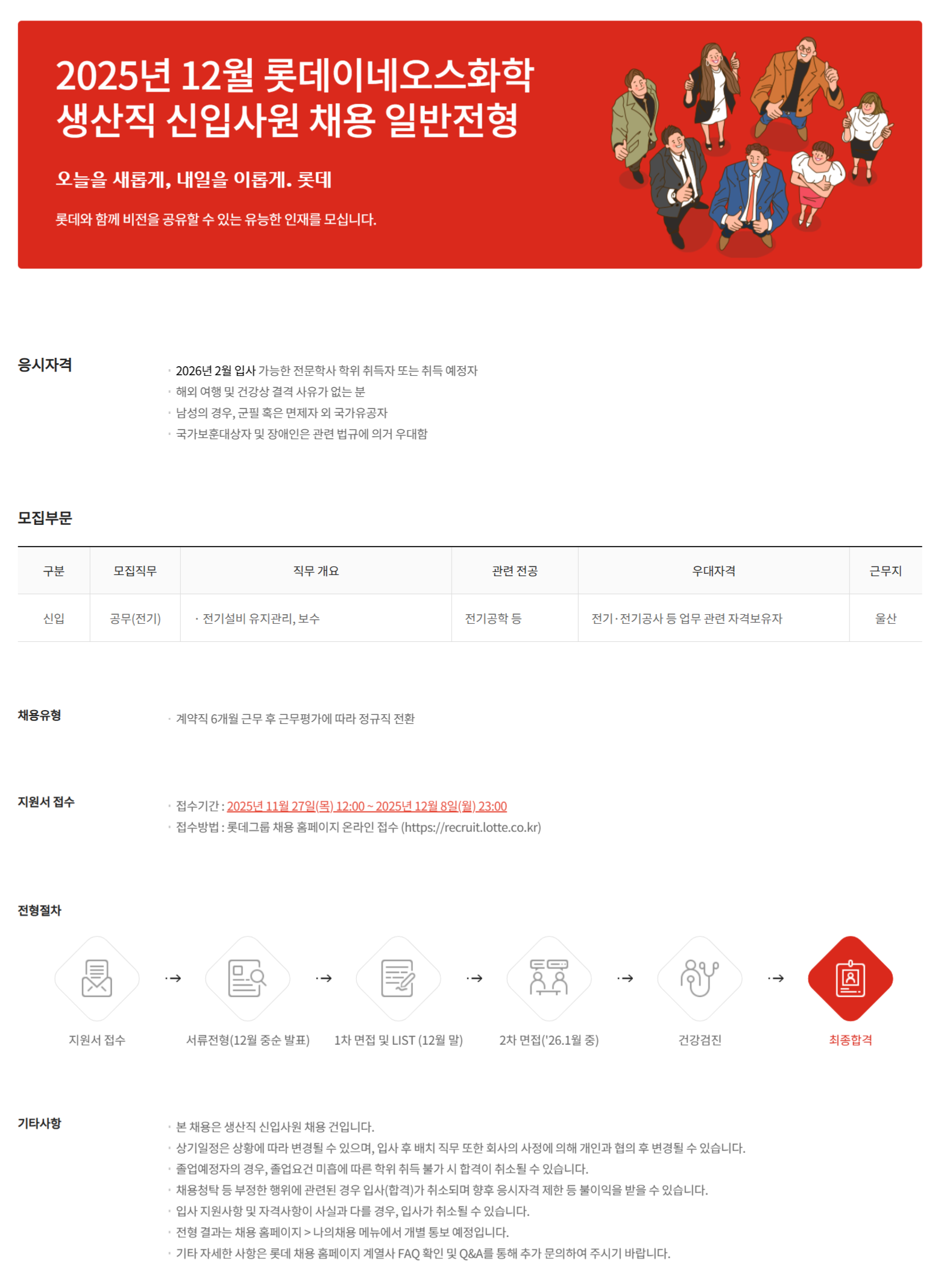 2025³â 12¿ù ·Ôµ¥À̳׿À½ºÈÇÐ »ý»êÁ÷ ½ÅÀÔ»ç¿ø ä¿ë ÀϹÝÀüÇü