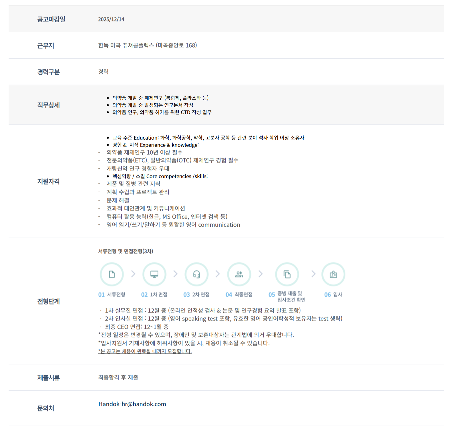 ±Ù¹«Áö Çѵ¶ ¸¶°î Ç»ÃÄÄÞÇ÷º½º (¸¶°îÁß¾Ó·Î 168) °æ·Â±¸ºÐ °æ·Â Á÷¹«»ó¼¼ ÀǾàǰ °³¹ß Áß Á¦Á¦¿¬±¸ (º¹ÇÕÁ¦, Çöó½ºÅ¸ µî) ÀǾàǰ °³¹ß Áß ¹ß»ýµÇ´Â ¿¬±¸¹®¼­ ÀÛ¼º ÀǾàǰ ¿¬±¸, ÀǾàǰ Çã°¡¸¦ À§ÇÑ CTD ÀÛ¼º ¾÷¹« Áö¿øÀÚ°Ý ±³À° ¼öÁØ Education: È­ÇÐ, È­ÇаøÇÐ, ¾àÇÐ, °íºÐÀÚ °øÇÐ µî °ü·Ã ºÐ¾ß ¼®»ç ÇÐÀ§ ÀÌ»ó ¼ÒÀ¯ÀÚ °æÇè & Áö½Ä Experience & knowledge: - ÀǾàǰ Á¦Á¦¿¬±¸ 10³â ÀÌ»ó Çʼö - Àü¹®ÀǾàǰ(ETC), ÀϹÝÀǾàǰ(OTC) Á¦Á¦¿¬±¸ °æÇè Çʼö - °³·®½Å¾à ¿¬±¸ °æÇèÀÚ ¿ì´ë Çٽɿª·® / ½ºÅ³ Core competencies /skills: - Á¦Ç° ¹× Áúº´ °ü·Ã Áö½Ä - °èȹ ¼ö¸³°ú ÇÁ·ÎÁ§Æ® °ü¸® - ¹®Á¦ ÇØ°á - È¿°úÀû ´ëÀΰü°è ¹× Ä¿¹Â´ÏÄÉÀÌ¼Ç - ÄÄÇ»ÅÍ È°¿ë ´É·Â(ÇѱÛ, MS Office, ÀÎÅÍ³Ý °Ë»ö µî) - ¿µ¾î Àбâ/¾²±â/¸»ÇÏ±â µî ¿øÈ°ÇÑ ¿µ¾î communication