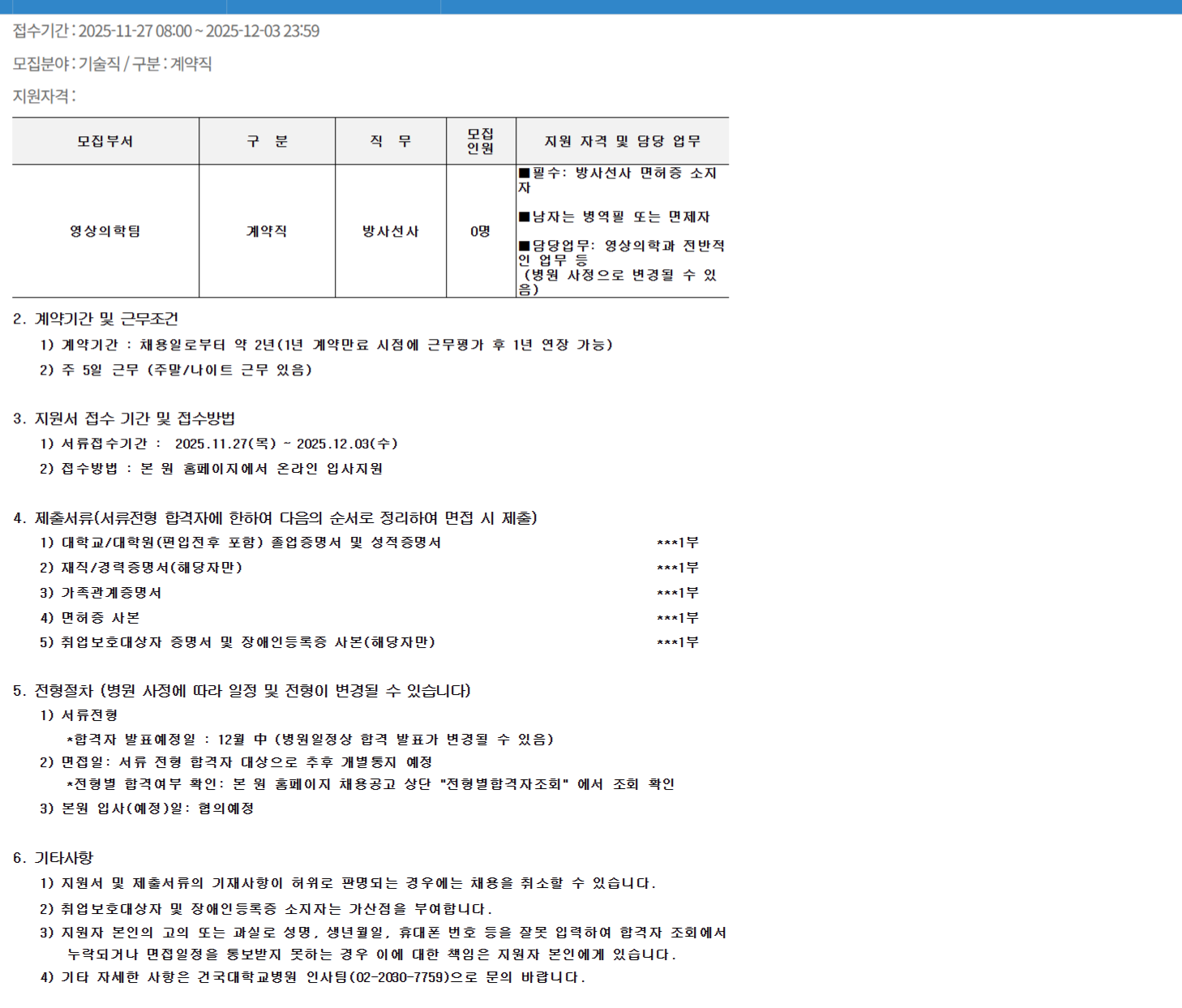 ¸ðÁýºÎ¼ ±¸ ºÐ Á÷ ¹« ¸ðÁý Àοø Áö¿ø ÀÚ°Ý ¹× ´ã´ç ¾÷¹« ¿µ»óÀÇÇÐÆÀ °è¾àÁ÷ ¹æ»ç¼±»ç 0¸í ¡áÇʼö: ¹æ»ç¼±»ç ¸éÇãÁõ ¼ÒÁöÀÚ ¡á³²ÀÚ´Â º´¿ªÇÊ ¶Ç´Â ¸éÁ¦ÀÚ ¡á´ã´ç¾÷¹«: ¿µ»óÀÇÇаú Àü¹ÝÀûÀÎ ¾÷¹« µî (º´¿ø »çÁ¤À¸·Î º¯°æµÉ ¼ö ÀÖÀ½)