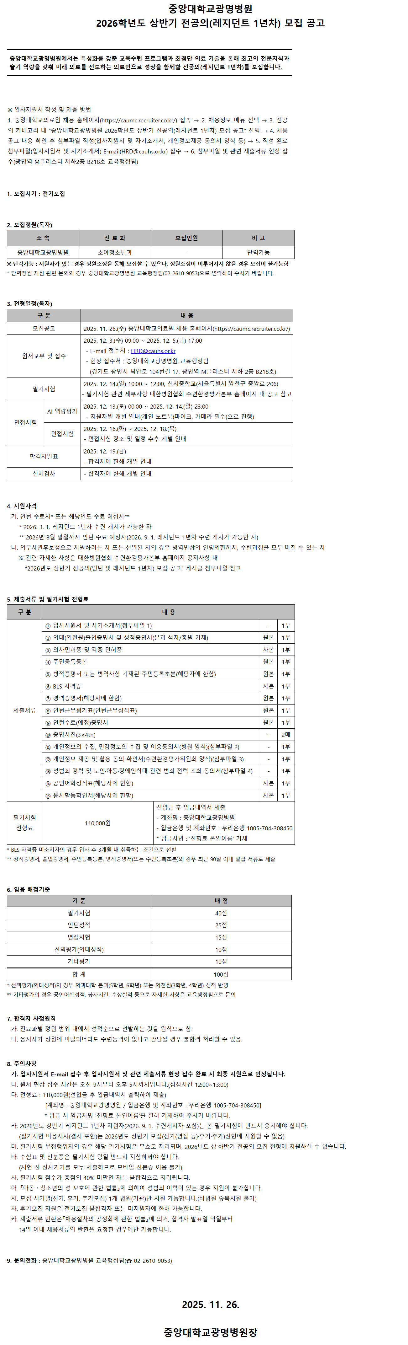 1. Áß¾Ó´ëÇб³ÀÇ·á¿ø ä¿ë ȨÆäÀÌÁö(https://caumc.recruiter.co.kr/) Á¢¼Ó ¡æ 2. ä¿ëÁ¤º¸ ¸Þ´º ¼±Åà ¡æ 3. Àü°øÀÇ Ä«Å×°í¸® ³» ¡°Áß¾Ó´ëÇб³±¤¸íº´¿ø 2026Çг⵵ »ó¹Ý±â Àü°øÀÇ(·¹Áö´øÆ® 1³âÂ÷) ¸ðÁý °ø°í¡± ¼±Åà ¡æ 4. ä¿ë°ø°í ³»¿ë È®ÀÎ ÈÄ Ã·ºÎÆÄÀÏ ÀÛ¼º(ÀÔ»çÁö¿ø¼ ¹× ÀÚ±â¼Ò°³¼, °³ÀÎÁ¤º¸Á¦°ø µ¿ÀǼ ¾ç½Ä µî) ¡æ 5. ÀÛ¼º ¿Ï·á ÷ºÎÆÄÀÏ(ÀÔ»çÁö¿ø¼ ¹× ÀÚ±â¼Ò°³¼) E-mail(HRD@cauhs.or.kr******@*******.***) Á¢¼ö ¡æ 6. ÷ºÎÆÄÀÏ ¹× °ü·Ã Á¦Ãâ¼·ù ÇöÀå Á¢¼ö(±¤¸í¿ª MŬ·¯½ºÅÍ ÁöÇÏ2Ãþ B218È£ ±³À°ÇàÁ¤ÆÀ)