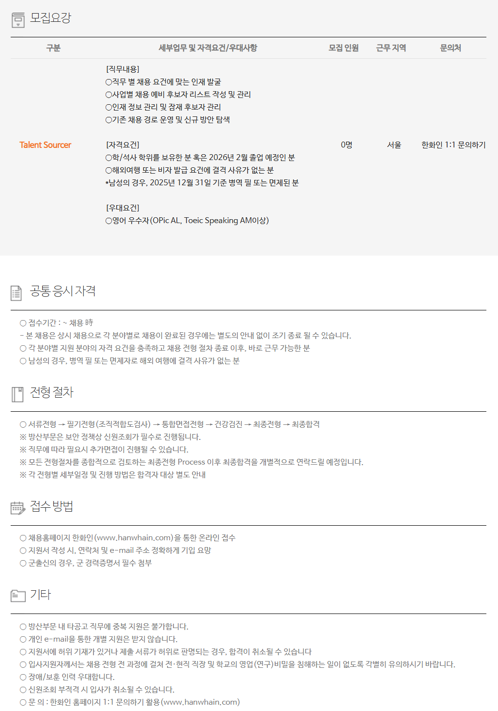 ±¸ºÐ ¼¼ºÎ¾÷¹« ¹× ÀÚ°Ý¿ä°Ç/¿ì´ë»çÇ× ¸ðÁý Àοø ±Ù¹« Áö¿ª ¹®ÀÇó Talent Sourcer [Á÷¹«³»¿ë] ¡ÛÁ÷¹« º° ä¿ë ¿ä°Ç¿¡ ¸Â´Â ÀÎÀç ¹ß±¼ ¡Û»ç¾÷º° ä¿ë ¿¹ºñ Èĺ¸ÀÚ ¸®½ºÆ® ÀÛ¼º ¹× °ü¸® ¡ÛÀÎÀç Á¤º¸ °ü¸® ¹× ÀáÀç Èĺ¸ÀÚ °ü¸® ¡Û±âÁ¸ ä¿ë °æ·Î ¿î¿µ ¹× ½Å±Ô ¹æ¾È Ž»ö [ÀÚ°Ý¿ä°Ç] ¡ÛÇÐ/¼®»ç ÇÐÀ§¸¦ º¸À¯ÇÑ ºÐ ȤÀº 2026³â 2¿ù Á¹¾÷ ¿¹Á¤ÀÎ ºÐ ¡ÛÇØ¿Ü¿©Çà ¶Ç´Â ºñÀÚ ¹ß±Þ ¿ä°Ç¿¡ °á°Ý »çÀ¯°¡ ¾ø´Â ºÐ *³²¼ºÀÇ °æ¿ì, 2025³â 12¿ù 31ÀÏ ±âÁØ º´¿ª ÇÊ ¶Ç´Â ¸éÁ¦µÈ ºÐ [¿ì´ë¿ä°Ç] ¡Û¿µ¾î ¿ì¼öÀÚ(OPic AL, Toeic Speaking AMÀÌ»ó) 0¸í ¼­¿ï ÇÑÈ­ÀÎ 1:1 ¹®ÀÇÇϱâ