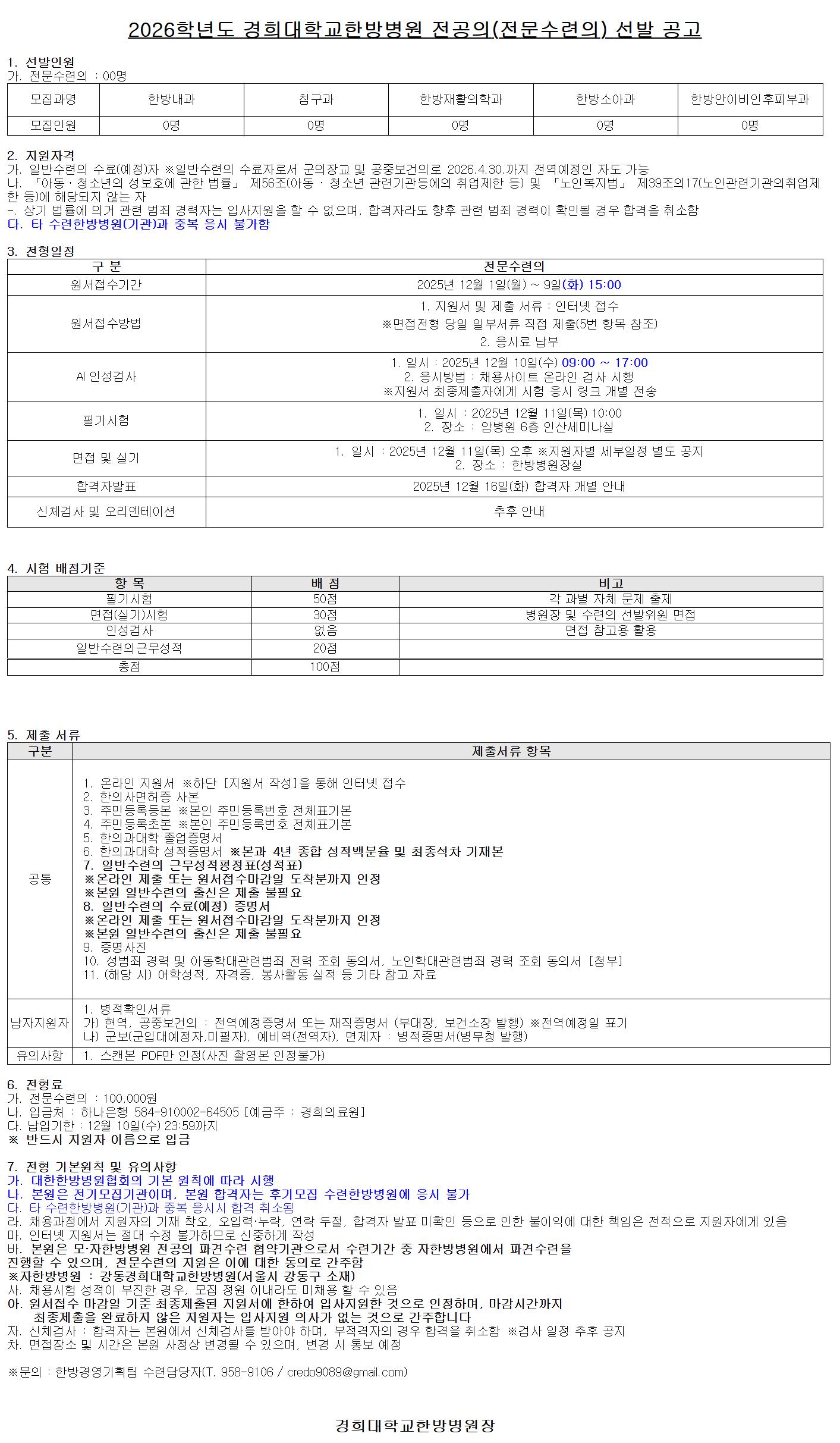 2026Çг⵵ °æÈñ´ëÇб³Çѹ溴¿ø Àü°øÀÇ(Àü¹®¼ö·ÃÀÇ) ¼±¹ß °ø°í
