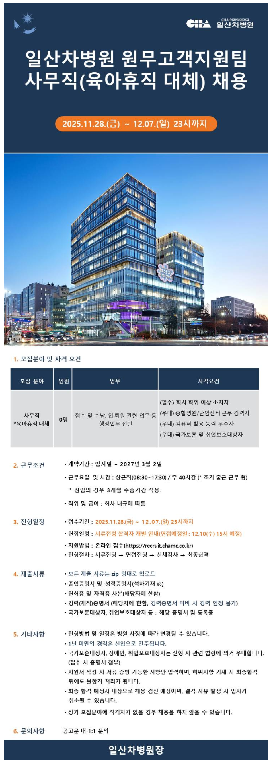 [ÀÏ»êÂ÷º´¿ø] ÀÏ»êÂ÷º´¿ø ¿ø¹«°í°´Áö¿øÆÀ(»ç¹«Á÷, À°¾ÆÈÞÁ÷ ´ëü) ä¿ë