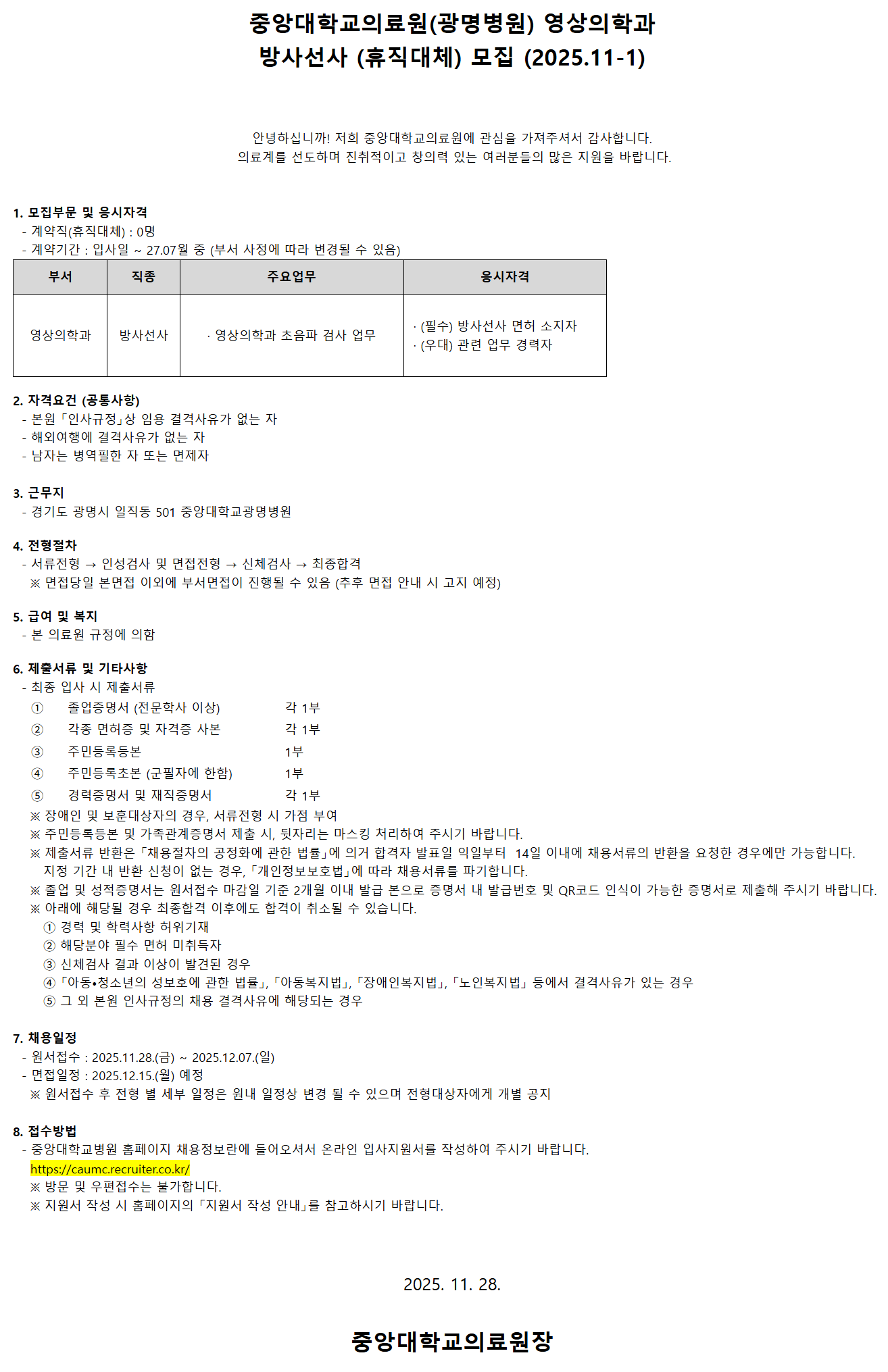 Áß¾Ó´ëÇб³ÀÇ·á¿ø(±¤¸íº´¿ø) ¿µ»óÀÇÇаú ¹æ»ç¼±»ç (ÈÞÁ÷´ëü) ¸ðÁý (2025.11-1) ¾È³çÇϽʴϱî! ÀúÈñ Áß¾Ó´ëÇб³ÀÇ·á¿ø¿¡ °ü½ÉÀ» °¡Á®Áּż­ °¨»çÇÕ´Ï´Ù. ÀÇ·á°è¸¦ ¼±µµÇϸç ÁøÃëÀûÀ̰í âÀÇ·Â ÀÖ´Â ¿©·¯ºÐµéÀÇ ¸¹Àº Áö¿øÀ» ¹Ù¶ø´Ï´Ù. 1. ¸ðÁýºÎ¹® ¹× ÀÀ½ÃÀÚ°Ý - °è¾àÁ÷(ÈÞÁ÷´ëü) : 0¸í - °è¾à±â°£ : ÀÔ»çÀÏ ~ 27.07¿ù Áß (ºÎ¼­ »çÁ¤¿¡ µû¶ó º¯°æµÉ ¼ö ÀÖÀ½) ºÎ¼­ Á÷Á¾ ÁÖ¿ä¾÷¹« ÀÀ½ÃÀÚ°Ý ¿µ»óÀÇÇаú ¹æ»ç¼±»ç ¡¤ ¿µ»óÀÇÇаú ÃÊÀ½ÆÄ °Ë»ç ¾÷¹« ¡¤ (Çʼö) ¹æ»ç¼±»ç ¸éÇã ¼ÒÁöÀÚ ¡¤ (¿ì´ë) °ü·Ã ¾÷¹« °æ·ÂÀÚ 2. ÀÚ°Ý¿ä°Ç (°øÅë»çÇ×) - º»¿ø ¡¸Àλç±ÔÁ¤¡¹»ó ÀÓ¿ë °á°Ý»çÀ¯°¡ ¾ø´Â ÀÚ - ÇØ¿Ü¿©Çà¿¡ °á°Ý»çÀ¯°¡ ¾ø´Â ÀÚ - ³²ÀÚ´Â º´¿ªÇÊÇÑ ÀÚ ¶Ç´Â ¸éÁ¦ÀÚ 3. ±Ù¹«Áö - °æ±âµµ ±¤¸í½Ã ÀÏÁ÷µ¿ 501 Áß¾Ó´ëÇб³±¤¸íº´¿ø 4. ÀüÇüÀýÂ÷ - ¼­·ùÀüÇü ¡æ Àμº°Ë»ç ¹× ¸éÁ¢ÀüÇü ¡æ ½Åü°Ë»ç ¡æ ÃÖÁ¾ÇÕ°Ý ¡Ø ¸éÁ¢´çÀÏ º»¸éÁ¢ À̿ܿ¡ ºÎ¼­¸éÁ¢ÀÌ ÁøÇàµÉ ¼ö ÀÖÀ½ (ÃßÈÄ ¸éÁ¢ ¾È³» ½Ã °íÁö ¿¹Á¤) 5. ±Þ¿© ¹× º¹Áö - º» ÀÇ·á¿ø ±ÔÁ¤¿¡ ÀÇÇÔ 6. Á¦Ãâ¼­·ù ¹× ±âŸ»çÇ× - ÃÖÁ¾ ÀÔ»ç ½Ã Á¦Ãâ¼­·ù ➀ Á¹¾÷Áõ¸í¼­ (Àü¹®Çлç ÀÌ»ó) °¢ 1ºÎ ➁ °¢Á¾ ¸éÇãÁõ ¹× ÀÚ°ÝÁõ »çº» °¢ 1ºÎ ➂ Áֹεî·Ïµîº» 1ºÎ ➃ Áֹεî·ÏÃʺ» (±ºÇÊÀÚ¿¡ ÇÑÇÔ) 1ºÎ ➄ °æ·ÂÁõ¸í¼­ ¹× ÀçÁ÷Áõ¸í¼­ °¢ 1ºÎ ¡Ø Àå¾ÖÀÎ ¹× º¸ÈÆ´ë»óÀÚÀÇ °æ¿ì, ¼­·ùÀüÇü ½Ã °¡Á¡ ºÎ¿© ¡Ø Áֹεî·Ïµîº» ¹× °¡Á·°ü°èÁõ¸í¼­ Á¦Ãâ ½Ã, µÞÀÚ¸®´Â ¸¶½ºÅ· ó¸®ÇÏ¿© Áֽñ⠹ٶø´Ï´Ù. ¡Ø Á¦Ãâ¼­·ù ¹ÝȯÀº ¡¸Ã¤¿ëÀýÂ÷ÀÇ °øÁ¤È­¿¡ °üÇÑ ¹ý·ü¡¹¿¡ ÀǰŠÇÕ°ÝÀÚ ¹ßÇ¥ÀÏ ÀÍÀϺÎÅÍ 14ÀÏ À̳»¿¡ ä¿ë¼­·ùÀÇ ¹ÝȯÀ» ¿äûÇÑ °æ¿ì¿¡¸¸ °¡´ÉÇÕ´Ï´Ù. ÁöÁ¤ ±â°£ ³» ¹Ýȯ ½ÅûÀÌ ¾ø´Â °æ¿ì, ¡¸°³ÀÎÁ¤º¸º¸È£¹ý¡¹¿¡ µû¶ó ä¿ë¼­·ù¸¦ ÆÄ±âÇÕ´Ï´Ù. ¡Ø Á¹¾÷ ¹× ¼ºÀûÁõ¸í¼­´Â ¿ø¼­Á¢¼ö ¸¶°¨ÀÏ ±âÁØ 2°³¿ù À̳» ¹ß±Þ º»À¸·Î Áõ¸í¼­ ³» ¹ß±Þ¹øÈ£ ¹× QRÄÚµå ÀνÄÀÌ °¡´ÉÇÑ Áõ¸í¼­·Î Á¦ÃâÇØ Áֽñ⠹ٶø´Ï´Ù. ¡Ø ¾Æ·¡¿¡ ÇØ´çµÉ °æ¿ì ÃÖÁ¾ÇÕ°Ý ÀÌÈÄ¿¡µµ ÇÕ°ÝÀÌ Ãë¼ÒµÉ ¼ö ÀÖ½À´Ï´Ù. ➀ °æ·Â ¹× Çз»çÇ× ÇãÀ§±âÀç ➁ ÇØ´çºÐ¾ß Çʼö ¸éÇã ¹ÌÃëµæÀÚ ➂ ½Åü°Ë»ç °á°ú ÀÌ»óÀÌ ¹ß°ßµÈ °æ¿ì ➃ ¡¸¾Æµ¿•û¼Ò³âÀÇ ¼ºº¸È£¿¡ °üÇÑ ¹ý·ü¡¹, ¡¸¾Æµ¿º¹Áö¹ý¡¹, ¡¸Àå¾ÖÀκ¹Áö¹ý¡¹, ¡¸³ëÀκ¹Áö¹ý¡¹ µî¿¡¼­ °á°Ý»çÀ¯°¡ ÀÖ´Â °æ¿ì ➄ ±× ¿Ü º»¿ø Àλç±ÔÁ¤ÀÇ Ã¤¿ë °á°Ý»çÀ¯¿¡ ÇØ´çµÇ´Â °æ¿ì 7. ä¿ëÀÏÁ¤ - ¿ø¼­Á¢¼ö : 2025.11.28.(±Ý) ~ 2025.12.07.(ÀÏ) - ¸éÁ¢ÀÏÁ¤ : 2025.12.15.(¿ù) ¿¹Á¤ ¡Ø ¿ø¼­Á¢¼ö ÈÄ ÀüÇü º° ¼¼ºÎ ÀÏÁ¤Àº ¿ø³» ÀÏÁ¤»ó º¯°æ µÉ ¼ö ÀÖÀ¸¸ç ÀüÇü´ë»óÀÚ¿¡°Ô °³º° °øÁö 8. Á¢¼ö¹æ¹ý - Áß¾Ó´ëÇб³º´¿ø ȨÆäÀÌÁö ä¿ëÁ¤º¸¶õ¿¡ µé¾î¿À¼Å¼­ ¿Â¶óÀÎ ÀÔ»çÁö¿ø¼­¸¦ ÀÛ¼ºÇÏ¿© Áֽñ⠹ٶø´Ï´Ù. https://caumc.recruiter.co.kr/ ¡Ø ¹æ¹® ¹× ¿ìÆíÁ¢¼ö´Â ºÒ°¡ÇÕ´Ï´Ù. ¡Ø Áö¿ø¼­ ÀÛ¼º ½Ã ȨÆäÀÌÁöÀÇ ¡¸Áö¿ø¼­ ÀÛ¼º ¾È³»¡¹¸¦ Âü°íÇϽñ⠹ٶø´Ï´Ù. 2025. 11. 28. Áß¾Ó´ëÇб³ÀÇ·á¿øÀå