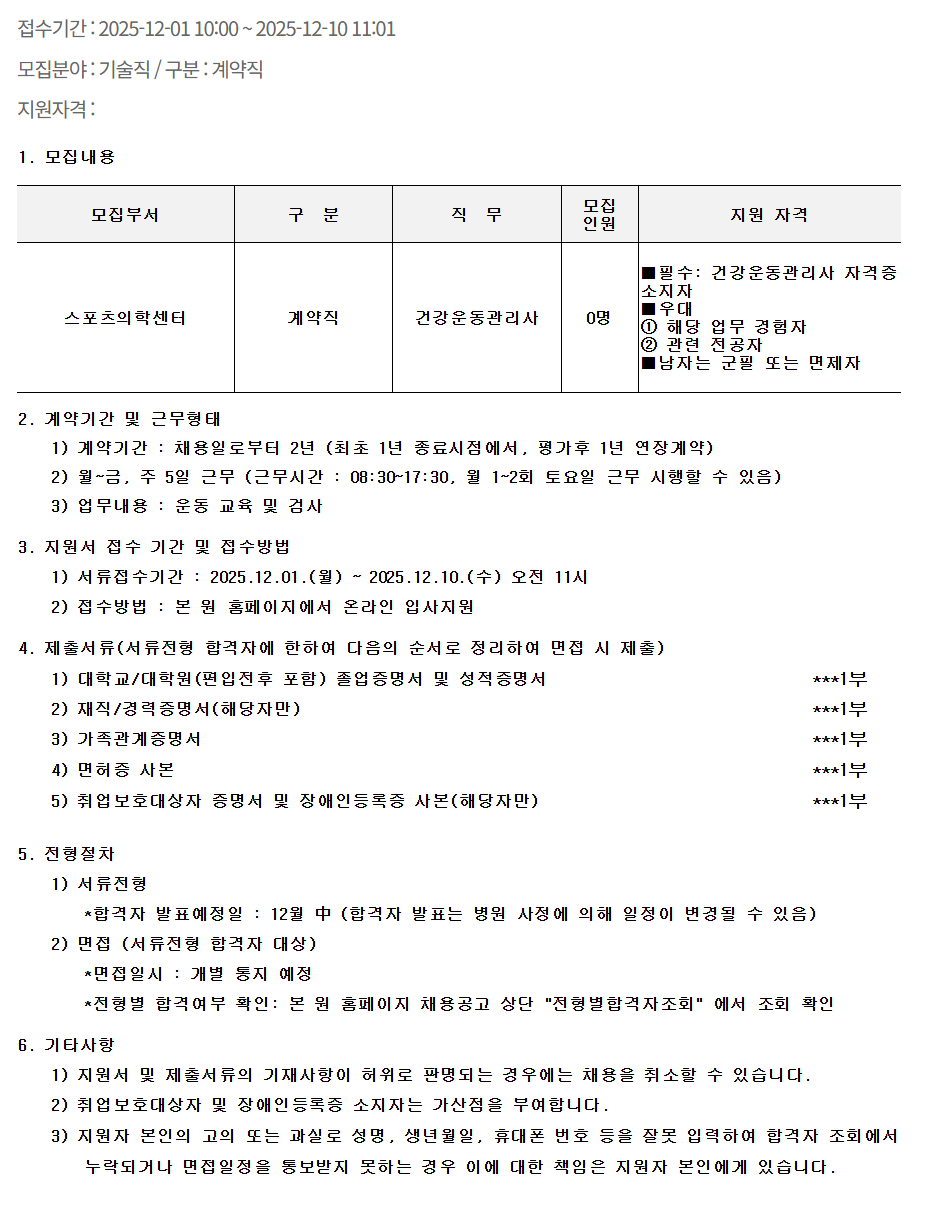 Á¢¼ö±â°£ : 2025-12-01 10:00 ~ 2025-12-10 11:01 ¸ðÁýºÐ¾ß : ±â¼úÁ÷ / ±¸ºÐ : °è¾àÁ÷ Áö¿øÀÚ°Ý : 1. ¸ðÁý³»¿ë ¸ðÁýºÎ¼­ ±¸ ºÐ Á÷ ¹« ¸ðÁý Àοø Áö¿ø ÀÚ°Ý ½ºÆ÷Ã÷ÀÇÇм¾ÅÍ °è¾àÁ÷ °Ç°­¿îµ¿°ü¸®»ç 0¸í ¡áÇʼö: °Ç°­¿îµ¿°ü¸®»ç ÀÚ°ÝÁõ ¼ÒÁöÀÚ ¡á¿ì´ë ¨ç ÇØ´ç ¾÷¹« °æÇèÀÚ ¨è °ü·Ã Àü°øÀÚ ¡á³²ÀÚ´Â ±ºÇÊ ¶Ç´Â ¸éÁ¦ÀÚ 2. °è¾à±â°£ ¹× ±Ù¹«ÇüÅ 1) °è¾à±â°£ : ä¿ëÀϷκÎÅÍ 2³â (ÃÖÃÊ 1³â Á¾·á½ÃÁ¡¿¡¼­, Æò°¡ÈÄ 1³â ¿¬Àå°è¾à) 2) ¿ù~±Ý, ÁÖ 5ÀÏ ±Ù¹« (±Ù¹«½Ã°£ : 08:30~17:30, ¿ù 1~2ȸ Åä¿äÀÏ ±Ù¹« ½ÃÇàÇÒ ¼ö ÀÖÀ½) 3) ¾÷¹«³»¿ë : ¿îµ¿ ±³À° ¹× °Ë»ç 3. Áö¿ø¼­ Á¢¼ö ±â°£ ¹× Á¢¼ö¹æ¹ý 1) ¼­·ùÁ¢¼ö±â°£ : 2025.12.01.(¿ù) ~ 2025.12.10.(¼ö) ¿ÀÀü 11½Ã 2) Á¢¼ö¹æ¹ý : º» ¿ø ȨÆäÀÌÁö¿¡¼­ ¿Â¶óÀÎ ÀÔ»çÁö¿ø 4. Á¦Ãâ¼­·ù(¼­·ùÀüÇü ÇÕ°ÝÀÚ¿¡ ÇÑÇÏ¿© ´ÙÀ½ÀÇ ¼ø¼­·Î Á¤¸®ÇÏ¿© ¸éÁ¢ ½Ã Á¦Ãâ) 1) ´ëÇб³/´ëÇпø(ÆíÀÔÀüÈÄ Æ÷ÇÔ) Á¹¾÷Áõ¸í¼­ ¹× ¼ºÀûÁõ¸í¼­ ***1ºÎ 2) ÀçÁ÷/°æ·ÂÁõ¸í¼­(ÇØ´çÀÚ¸¸) ***1ºÎ 3) °¡Á·°ü°èÁõ¸í¼­ ***1ºÎ 4) ¸éÇãÁõ »çº» ***1ºÎ 5) Ãë¾÷º¸È£´ë»óÀÚ Áõ¸í¼­ ¹× Àå¾ÖÀεî·ÏÁõ »çº»(ÇØ´çÀÚ¸¸) ***1ºÎ 5. ÀüÇüÀýÂ÷ 1) ¼­·ùÀüÇü *ÇÕ°ÝÀÚ ¹ßÇ¥¿¹Á¤ÀÏ : 12¿ù ñé (ÇÕ°ÝÀÚ ¹ßÇ¥´Â º´¿ø »çÁ¤¿¡ ÀÇÇØ ÀÏÁ¤ÀÌ º¯°æµÉ ¼ö ÀÖÀ½) 2) ¸éÁ¢ (¼­·ùÀüÇü ÇÕ°ÝÀÚ ´ë»ó) *¸éÁ¢ÀϽà : °³º° ÅëÁö ¿¹Á¤ *ÀüÇüº° ÇÕ°Ý¿©ºÎ È®ÀÎ: º» ¿ø ȨÆäÀÌÁö ä¿ë°ø°í »ó´Ü "ÀüÇüº°ÇÕ°ÝÀÚÁ¶È¸" ¿¡¼­ Á¶È¸ È®ÀÎ 6. ±âŸ»çÇ× 1) Áö¿ø¼­ ¹× Á¦Ãâ¼­·ùÀÇ ±âÀç»çÇ×ÀÌ ÇãÀ§·Î ÆÇ¸íµÇ´Â °æ¿ì¿¡´Â ä¿ëÀ» Ãë¼ÒÇÒ ¼ö ÀÖ½À´Ï´Ù. 2) Ãë¾÷º¸È£´ë»óÀÚ ¹× Àå¾ÖÀεî·ÏÁõ ¼ÒÁöÀÚ´Â °¡»êÁ¡À» ºÎ¿©ÇÕ´Ï´Ù. 3) Áö¿øÀÚ º»ÀÎÀÇ °íÀÇ ¶Ç´Â °ú½Ç·Î ¼º¸í, »ý³â¿ùÀÏ, ÈÞ´ëÆù ¹øÈ£ µîÀ» À߸ø ÀÔ·ÂÇÏ¿© ÇÕ°ÝÀÚ Á¶È¸¿¡¼­ ´©¶ôµÇ°Å³ª ¸éÁ¢ÀÏÁ¤À» Å뺸¹ÞÁö ¸øÇÏ´Â °æ¿ì ÀÌ¿¡ ´ëÇÑ Ã¥ÀÓÀº Áö¿øÀÚ º»Àο¡°Ô ÀÖ½À´Ï´Ù.