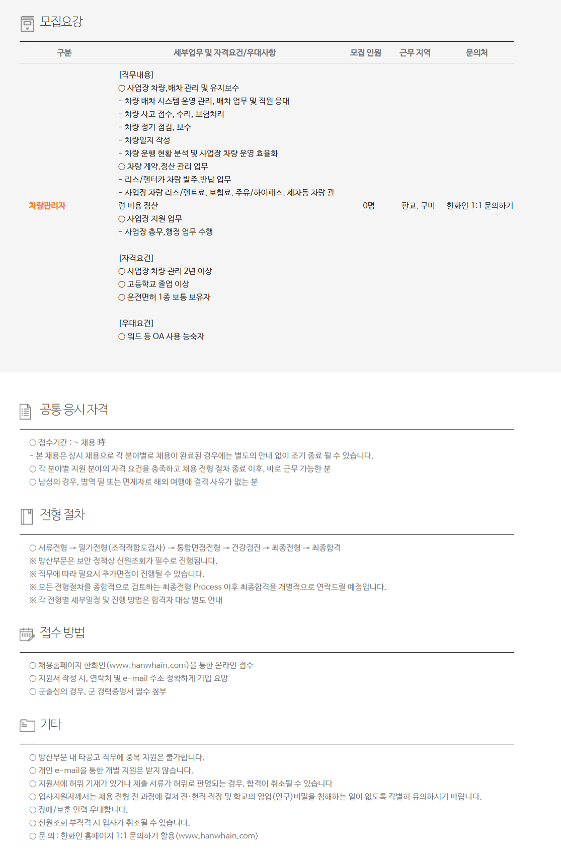 Â÷·®°ü¸®ÀÚ [Á÷¹«³»¿ë] ¡Û »ç¾÷Àå Â÷·®,¹èÂ÷ °ü¸® ¹× À¯Áöº¸¼ö - Â÷·® ¹èÂ÷ ½Ã½ºÅÛ ¿î¿µ °ü¸®, ¹èÂ÷ ¾÷¹« ¹× Á÷¿ø ÀÀ´ë - Â÷·® »ç°í Á¢¼ö, ¼ö¸®, º¸Çèó¸® - Â÷·® Á¤±â Á¡°Ë, º¸¼ö - Â÷·®ÀÏÁö ÀÛ¼º - Â÷·® ¿îÇà ÇöȲ ºÐ¼® ¹× »ç¾÷Àå Â÷·® ¿î¿µ È¿À²È­ ¡Û Â÷·® °è¾à,Á¤»ê °ü¸® ¾÷¹« - ¸®½º/·»ÅÍÄ« Â÷·® ¹ßÁÖ,¹Ý³³ ¾÷¹« - »ç¾÷Àå Â÷·® ¸®½º/·»Æ®·á, º¸Çè·á, ÁÖÀ¯/ÇÏÀÌÆÐ½º, ¼¼Â÷µî Â÷·® °ü·Ã ºñ¿ë Á¤»ê ¡Û »ç¾÷Àå Áö¿ø ¾÷¹« - »ç¾÷Àå Ãѹ«,ÇàÁ¤ ¾÷¹« ¼öÇà [ÀÚ°Ý¿ä°Ç] ¡Û »ç¾÷Àå Â÷·® °ü¸® 2³â ÀÌ»ó ¡Û °íµîÇб³ Á¹¾÷ ÀÌ»ó ¡Û ¿îÀü¸éÇã 1Á¾ º¸Åë º¸À¯ÀÚ [¿ì´ë¿ä°Ç] ¡Û ¿öµå µî OA »ç¿ë ´É¼÷ÀÚ 0¸í ÆÇ±³, ±¸¹Ì ÇÑÈ­ÀÎ 1:1 ¹®ÀÇÇϱâ