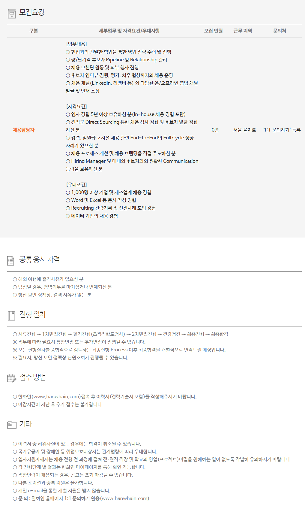 ±¸ºÐ ¼¼ºÎ¾÷¹« ¹× ÀÚ°Ý¿ä°Ç/¿ì´ë»çÇ× ¸ðÁý Àοø ±Ù¹« Áö¿ª ¹®ÀÇó ä¿ë´ã´çÀÚ [¾÷¹«³»¿ë] ¡Û Çö¾÷°úÀÇ ±ä¹ÐÇÑ Çù¾÷À» ÅëÇÑ ¿µÀÔ Àü·« ¼ö¸³ ¹× ÁøÇà ¡Û Àå/´Ü±âÀû Èĺ¸ÀÚ Pipeline ¹× Relationship °ü¸® ¡Û ä¿ë ºê·£µù Ȱµ¿ ¹× ¿ÜºÎ Çà»ç ÁøÇà ¡Û Èĺ¸ÀÚ ÀÎÅͺä ÁøÇà, Æò°¡, ó¿ì Çù»ó±îÁöÀÇ Ã¤¿ë ¿î¿µ ¡Û ä¿ë ä³Î(LinkedIn, ¸®¸â¹ö µî) ¿Ü ´Ù¾çÇÑ ¿Â/¿ÀÇÁ¶óÀÎ ¿µÀÔ Ã¤³Î ¹ß±¼ ¹× ÀÎÀç ¼Ò½Ì [ÀÚ°Ý¿ä°Ç] ¡Û ÀÎ»ç °æÇè 5³â ÀÌ»ó º¸À¯ÇϽŠºÐ(In-house ä¿ë °æÇè Æ÷ÇÔ) ¡Û ÀüÁ÷±º Direct Sourcing ÅëÇÑ Ã¤¿ë ¼º»ç °æÇè ¹× Èĺ¸ÀÚ ¹ß±¼ °æÇèÇϽŠºÐ ¡Û °æ·Â, ÀÓ¿ø±Þ Æ÷Áö¼Ç ä¿ë °ü·Ã End-to-EndÀÇ Full Cycle ¼º°ø »ç·Ê°¡ ÀÖÀ¸½Å ºÐ ¡Û ä¿ë ÇÁ·Î¼¼½º °³¼± ¹× ä¿ë ºê·£µùÀ» Á÷Á¢ ÁÖµµÇϽŠºÐ ¡Û Hiring Manager ¹× ´ë³»¿Ü Èĺ¸ÀÚ¿ÍÀÇ ¿øÈ°ÇÑ Communication ´É·ÂÀ» º¸À¯ÇϽŠºÐ [¿ì´ëÁ¶°Ç] ¡Û 1,000¸í ÀÌ»ó ±â¾÷ ¹× Á¦Á¶¾÷°è ä¿ë °æÇè ¡Û Word ¹× Excel µî ¹®¼­ ÀÛ¼º °æÇè ¡Û Recruiting Àü·«±âȹ ¹× ¼±Áø»ç·Ê µµÀÔ °æÇè ¡Û µ¥ÀÌÅÍ ±â¹ÝÀÇ Ã¤¿ë °æÇè 0¸í ¼­¿ï À»Áö·Î '1:1 ¹®ÀÇÇϱâ' µî·Ï
