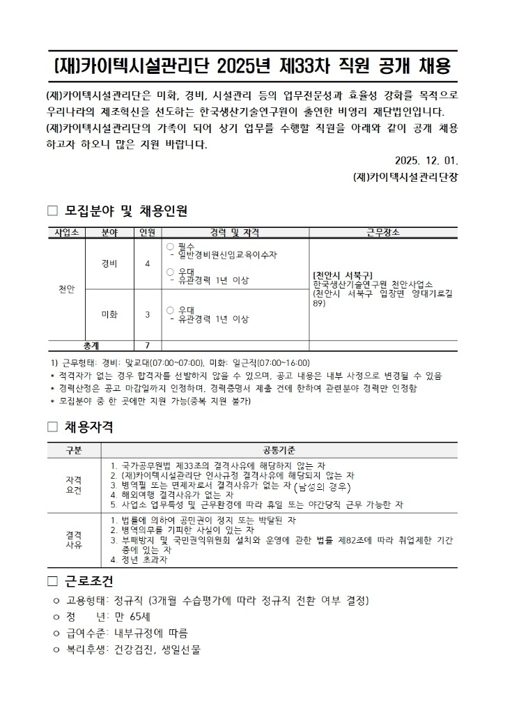 (Àç)Ä«ÀÌÅØ½Ã¼³°ü¸®´Ü 2025³â Á¦33Â÷ Á÷¿ø °ø°³Ã¤¿ë