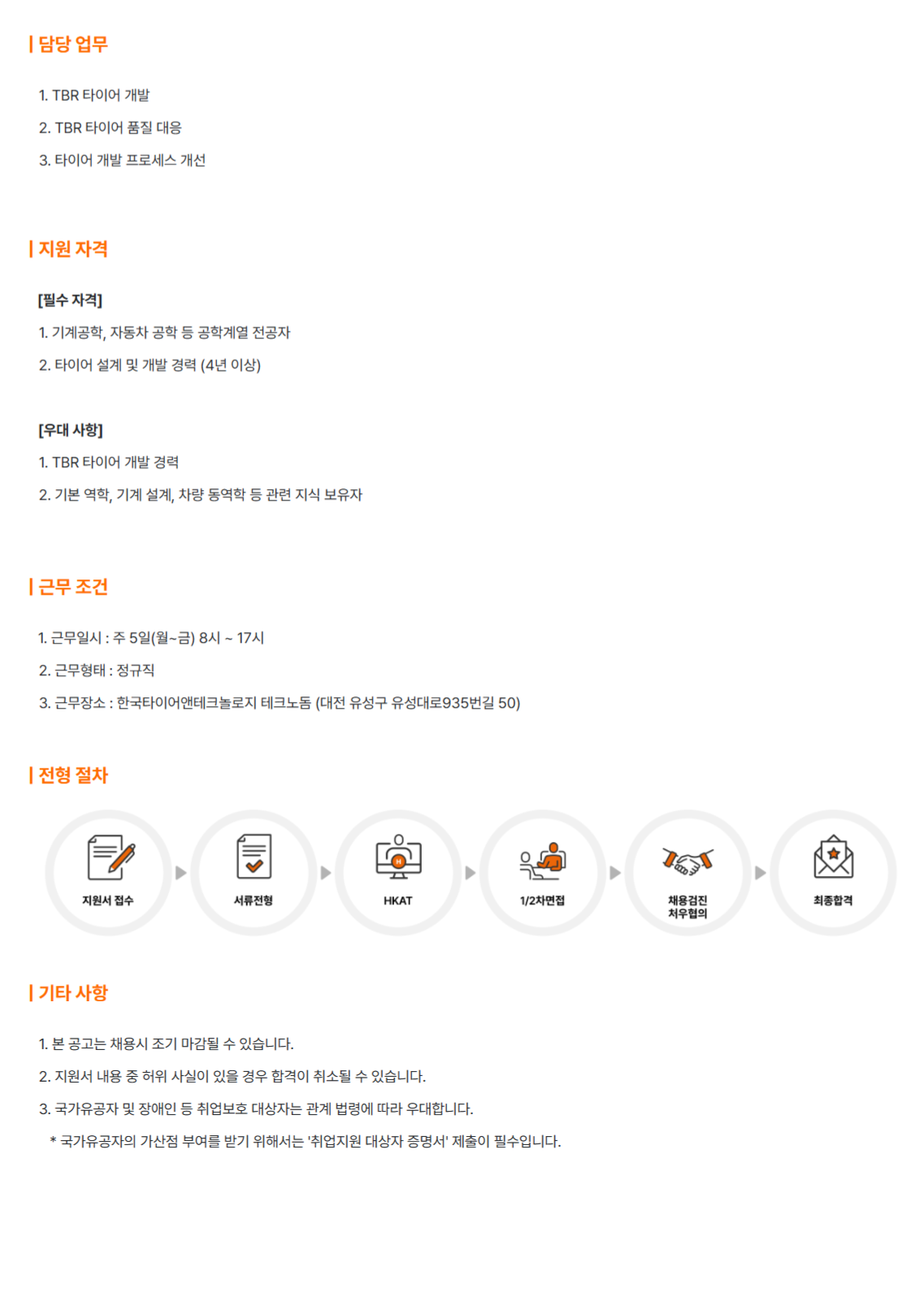| ´ã´ç ¾÷¹« 1. TBR ŸÀÌ¾î °³¹ß 2. TBR ŸÀ̾î ǰÁú ´ëÀÀ 3. ŸÀÌ¾î °³¹ß ÇÁ·Î¼¼½º °³¼± | Áö¿ø ÀÚ°Ý [Çʼö ÀÚ°Ý] 1. ±â°è°øÇÐ, ÀÚµ¿Â÷ °øÇÐ µî °øÇа迭 Àü°øÀÚ 2. ŸÀÌ¾î ¼³°è ¹× °³¹ß °æ·Â (4³â ÀÌ»ó) [¿ì´ë »çÇ×] 1. TBR ŸÀÌ¾î °³¹ß °æ·Â 2. ±âº» ¿ªÇÐ, ±â°è ¼³°è, Â÷·® µ¿¿ªÇÐ µî °ü·Ã Áö½Ä º¸À¯ÀÚ | ±Ù¹« Á¶°Ç 1. ±Ù¹«ÀϽà : ÁÖ 5ÀÏ(¿ù~±Ý) 8½Ã ~ 17½Ã 2. ±Ù¹«ÇüÅ : Á¤±ÔÁ÷ 3. ±Ù¹«Àå¼Ò : Çѱ¹Å¸ÀÌ¾î¾ØÅ×Å©³î·ÎÁö Å×Å©³ëµ¼ (´ëÀü À¯¼º±¸ À¯¼º´ë·Î935¹ø±æ 50)