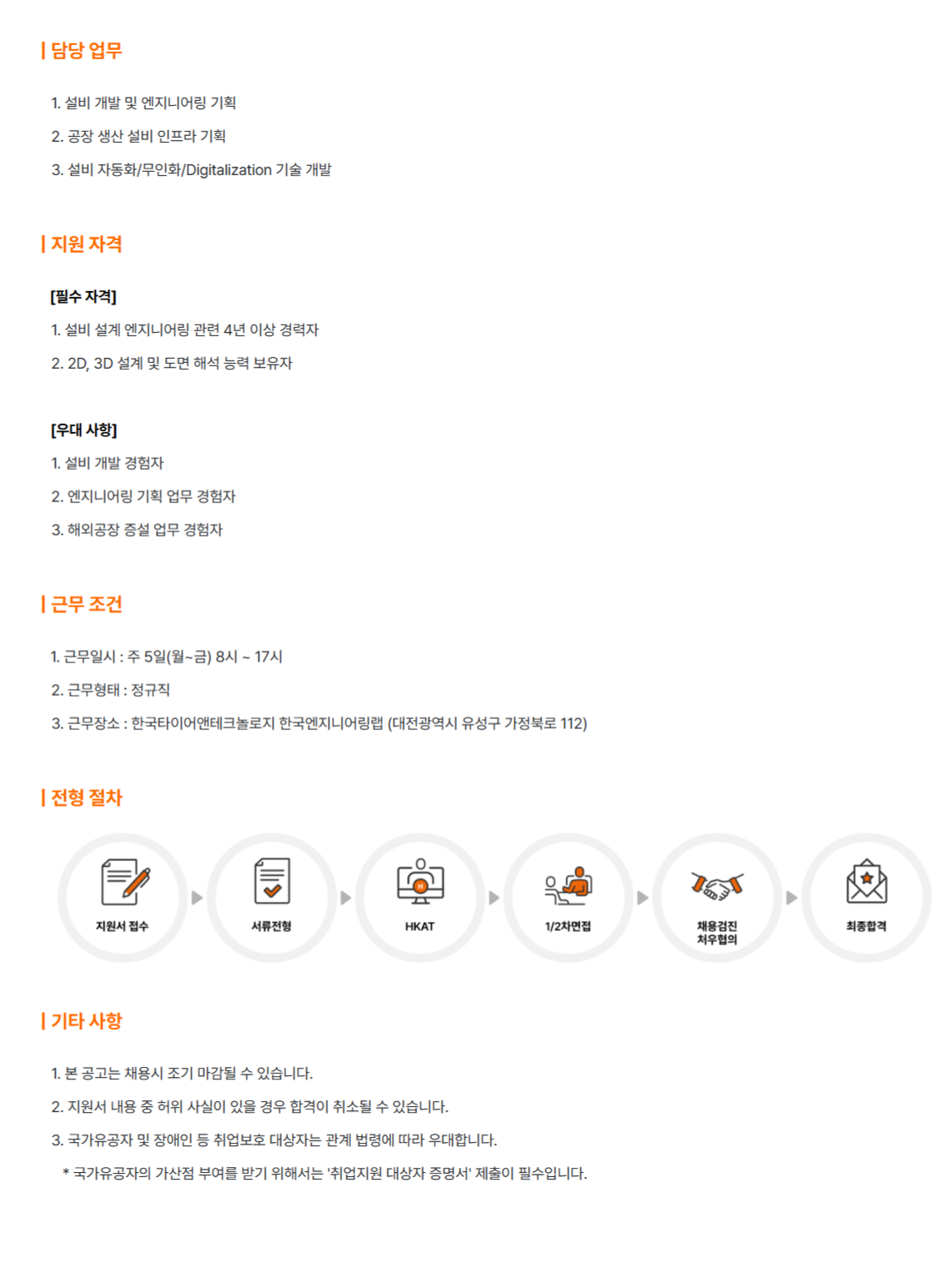 | ´ã´ç ¾÷¹« 1. ¼³ºñ °³¹ß ¹× ¿£Áö´Ï¾î¸µ ±âȹ 2. °øÀå »ý»ê ¼³ºñ ÀÎÇÁ¶ó ±âȹ 3. ¼³ºñ ÀÚµ¿È­/¹«ÀÎÈ­/Digitalization ±â¼ú °³¹ß | Áö¿ø ÀÚ°Ý [Çʼö ÀÚ°Ý] 1. ¼³ºñ ¼³°è ¿£Áö´Ï¾î¸µ °ü·Ã 4³â ÀÌ»ó °æ·ÂÀÚ 2. 2D, 3D ¼³°è ¹× µµ¸é ÇØ¼® ´É·Â º¸À¯ÀÚ [¿ì´ë »çÇ×] 1. ¼³ºñ °³¹ß °æÇèÀÚ 2. ¿£Áö´Ï¾î¸µ ±âȹ ¾÷¹« °æÇèÀÚ 3. ÇØ¿Ü°øÀå Áõ¼³ ¾÷¹« °æÇèÀÚ | ±Ù¹« Á¶°Ç 1. ±Ù¹«ÀϽà : ÁÖ 5ÀÏ(¿ù~±Ý) 8½Ã ~ 17½Ã 2. ±Ù¹«ÇüÅ : Á¤±ÔÁ÷ 3. ±Ù¹«Àå¼Ò : Çѱ¹Å¸ÀÌ¾î¾ØÅ×Å©³î·ÎÁö Çѱ¹¿£Áö´Ï¾î¸µ·¦ (´ëÀü±¤¿ª½Ã À¯¼º±¸ °¡Á¤ºÏ·Î 112)