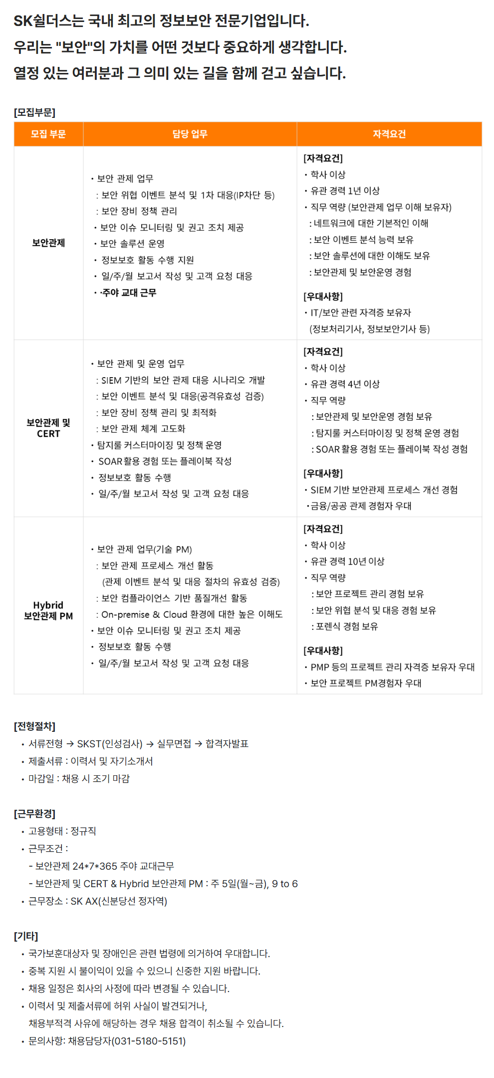 º¸¾È°üÁ¦ & º¸¾È°üÁ¦ ¹× CERT & Hybridº¸¾È°üÁ¦ PM °æ·ÂÁ÷ ä¿ë(SK AX ±Ù¹«)