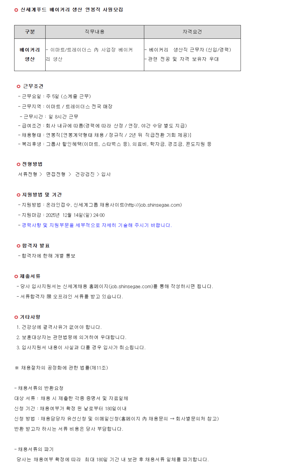 (ÁÖ)½Å¼¼°èǪµå º£ÀÌÄ¿¸® »ý»ê ¿¬ºÀÁ÷ »ç¿ø¸ðÁý