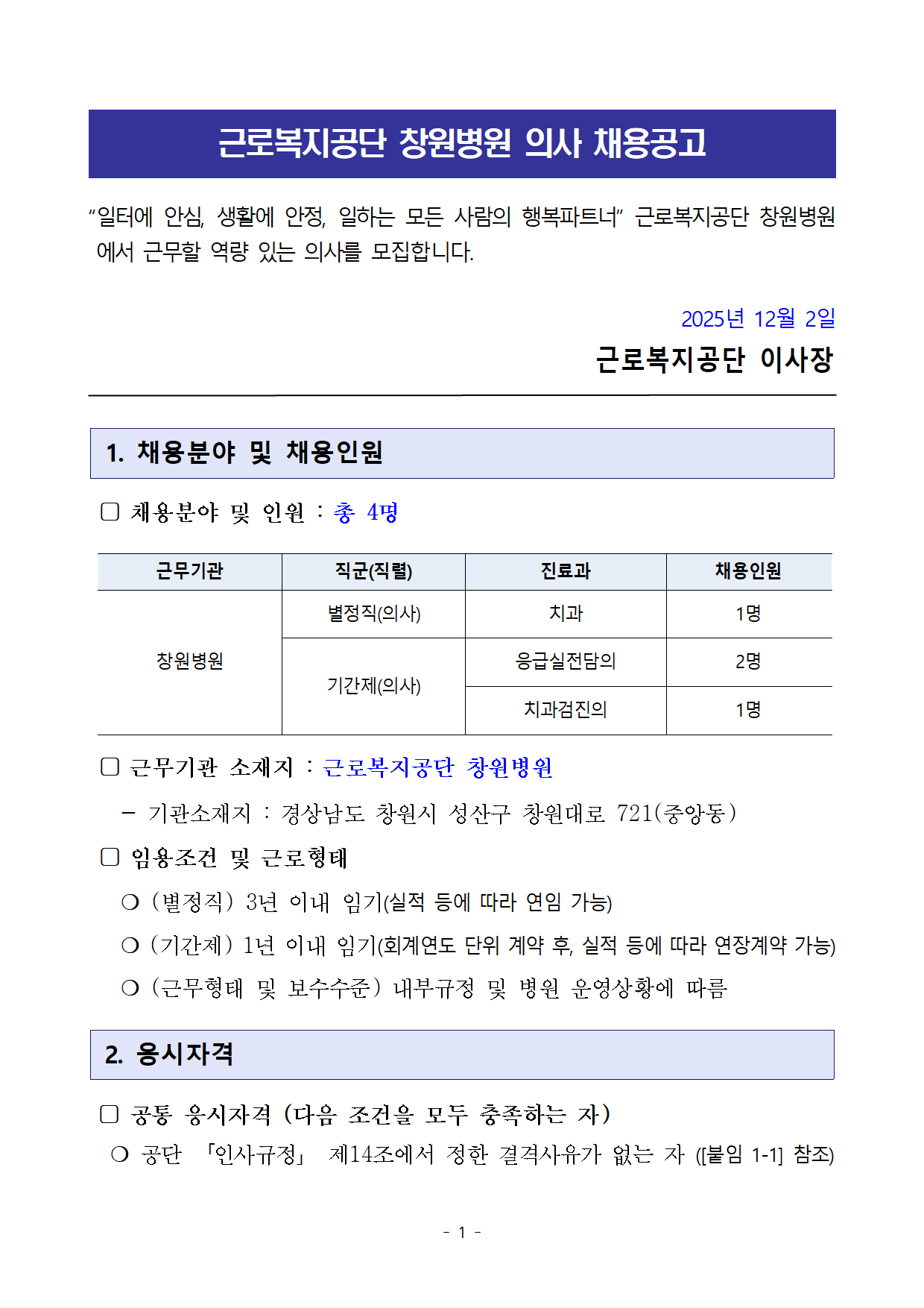 ¡°ÀÏÅÍ¿¡ ¾È½É, »ýȰ¿¡ ¾ÈÁ¤, ÀÏÇÏ´Â ¸ðµç »ç¶÷ÀÇ ÇູÆÄÆ®³Ê¡± ±Ù·Îº¹Áö°ø´Ü â¿øº´¿ø ¿¡¼ ±Ù¹«ÇÒ ¿ª·® ÀÖ´Â Àǻ縦 ¸ðÁýÇÕ´Ï´Ù. 2025³â 12¿ù 2ÀÏ ±Ù·Îº¹Áö°ø´Ü ÀÌ»çÀå 1. ä¿ëºÐ¾ß ¹× ä¿ëÀοø ▢ ä¿ëºÐ¾ß ¹× Àοø : ÃÑ 4¸í ±Ù¹«±â°ü Á÷±º(Á÷·Ä) Áø·á°ú ä¿ëÀοø â¿øº´¿ø º°Á¤Á÷(ÀÇ»ç) Ä¡°ú 1¸í ±â°£Á¦(ÀÇ»ç) ÀÀ±Þ½ÇÀü´ãÀÇ 2¸í Ä¡°ú°ËÁøÀÇ 1¸í ▢ ±Ù¹«±â°ü ¼ÒÀçÁö : ±Ù·Îº¹Áö°ø´Ü â¿øº´¿ø - ±â°ü¼ÒÀçÁö : °æ»ó³²µµ â¿ø½Ã ¼º»ê±¸ â¿ø´ë·Î 721(Áß¾Óµ¿) ▢ ÀÓ¿ëÁ¶°Ç ¹× ±Ù·ÎÇüÅ ❍ (º°Á¤Á÷) 3³â À̳» ÀÓ±â(½ÇÀû µî¿¡ µû¶ó ¿¬ÀÓ °¡´É) ❍ (±â°£Á¦) 1³â À̳» ÀÓ±â(ȸ°è¿¬µµ ´ÜÀ§ °è¾à ÈÄ, ½ÇÀû µî¿¡µû¶ó¿¬Àå°è¾à°¡´É) ❍ (±Ù¹«ÇüÅ ¹× º¸¼ö¼öÁØ) ³»ºÎ±ÔÁ¤ ¹× º´¿ø ¿î¿µ»óȲ¿¡ µû¸§