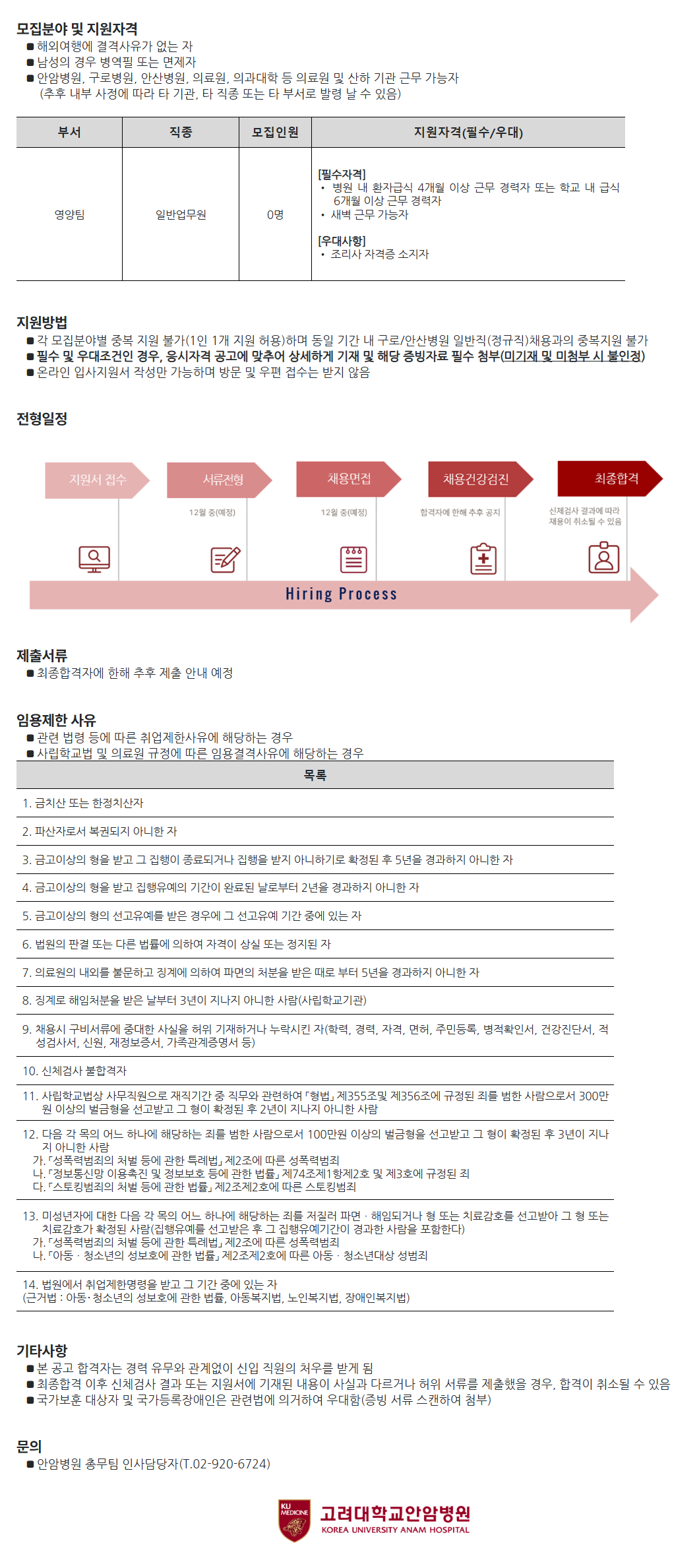 °í·Á´ëÇб³ÀÇ·á¿ø(¾È¾Ïº´¿ø) ½Å±Ô ±³Á÷¿ø(Á¤±ÔÁ÷) ¸ðÁý(¿µ¾çÆÀ) ¸ðÁýºÐ¾ß ¹× Áö¿øÀÚ°Ý ¡á ÇØ¿Ü¿©Çà¿¡ °á°Ý»çÀ¯°¡ ¾ø´Â ÀÚ ¡á ³²¼ºÀÇ °æ¿ì º´¿ªÇÊ ¶Ç´Â ¸éÁ¦ÀÚ ¡á ¾È¾Ïº´¿ø, ±¸·Îº´¿ø, ¾È»êº´¿ø, ÀÇ·á¿ø, Àǰú´ëÇÐ µî ÀÇ·á¿ø ¹× »êÇÏ ±â°ü ±Ù¹« °¡´ÉÀÚ (ÃßÈÄ ³»ºÎ »çÁ¤¿¡ µû¶ó Ÿ ±â°ü, Ÿ Á÷Á¾ ¶Ç´Â Ÿ ºÎ¼­·Î ¹ß·É ³¯ ¼ö ÀÖÀ½) ºÎ¼­ Á÷Á¾ ¸ðÁýÀοø Áö¿øÀÚ°Ý(Çʼö/¿ì´ë) ¿µ¾çÆÀ ÀϹݾ÷¹«¿ø 0¸í [ÇʼöÀÚ°Ý] • º´¿ø ³» ȯÀÚ±Þ½Ä 4°³¿ù ÀÌ»ó ±Ù¹« °æ·ÂÀÚ ¶Ç´Â Çб³ ³» ±Þ½Ä 6°³¿ù ÀÌ»ó ±Ù¹« °æ·ÂÀÚ • »õº® ±Ù¹« °¡´ÉÀÚ [¿ì´ë»çÇ×] • Á¶¸®»ç ÀÚ°ÝÁõ ¼ÒÁöÀÚ Áö¿ø¹æ¹ý ¡á °¢ ¸ðÁýºÐ¾ßº° Áߺ¹ Áö¿ø ºÒ°¡(1ÀÎ 1°³ Áö¿ø Çã¿ë)ÇÏ¸ç µ¿ÀÏ ±â°£ ³» ±¸·Î/¾È»êº´¿ø ÀϹÝÁ÷(Á¤±ÔÁ÷)ä¿ë°úÀÇ Áߺ¹Áö¿ø ºÒ°¡ ¡á Çʼö ¹× ¿ì´ëÁ¶°ÇÀÎ °æ¿ì, ÀÀ½ÃÀÚ°Ý °ø°í¿¡ ¸ÂÃß¾î »ó¼¼ÇÏ°Ô ±âÀç ¹× ÇØ´ç ÁõºùÀÚ·á Çʼö ÷ºÎ(¹Ì±âÀç ¹× ¹Ì÷ºÎ ½Ã ºÒÀÎÁ¤) ¡á ¿Â¶óÀÎ ÀÔ»çÁö¿ø¼­ ÀÛ¼º¸¸ °¡´ÉÇÏ¸ç ¹æ¹® ¹× ¿ìÆí Á¢¼ö´Â ¹ÞÁö ¾ÊÀ½