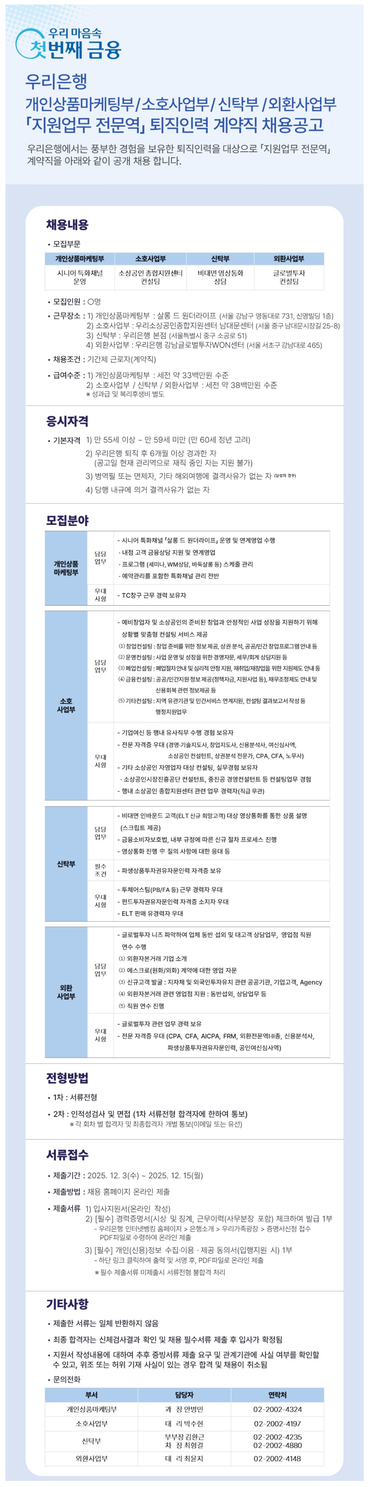 ¿ì¸®ÀºÇà °³Àλóǰ¸¶ÄÉÆÃºÎ/¼ÒÈ£»ç¾÷ºÎ/½ÅŹºÎ/¿Üȯ»ç¾÷ºÎ Áö¿ø¾÷¹« Àü¹®¿ª(ÅðÁ÷ÀηÂ) ä¿ë°ø°í