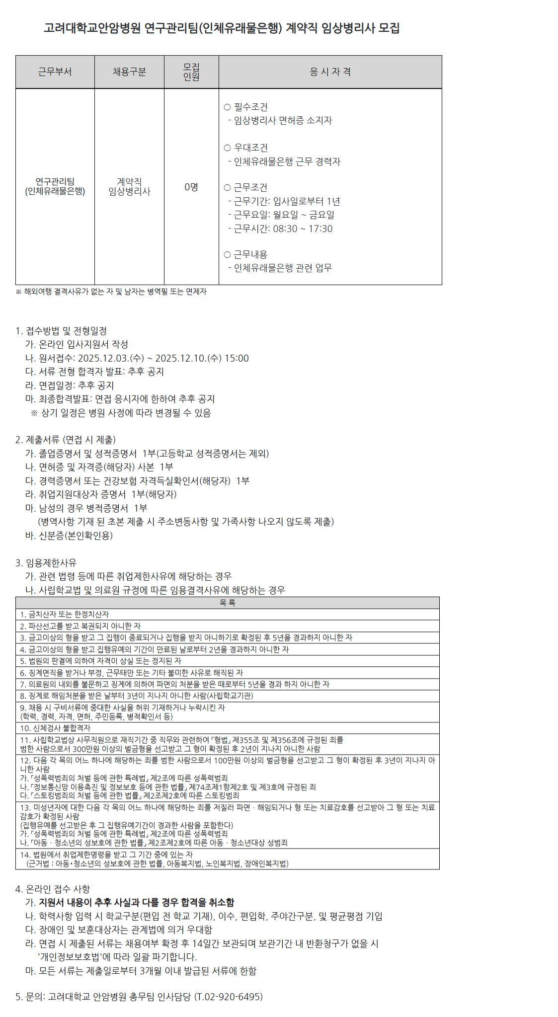 [¾È¾Ïº´¿ø 25-222]¿¬±¸°ü¸®ÆÀ(ÀÎüÀ¯·¡¹°ÀºÇà) °è¾àÁ÷ ÀÓ»óº´¸®»ç ¸ðÁý